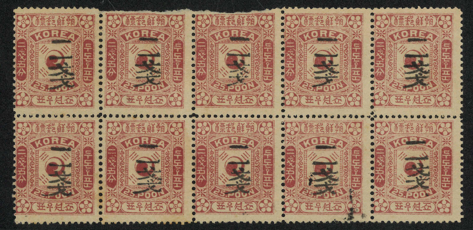 1901-1903 Taegeuk metal type surch 2 Cheon on 25 Poon in block of 10 (KPDA 29). MH. Top perf partly shortened.
