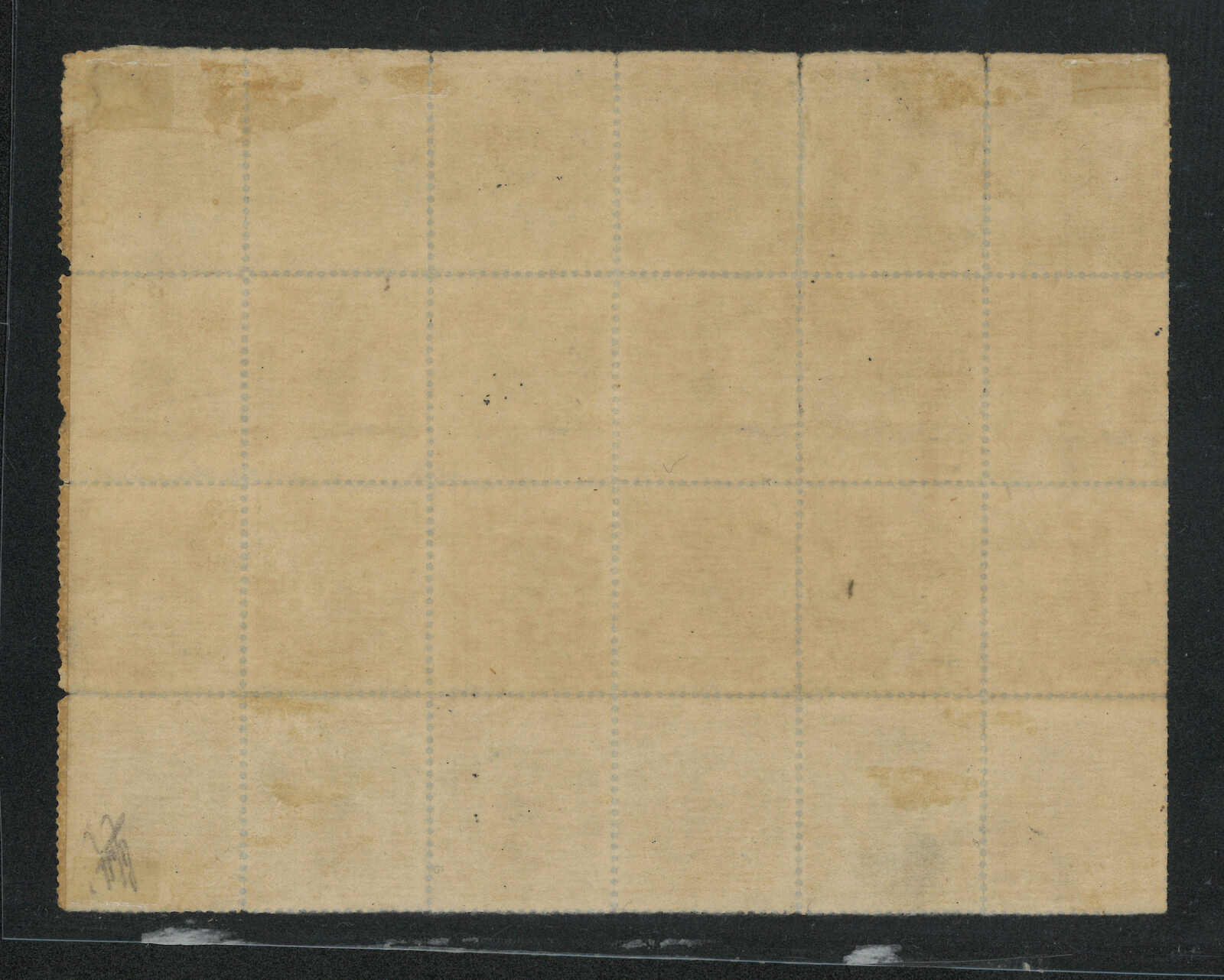 1901至1903年太極圖金屬加蓋“三錢”於5錢二十四方連(KPDA 31),銷圓形日戳,背面貼有紙張。Holcombe指此為已知最大蓋銷方連。附Peter Holcombe證書。加蓋“三錢”比“三戔”少見得多。(Image