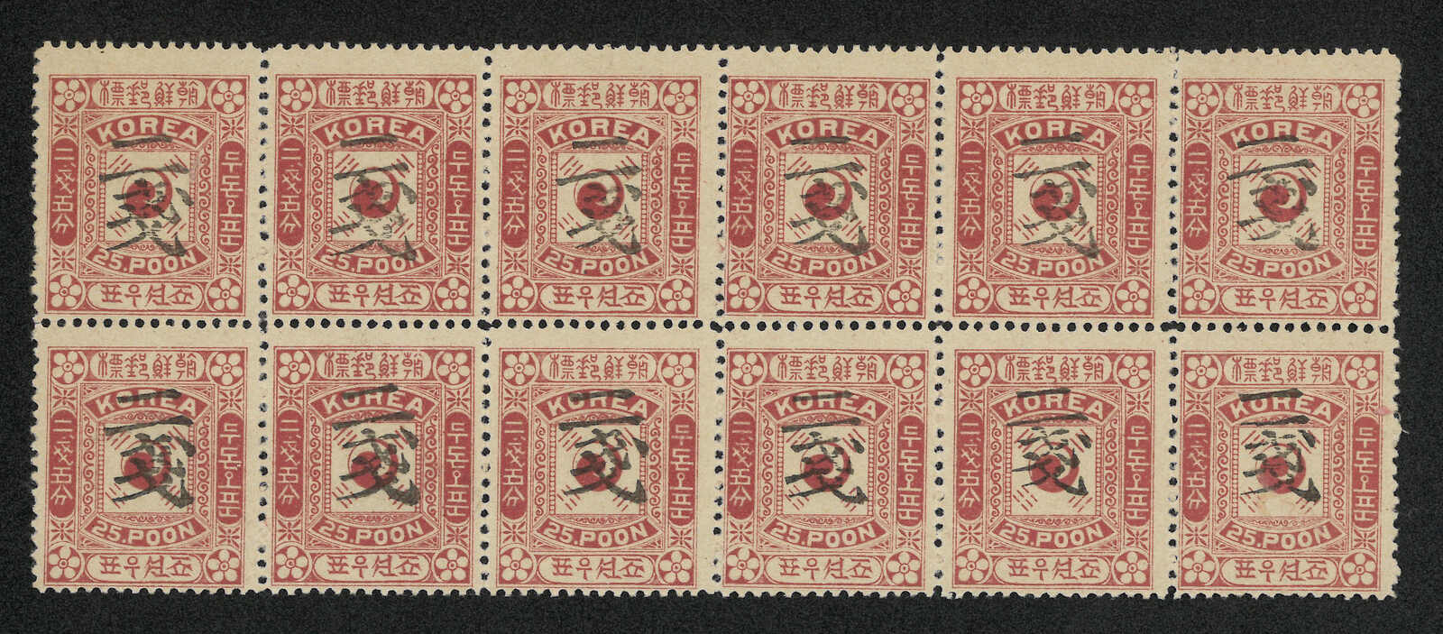 1901-1903 Taegeuk woodchop surch 2 Cheon on 25 Poon in block of 12 (KPDA 29A), MNH.