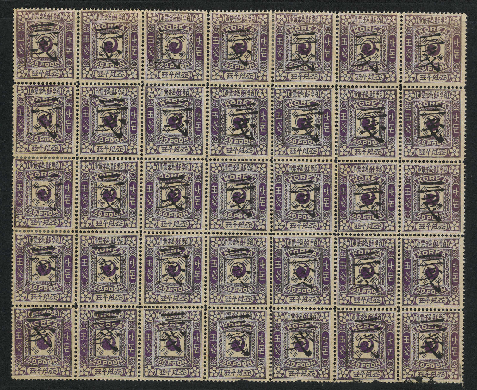 1901-1903 Taegeuk woodchop surch 3 Cheon on 50 Poon in block of 35 (KPDA 31B), MH. Perf partly split and with shortened perf.