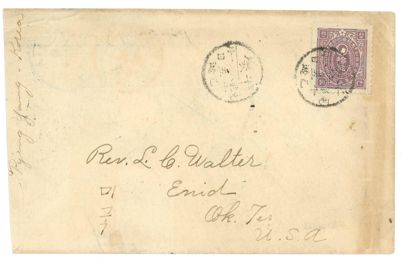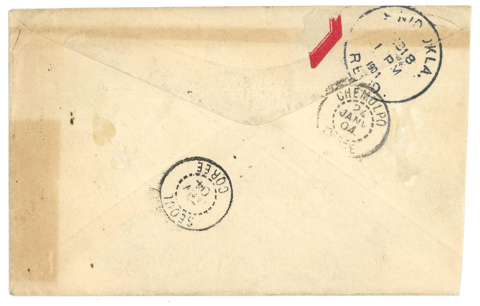 1904 Pyungyang (15 Jan) to USA, f.w. Plum-Blossoms 10c, tied by Pyungyang singled ringed cds. Transit Chemulpo (24 Jan), Seoul. Arrived USA.