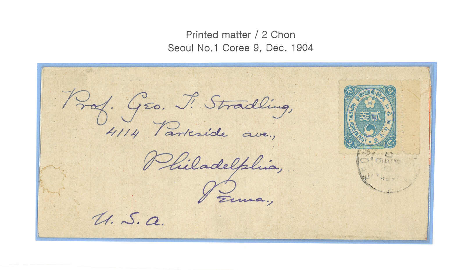 首爾寄美國。報紙包裝紙,貼梅花2錢(太極圖於面額下方),銷首爾一局法文日戳。稀罕難得之首爾一局印刷品。(Image 1)