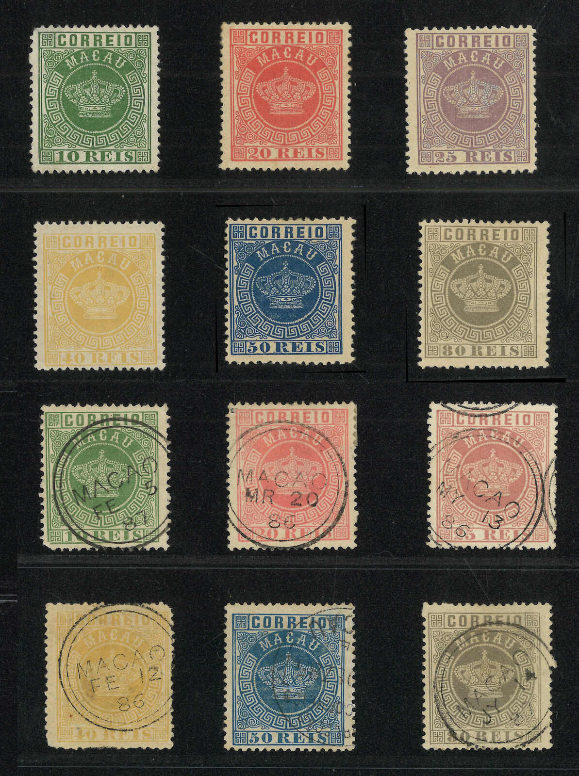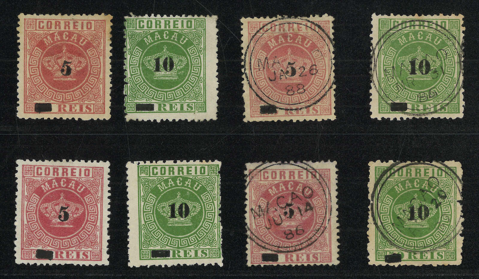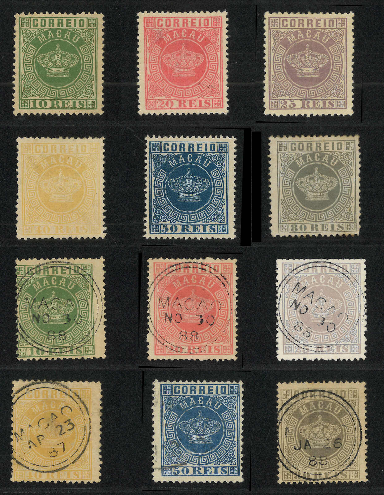 1885 Macao Crown 2nd issue mint and used complete set each x 1. Used set all tied by Macao double-ringed cds. F-VF.