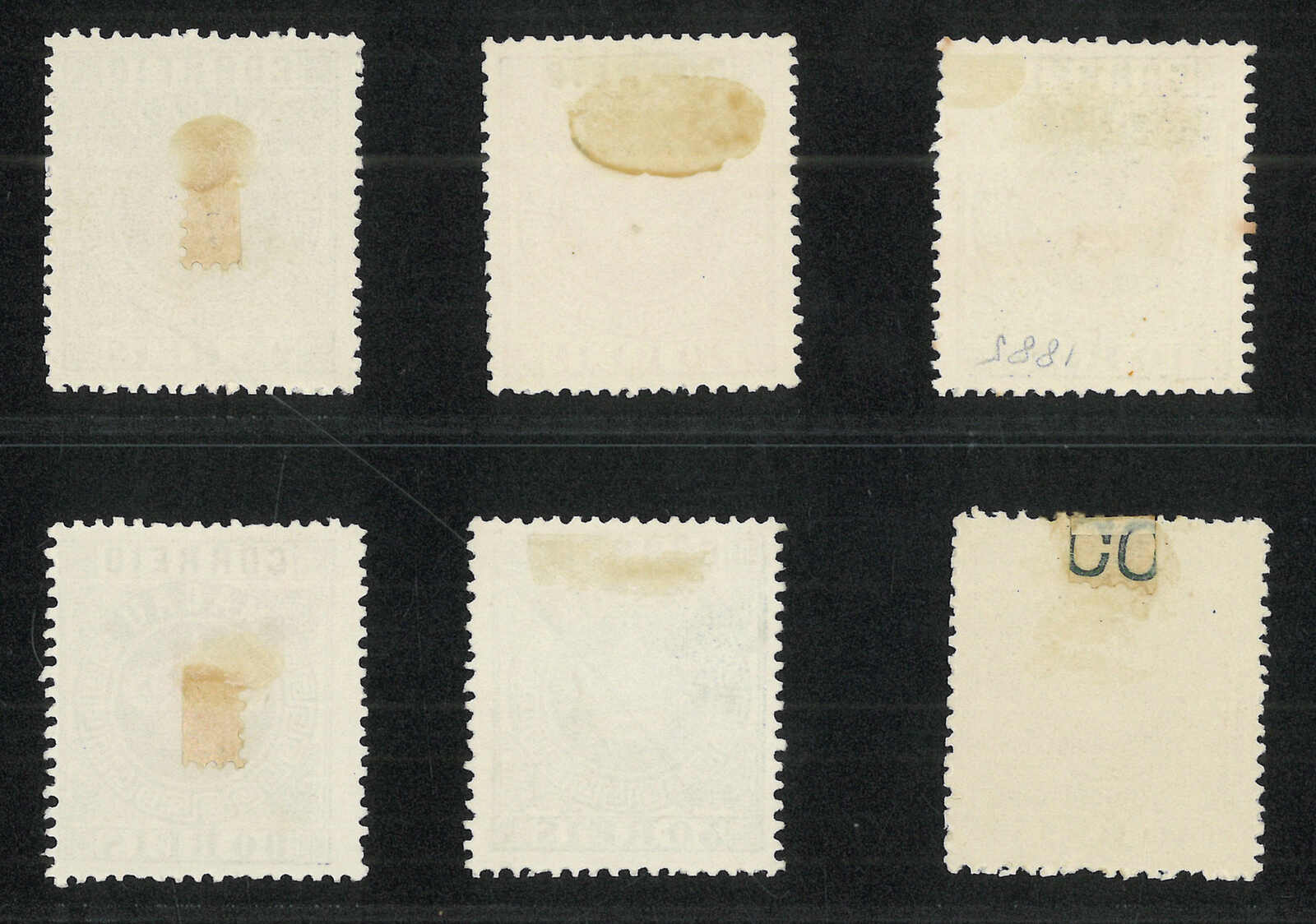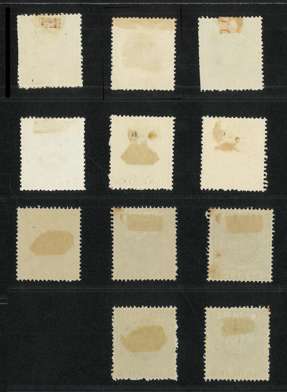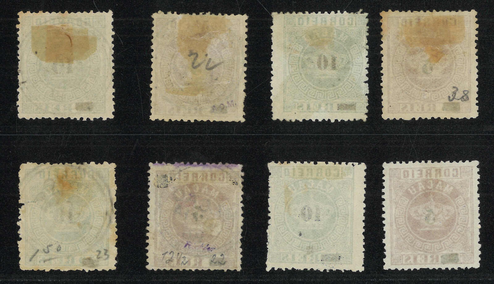 1885年澳門皇冠第二組加蓋改值票共10枚(楊目11-15),當中包括一套新全及數枚散票,展示了幼線、粗線、“s”字不連等變異。部分為舊票。背貼。(Image 1)