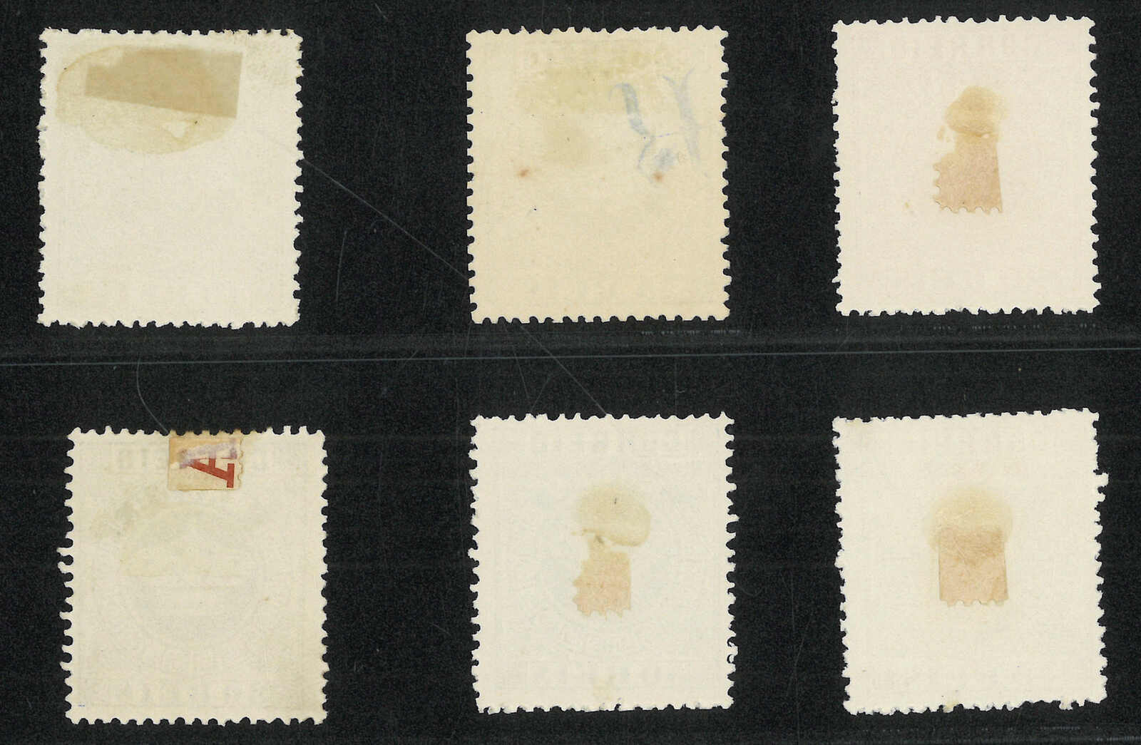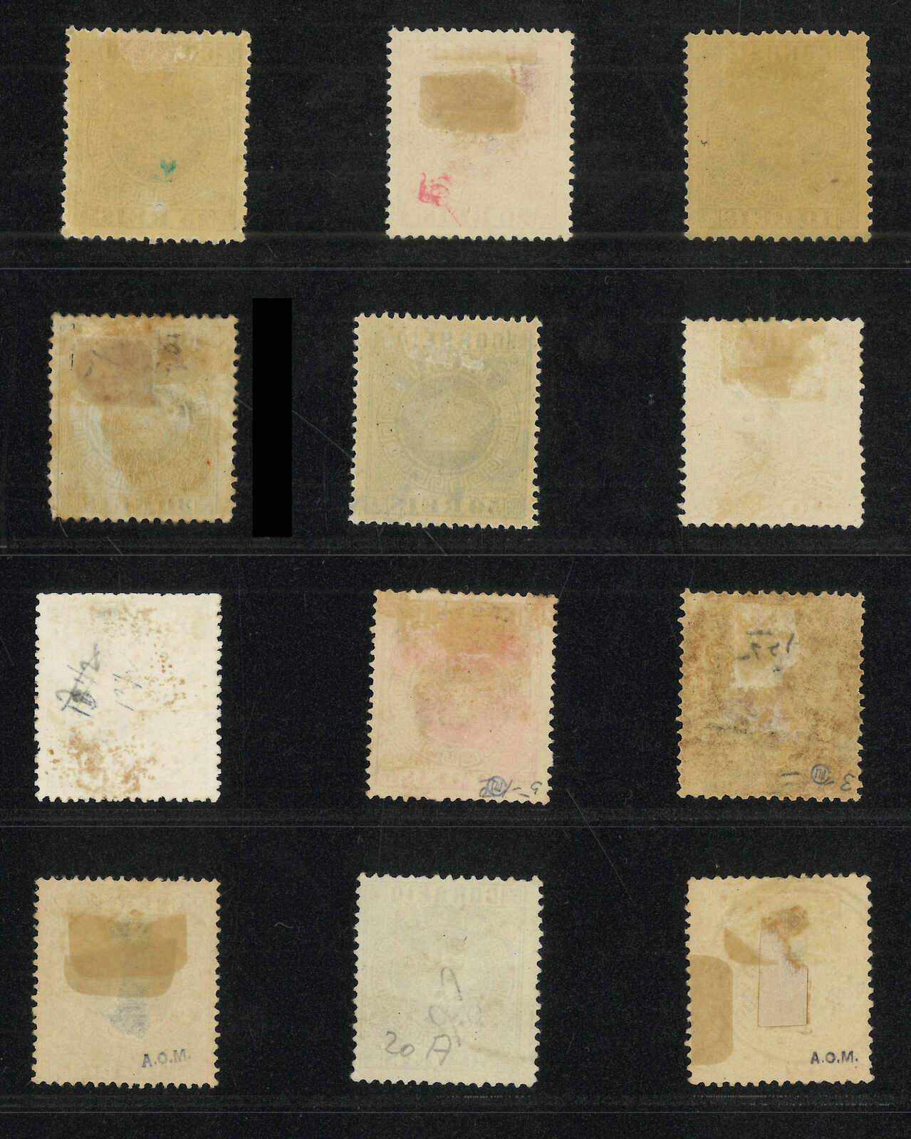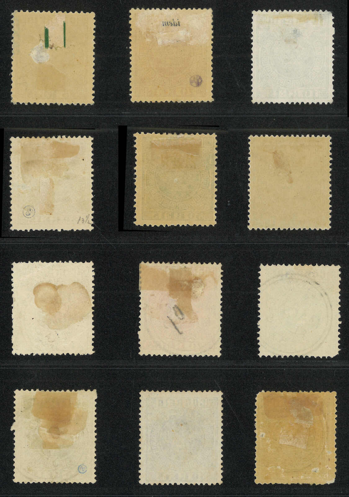 1885年澳門皇冠第二組加蓋改值票共10枚(楊目11-15),當中包括一套新全及數枚散票,展示了幼線、粗線、“s”字不連等變異。部分為舊票。背貼。(Image 1)