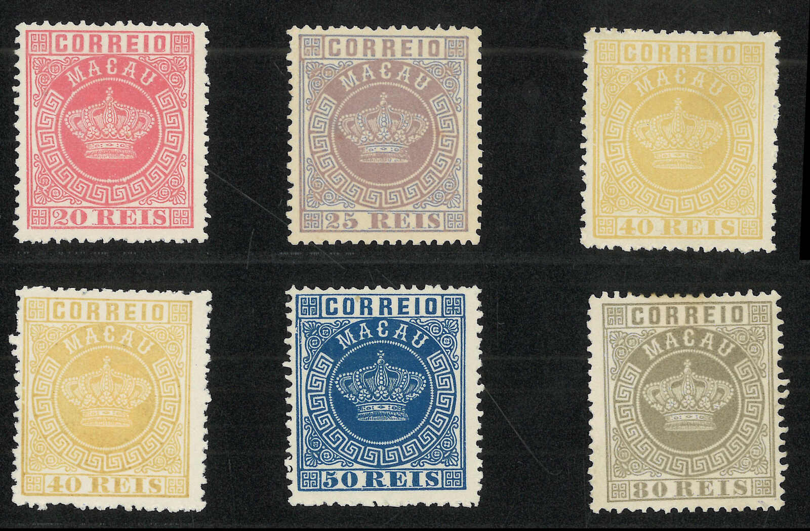 1885 Macau Crown 1st and 2nd issue re-print complete set. MNH. F-VF. In 1885, to commemorate the 3rd UPU Congress in Lisbon, 500 sets of Crown issues were re-printed to be the gift for UPU members. Only a few of them are in the