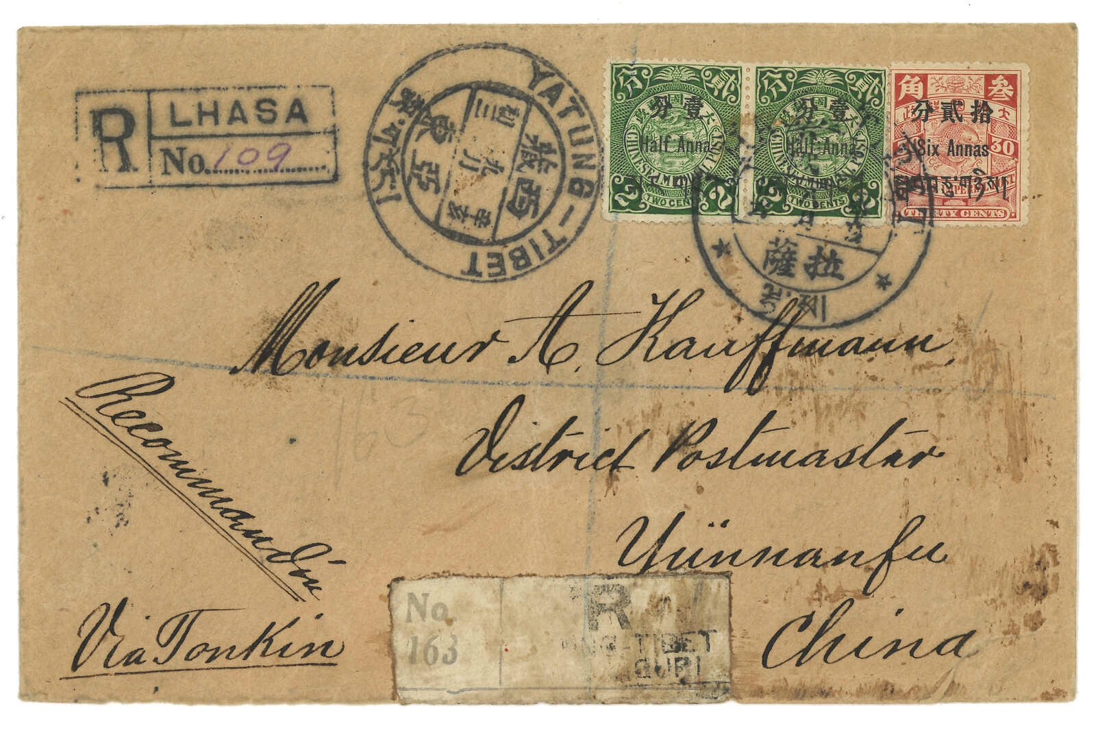 1911 Lhasa (17 Oct) to Yunnanfu Postmaster. Registered cover, f.w. Coiling Dragon Tibet surch 1/2a in pair + 6a, tied by Lhasa dollar chop (type C4 with serif). Transit Yatung (24 Oct) with dollar chop. In combination with
