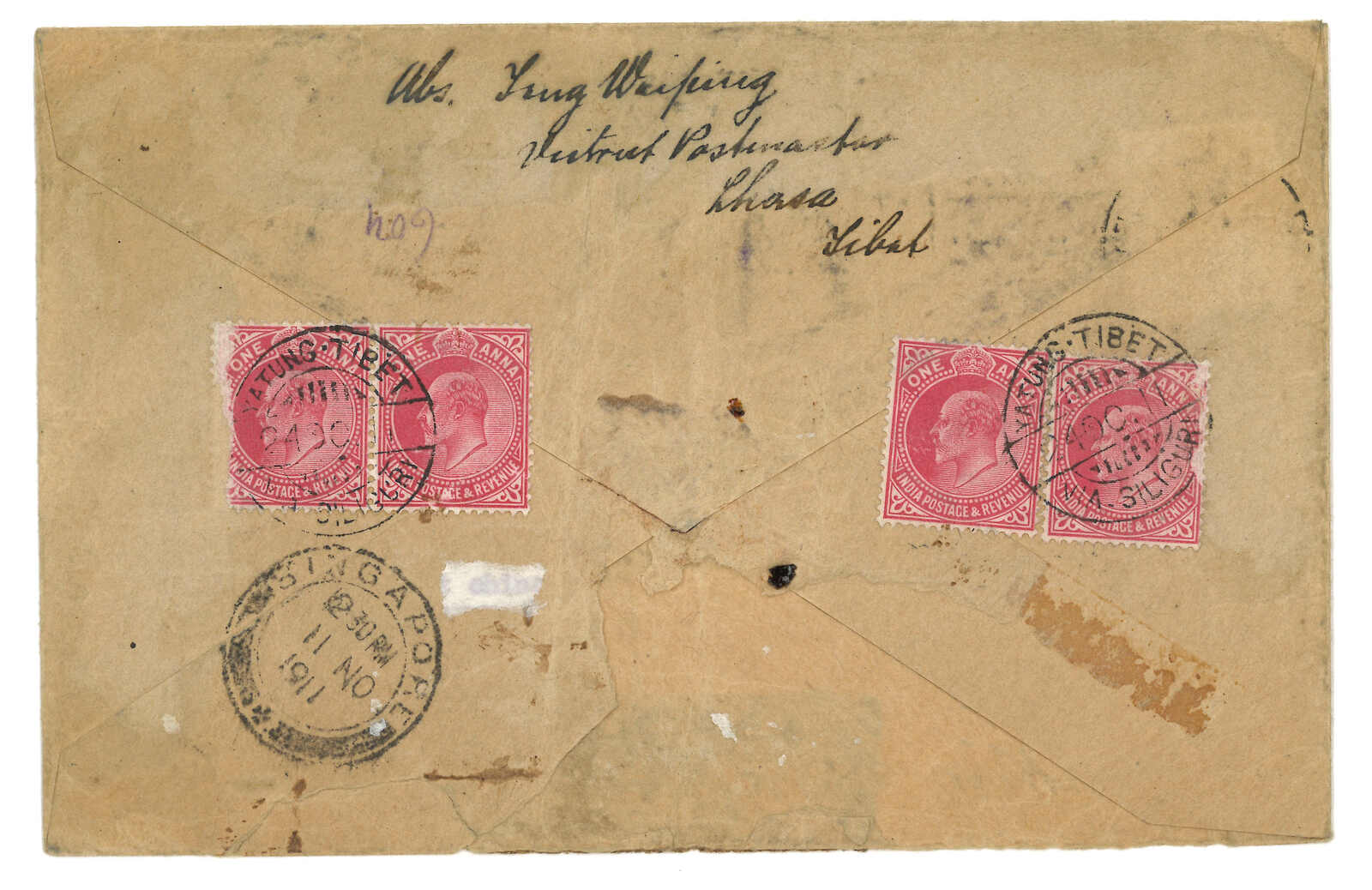 Indian KEVII 4x 1a on reverse, tied by Yatung (24 Oct) cds, matching with type YB Yatung-Tibet registerd label on front. Transit Singapore (11 Nov).