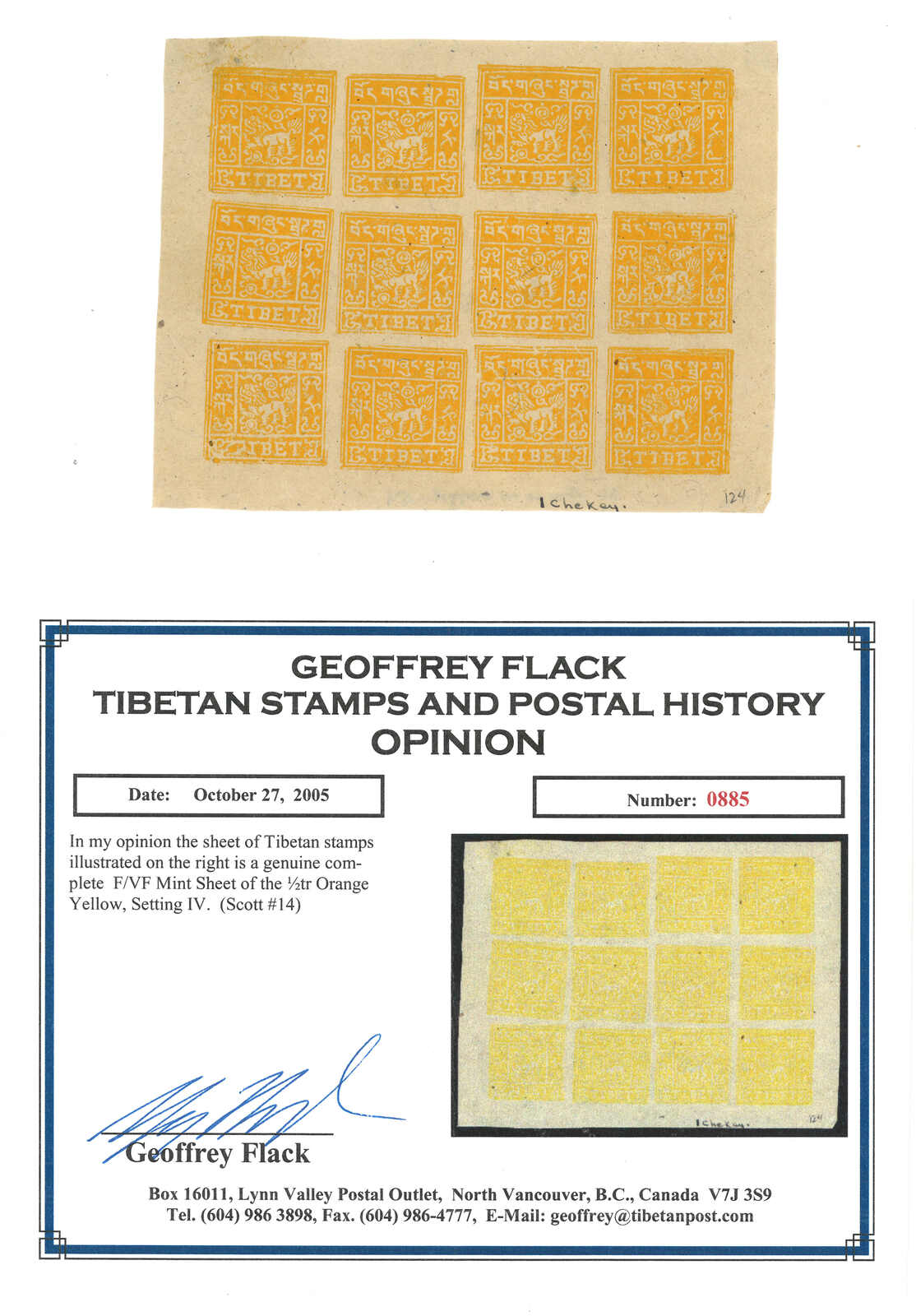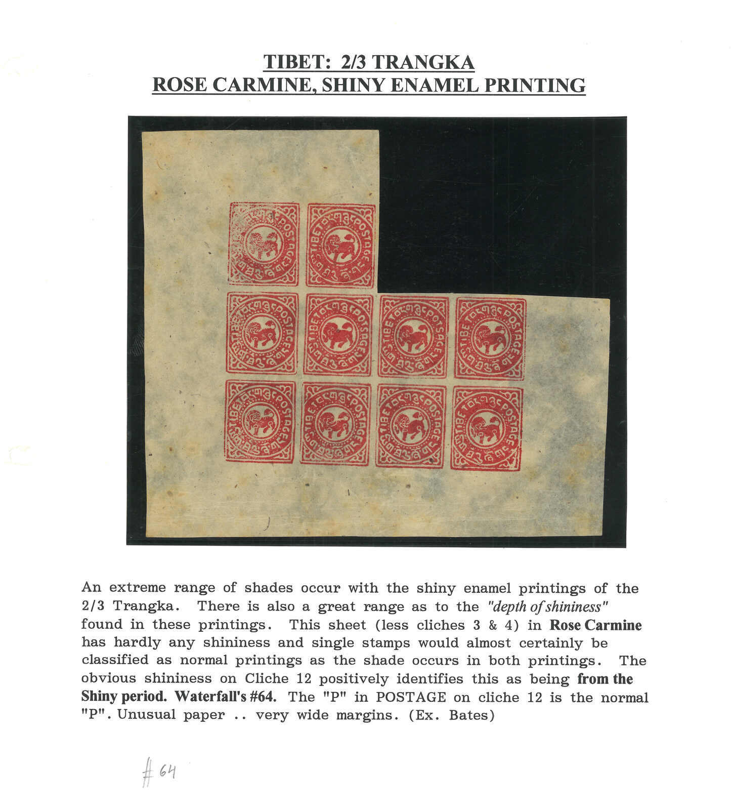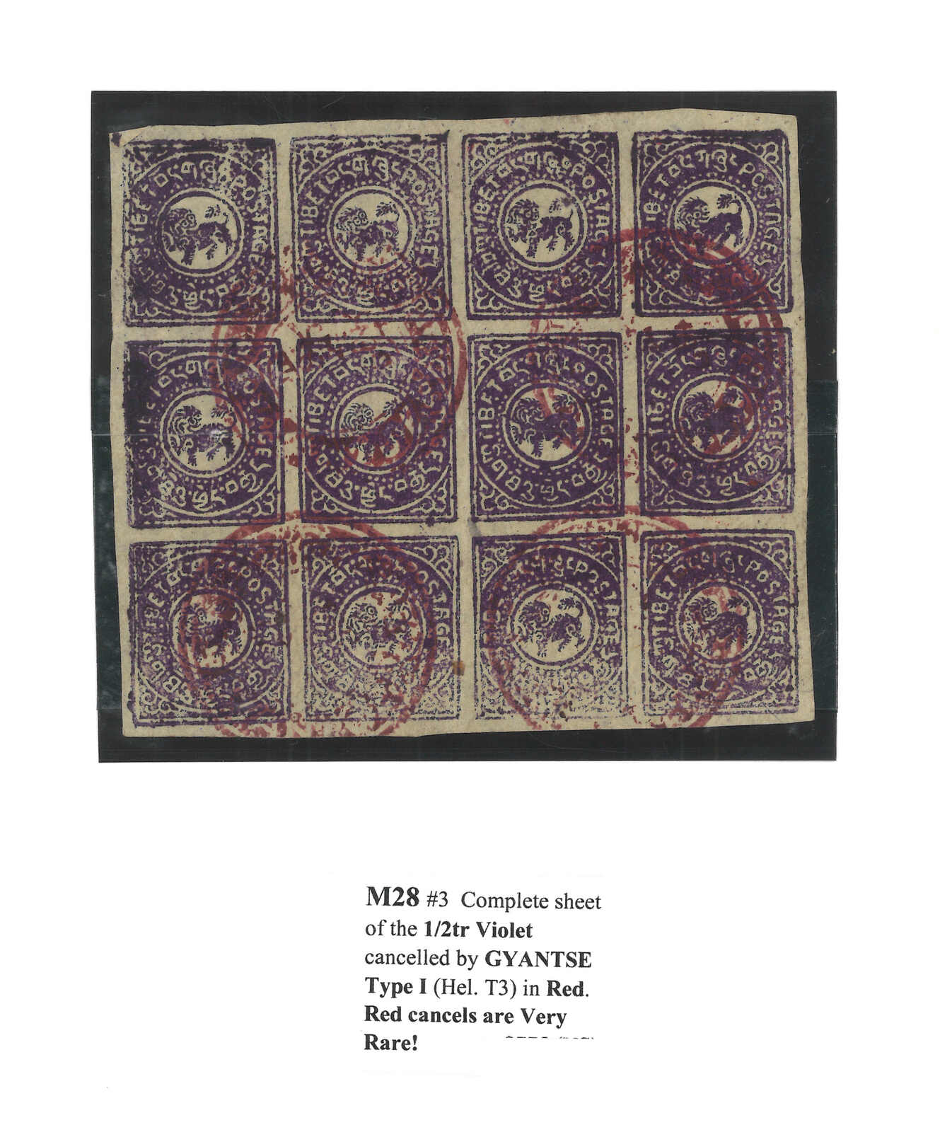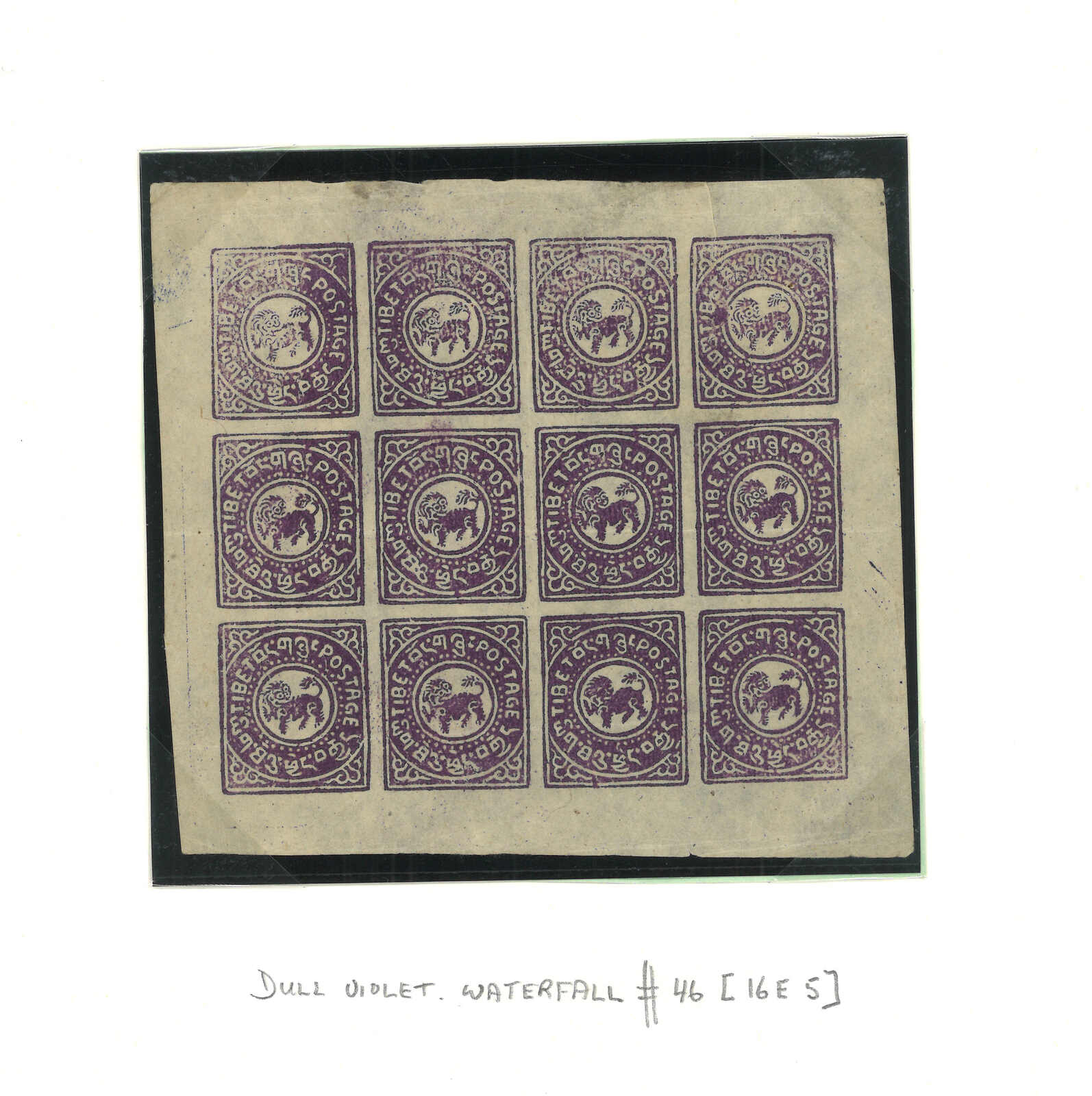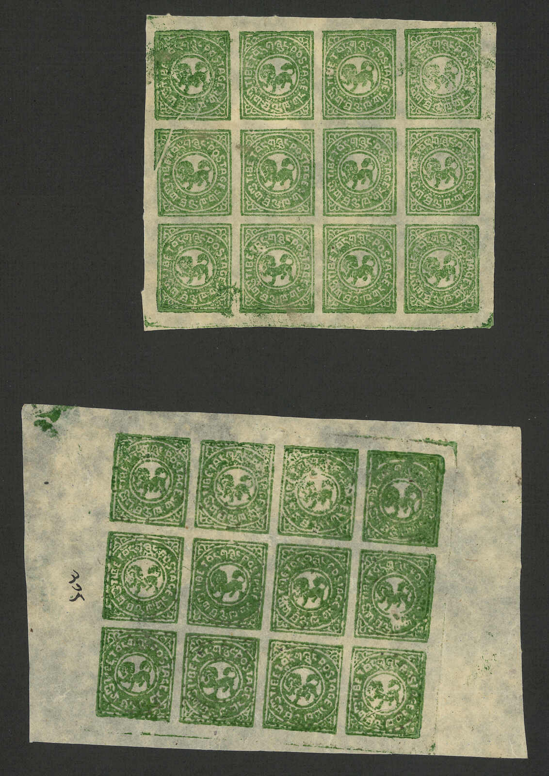 一組1912年西藏第一版半章噶集藏,包括12件單枚、連票及版票。當中數件屬於珍罕之有光墨。展示了不同刷色。除一版版票蓋銷外,均為新。(Image 1)