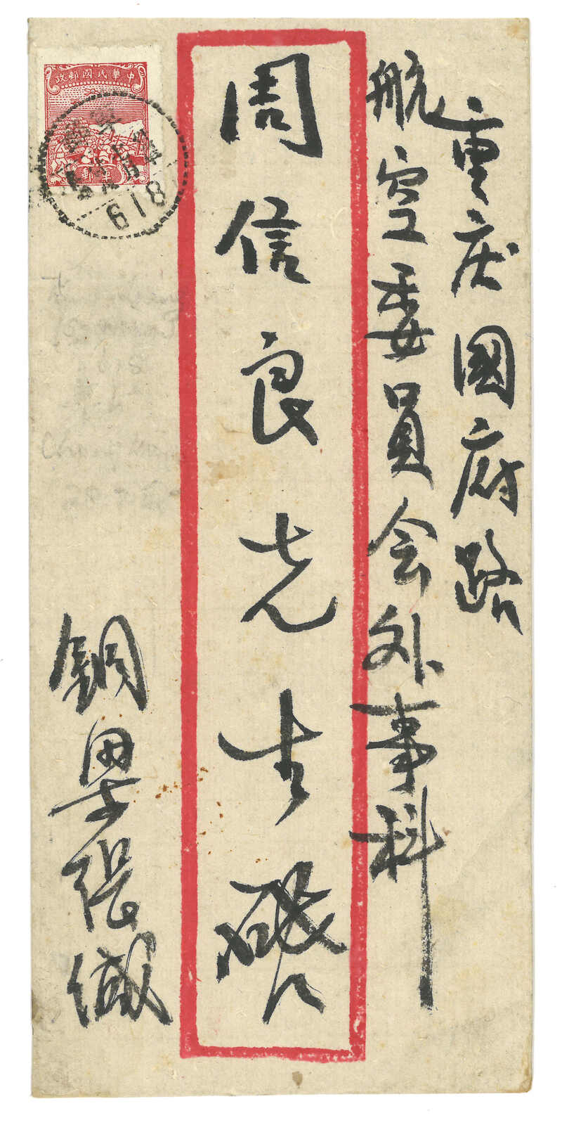軍郵封寄重慶,貼中信版軍郵票,銷軍郵618局三格點線日戳。由於幣值不穩,故當時發行了無面值軍郵票。(Image 1)