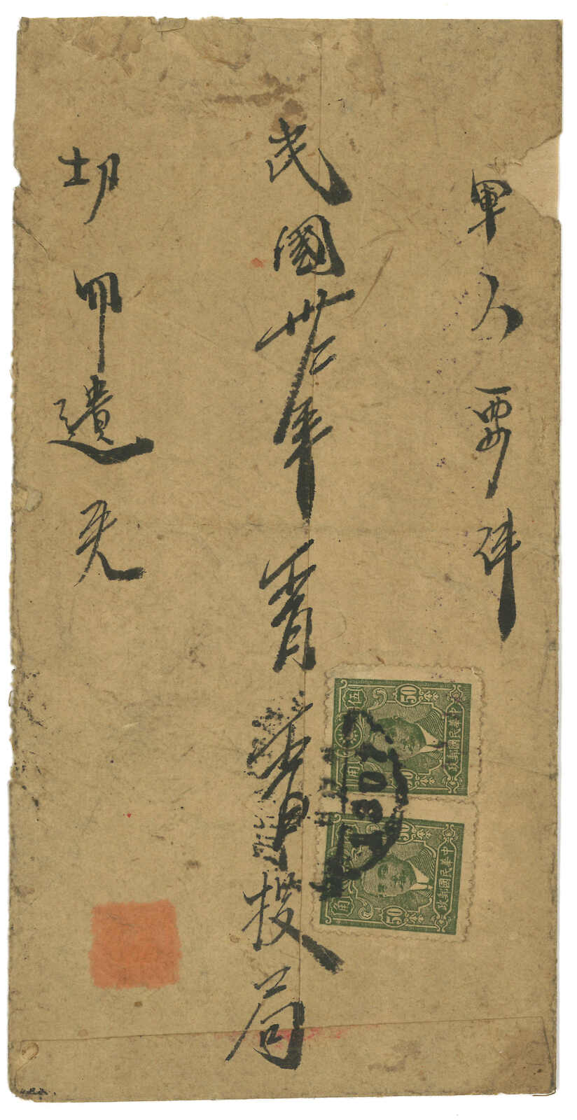 1945 (12 Nov) double-registered express military cover from Santai to Hochwan, f.w. Postal Saving $50 in pair on reverse, tied by West Szechuan Santai cds. On front with "Military Family Letter" circular seal in red. Arrived