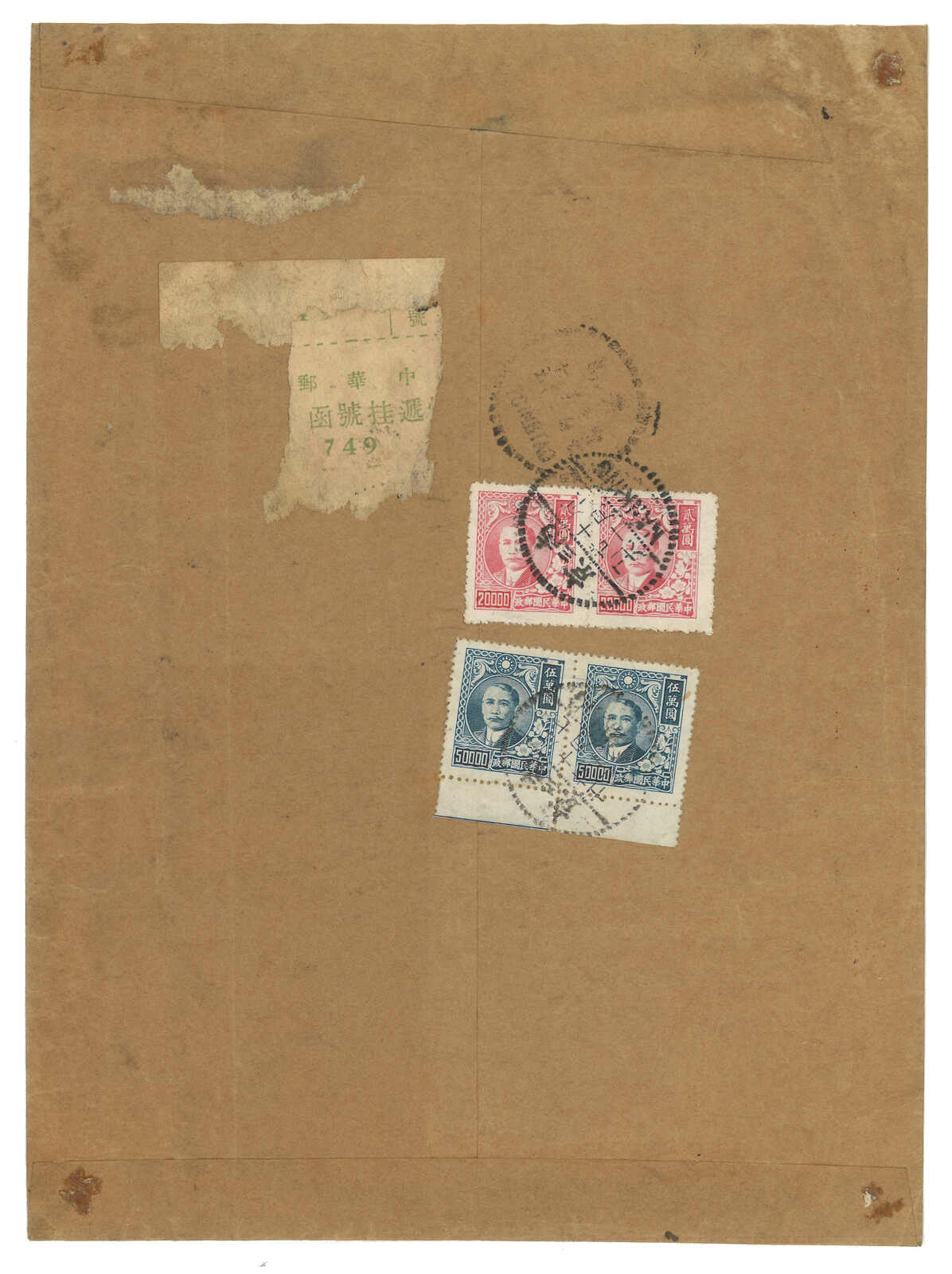 1948 (21 Oct) Joint Logistics Headquarter official cover from Nanking to Tsingtau, f.w. Shanghai Dah Tung Print SYS $20000 in pair + $50000 in pair, tied by Nanking bilingual cds. On front with "Military Air Express Mail"