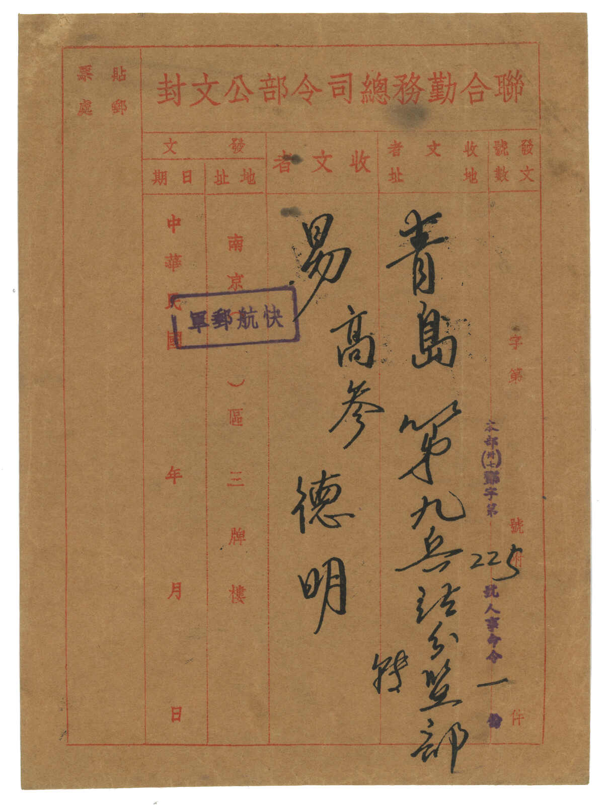 1948.10.21 聯合勤務總司令部公文封自南京寄青島,背貼上海大東版孫像2萬元雙連 + 5萬元雙連,銷南京三格漢英日戳。正鈐“軍郵航快”橫戳。(Image 1)