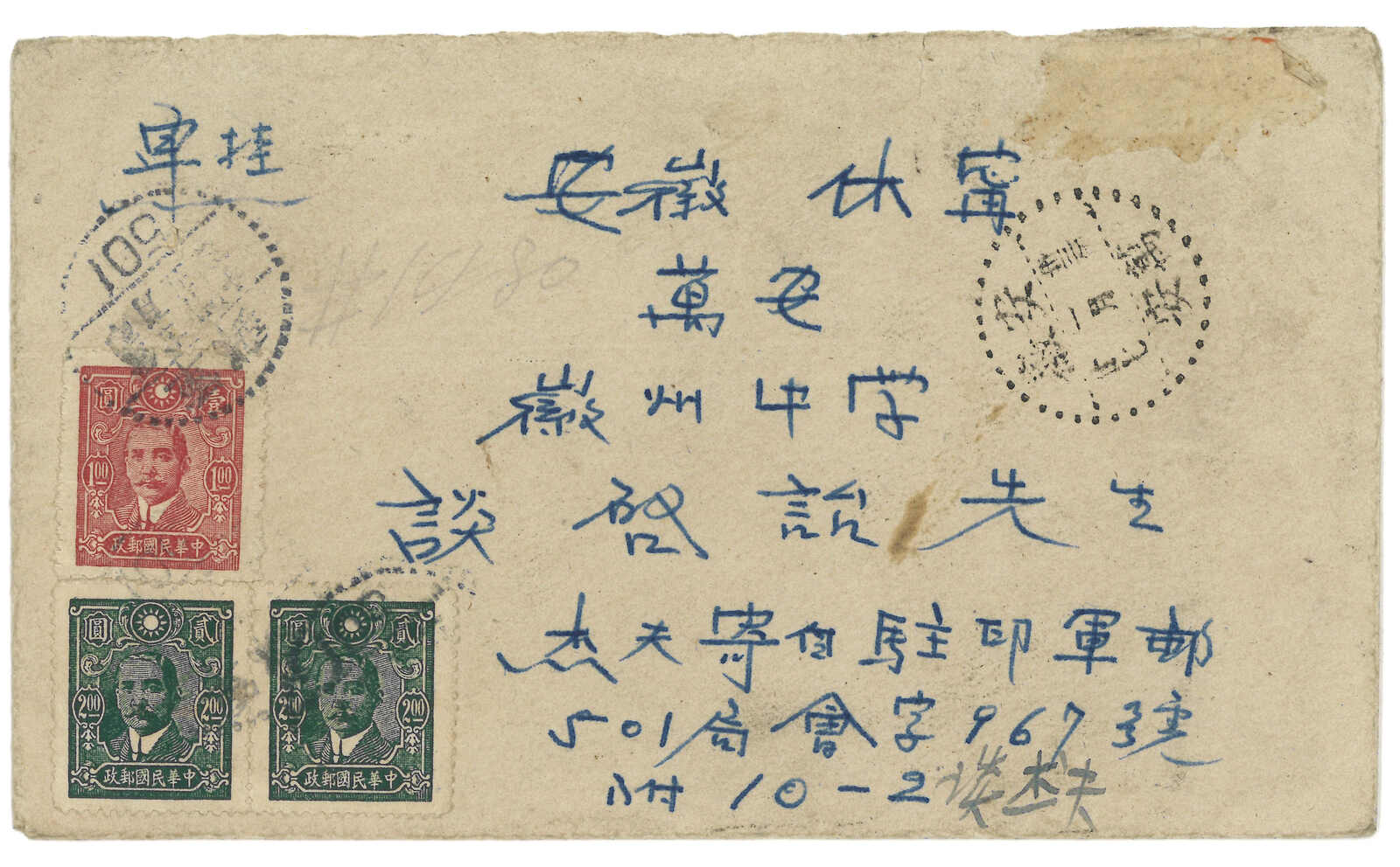 軍郵封自印度寄萬安,貼中信版孫像1元 + 2元x2,銷軍郵501局三格點線日戳。背鈐“查訖”圓戳。1.27抵萬安。此軍郵局位於印度。(Image 1)