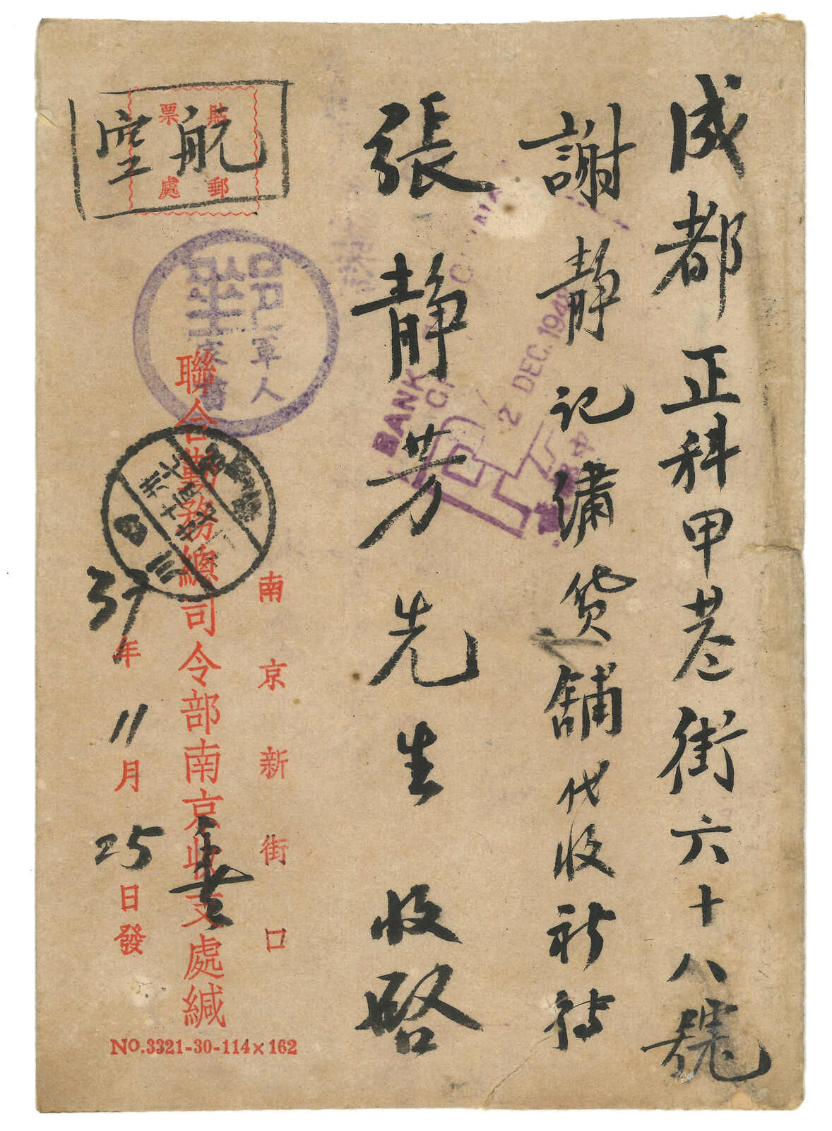 1948 (25 Nov) military cover from Joint Logistics Headquarter, Nanking to Chengtu, f.w. CK Chunghwa Print SYS $2 on reverse, tied by Nanking bilingual cds., along with "Military Family Letter" circular seal in blue and airmail