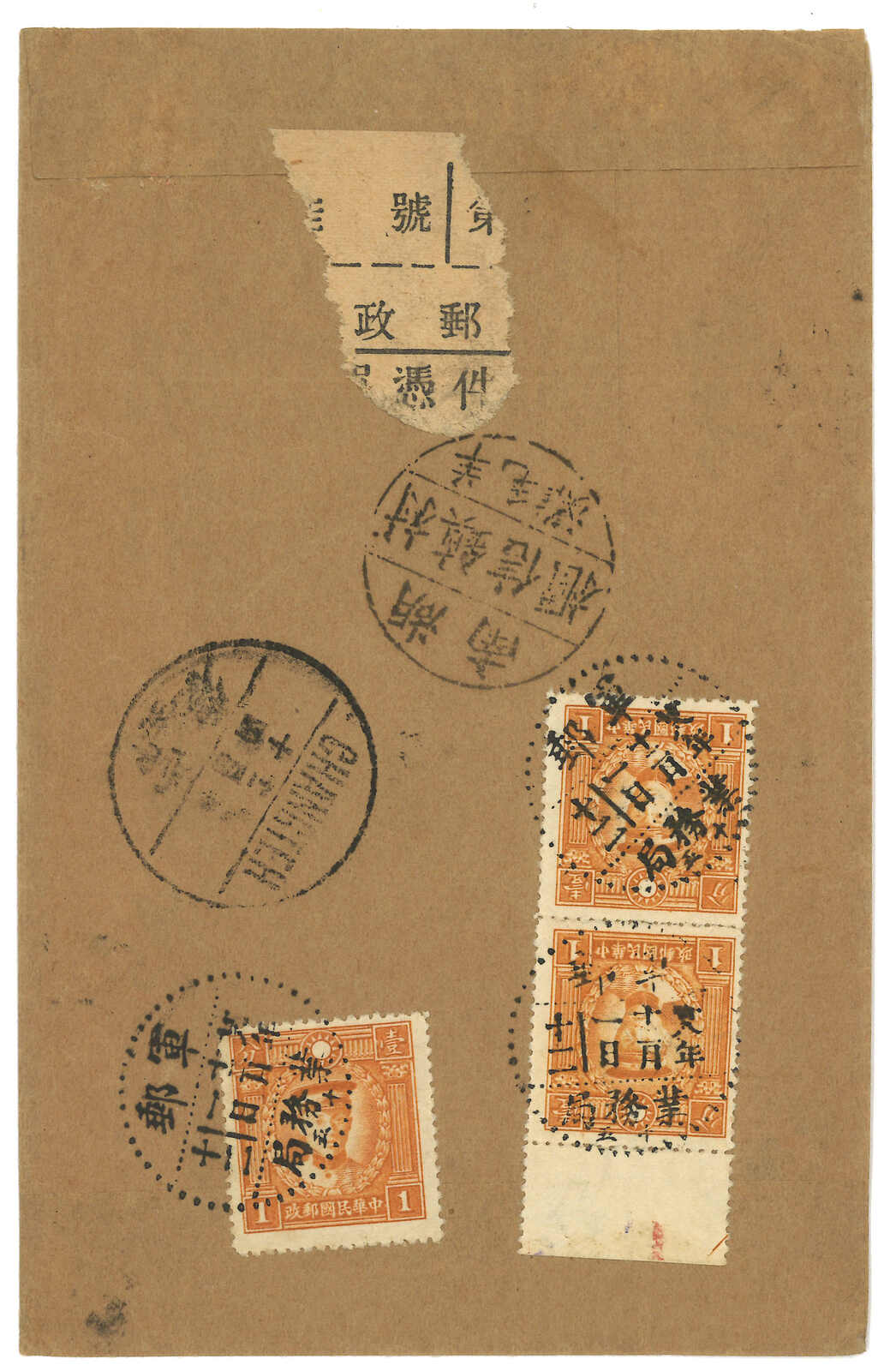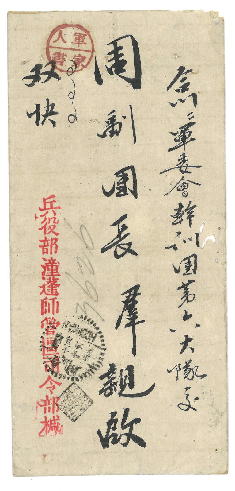 1939 (1 Dec) Military cover to Changteh, f.w. Martyrs 1c x3 + SYS 5c x2 on reverse, in total of 13c, tied by Military PO No. 15 cds. Transit Changteh (14 Dec). Arrived with "Hunan / Yangmaotan / Village Mail Box" circular seal.