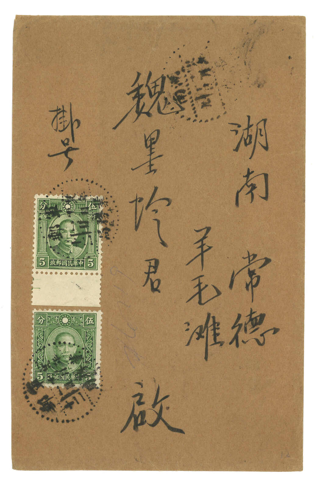 1939.12.1 軍郵封寄常德,正背貼烈士1分x3 + 孫像5分x2,合1角3分,銷軍郵業務局(十五)三格點線日戳。12.14經常德。抵達後鈐“湖南羊毛灘村鎮信櫃”圓戳。張愷升記錄軍郵業務局日戳使用至1940年。(Image 1)