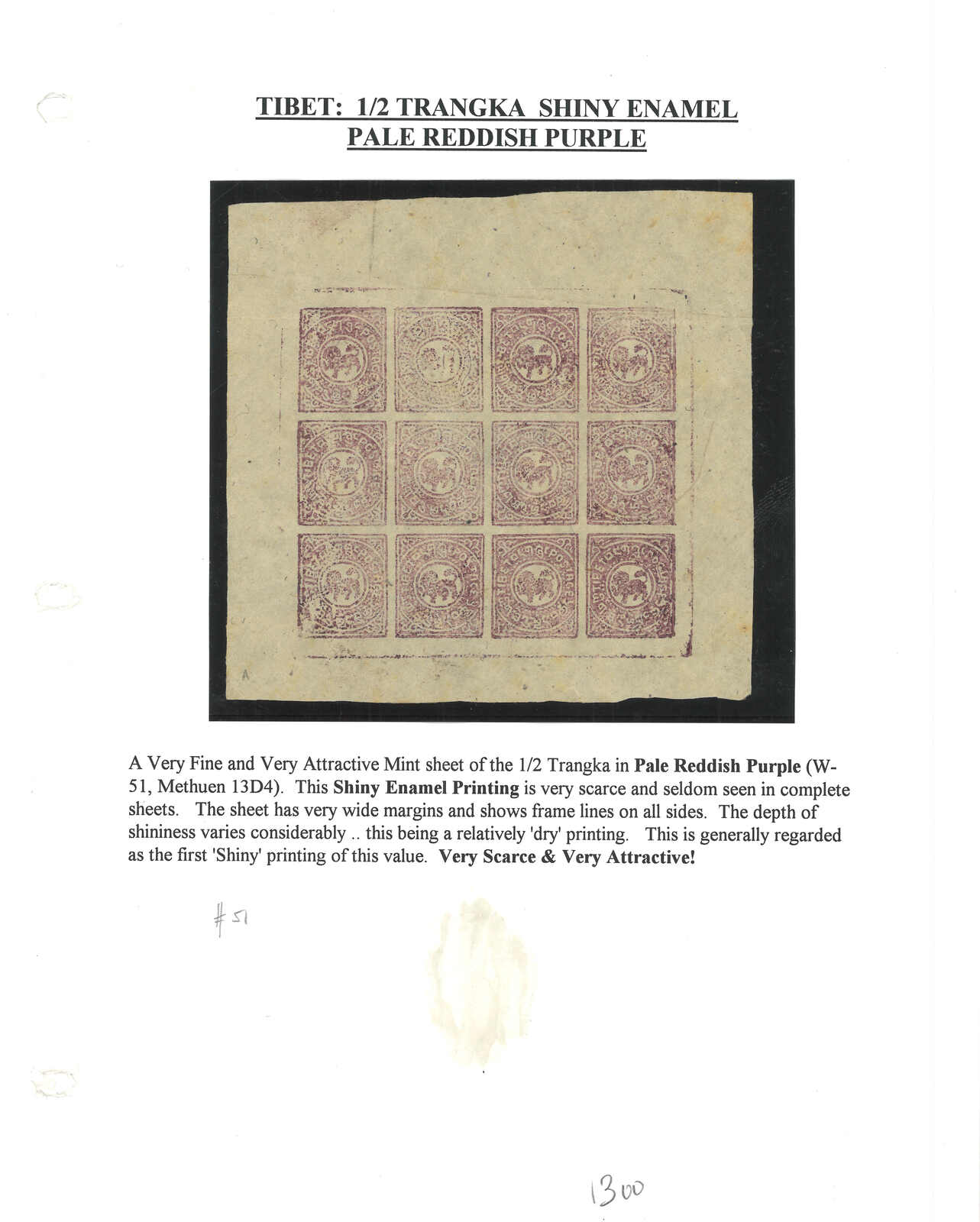 A collection of 1912 Tibet 1st issue 1/2tr, containing 12 singles, multiples and complete sheets in which several belong to the scarce shiny enamel. Showcasing various shades. Except one sheet of 12 CTO, all mint.