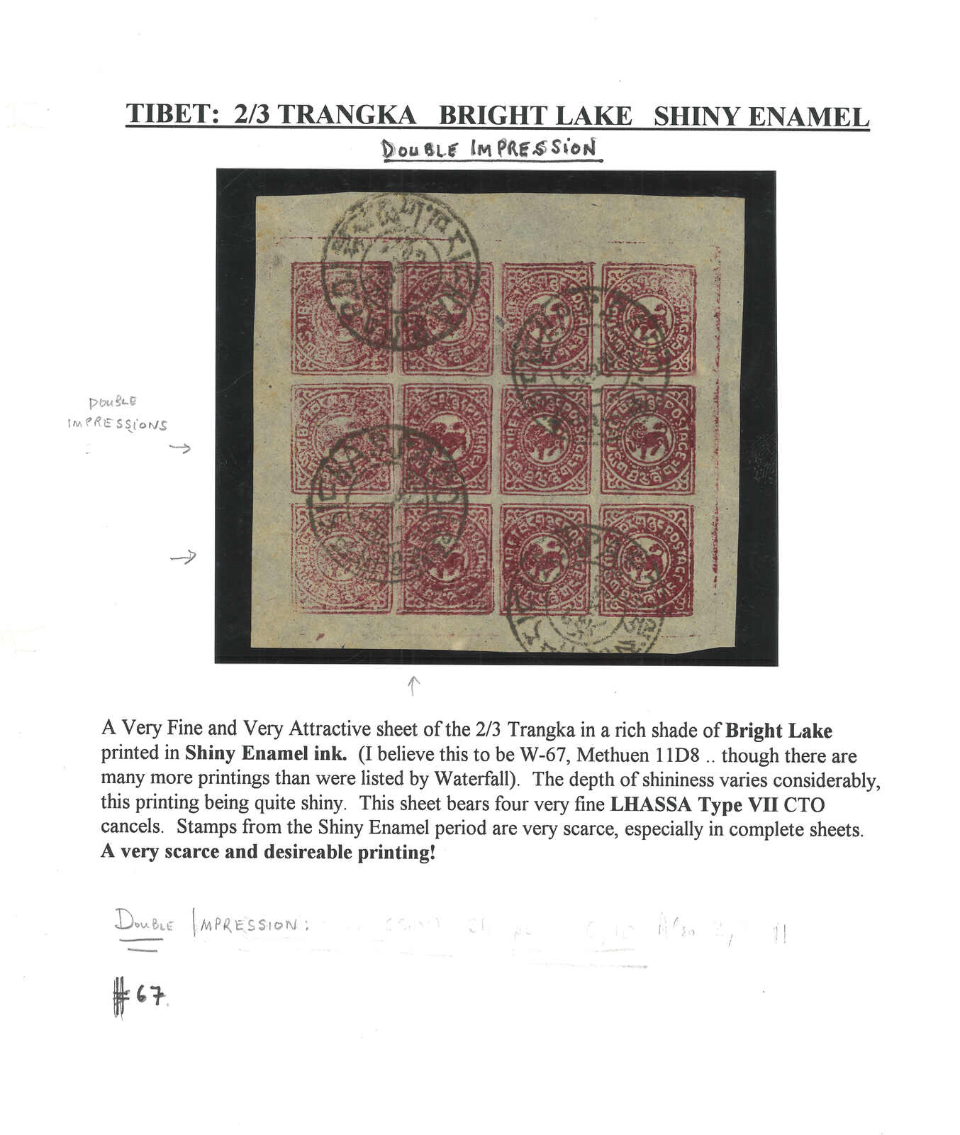 A collection of 1912 Tibet 1st issue 2/3tr, containing 11 singles, multiple and complete sheets. One complete sheet showing interesting “POTSAGE” instead of “POSTAGE” at cliché 6 and 7 while another CTO sheet showing double