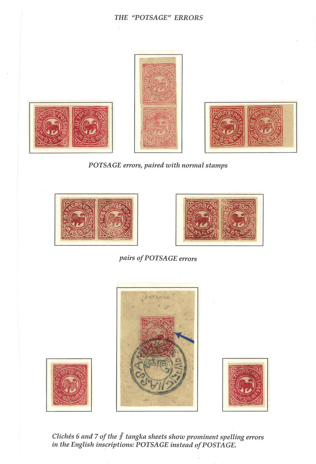 一組1912年西藏第一版2/3章噶集藏,包括11件單枚、連票及版票。當中一版於第6及第7子模帶有“POTSAGE”而非“POSTAGE”變異。另一蓋銷版票則帶有複印變異。十分精彩。大多為新。(Image 1)