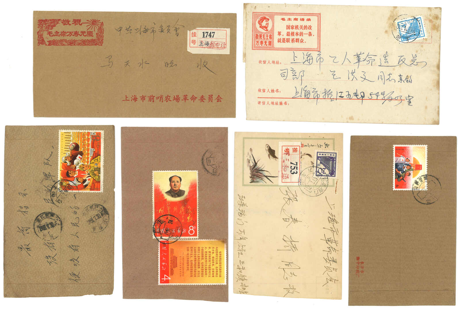 1960年代一組十件文革時期實寄封及剪片,貼文2、文4、文7及其他紀、編號、T及普票,大多帶毛語錄。一件寄張春橋。(Image 1)
