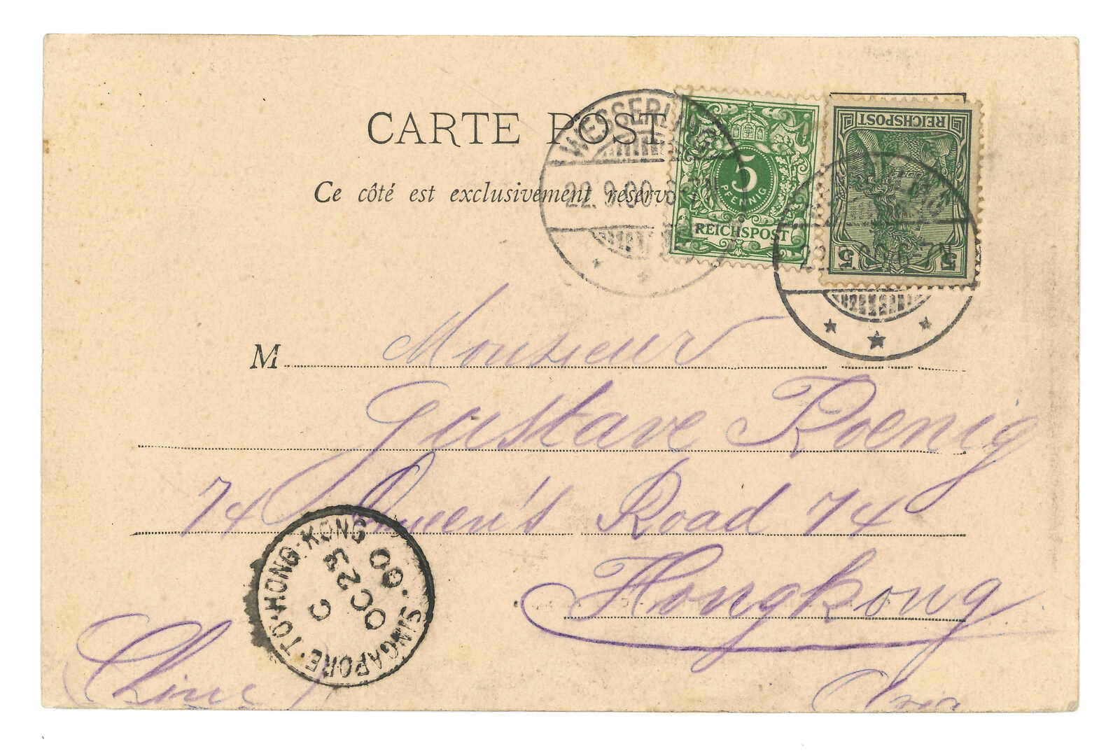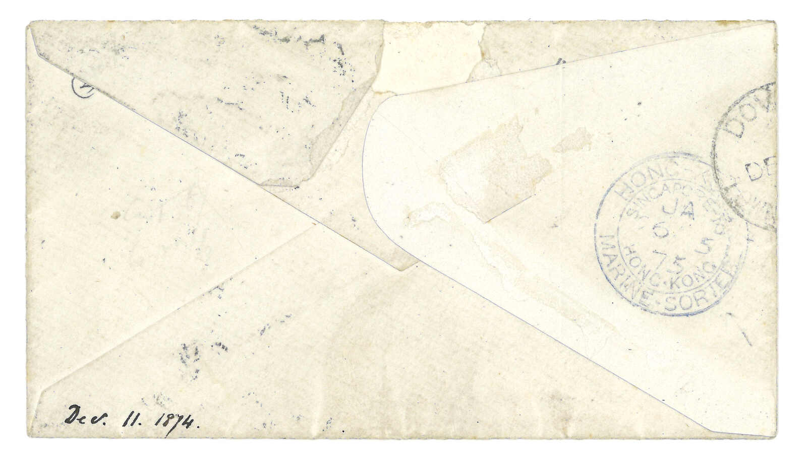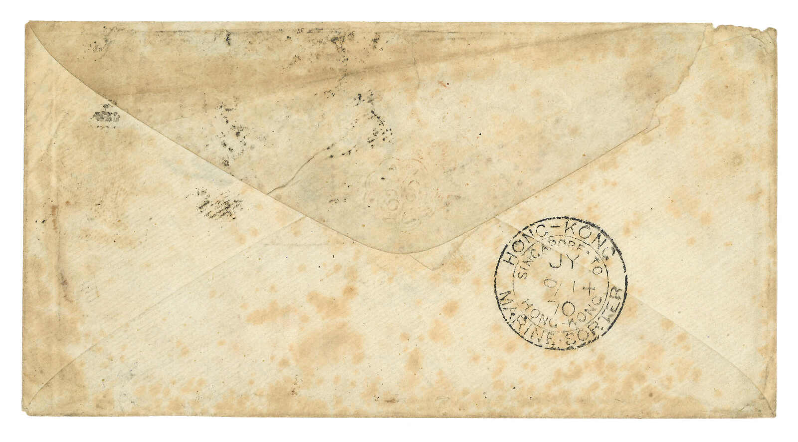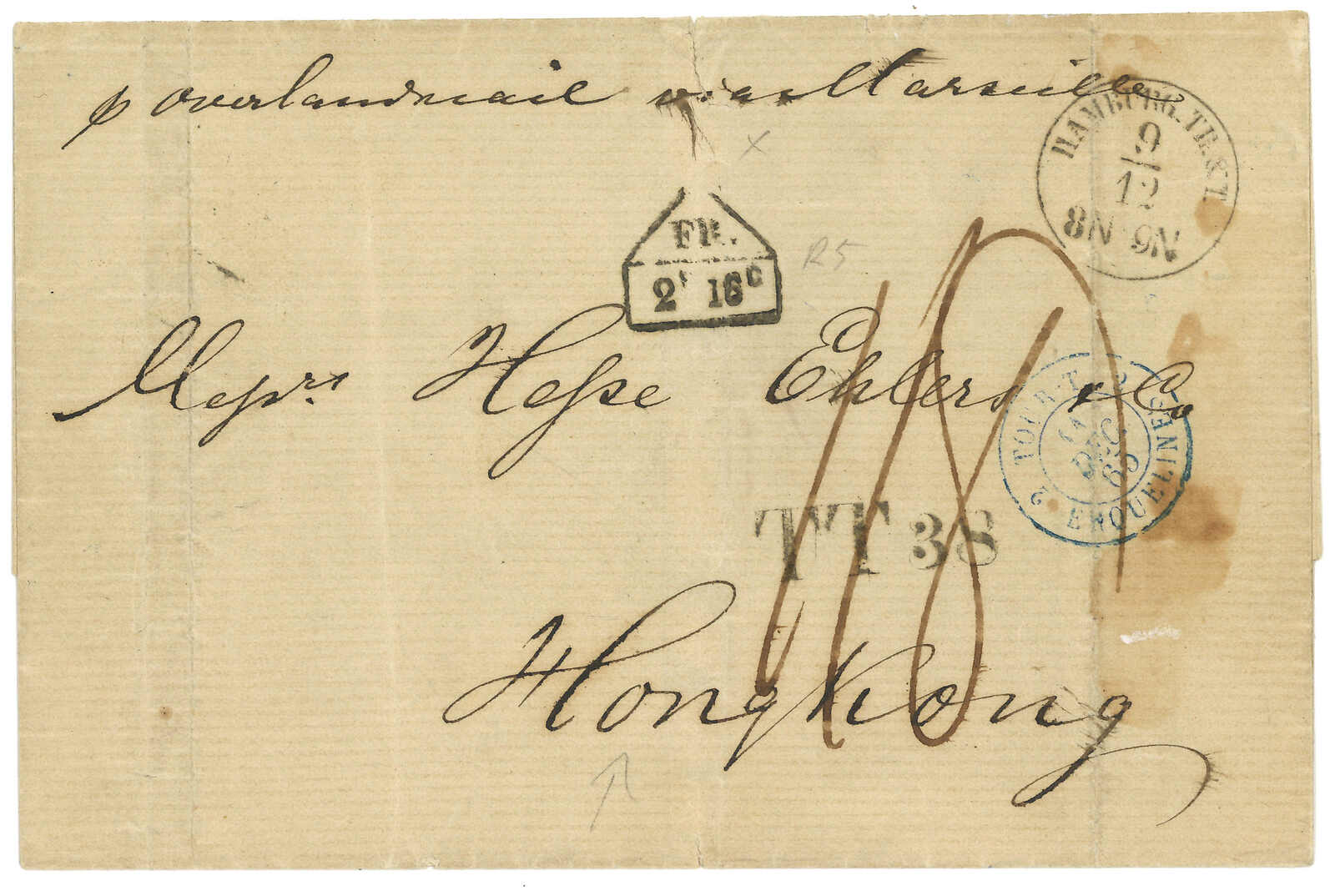 1870-1900s a group of 18 incoming covers and postcards to Hong Kong, most originating from England and France, showcasing various franking and postmarks such as Singapaore to Hong Kong marine sorters. Please view.