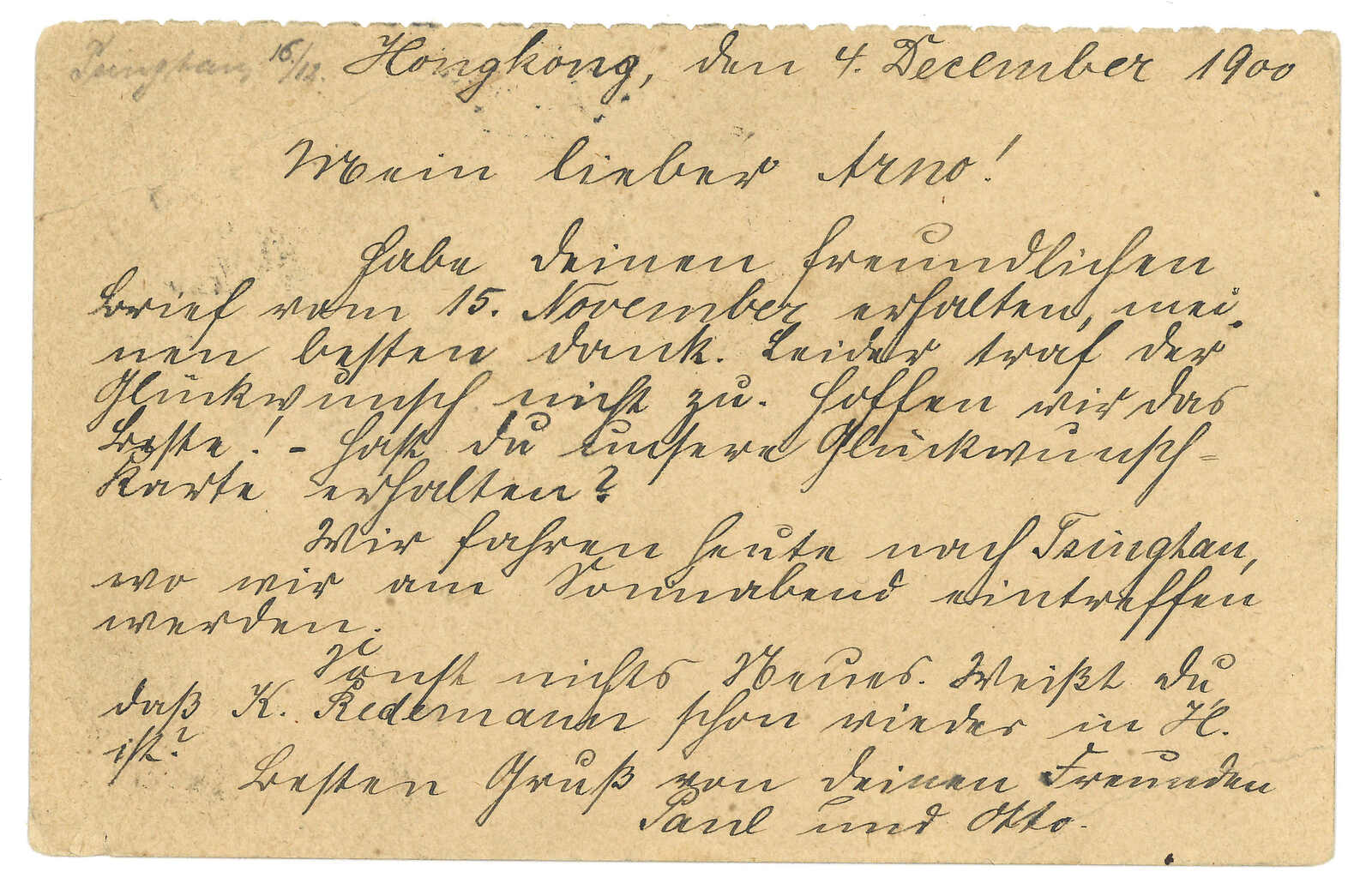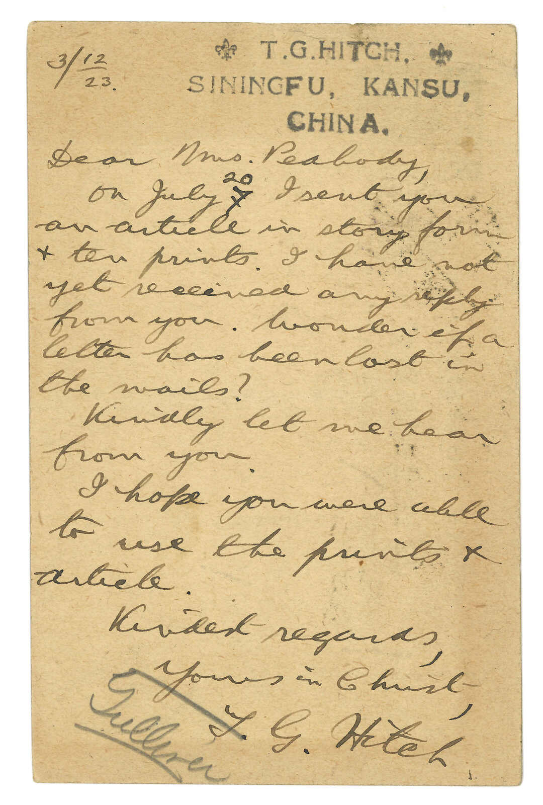 1914 PC written at the shore of Kokonor (10 Sept), mailed in Sining (5 Dec), to England. Interesting content: Heartiest greeting to you all from the shore of this great inland Blue Sea….. 1000’s of sheep, yaks & horses are