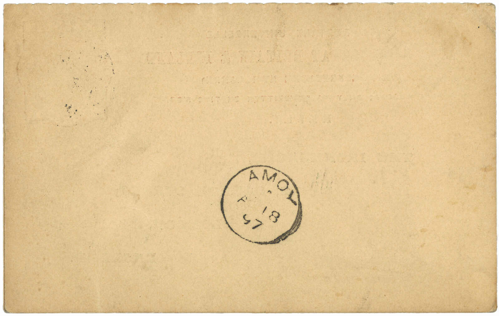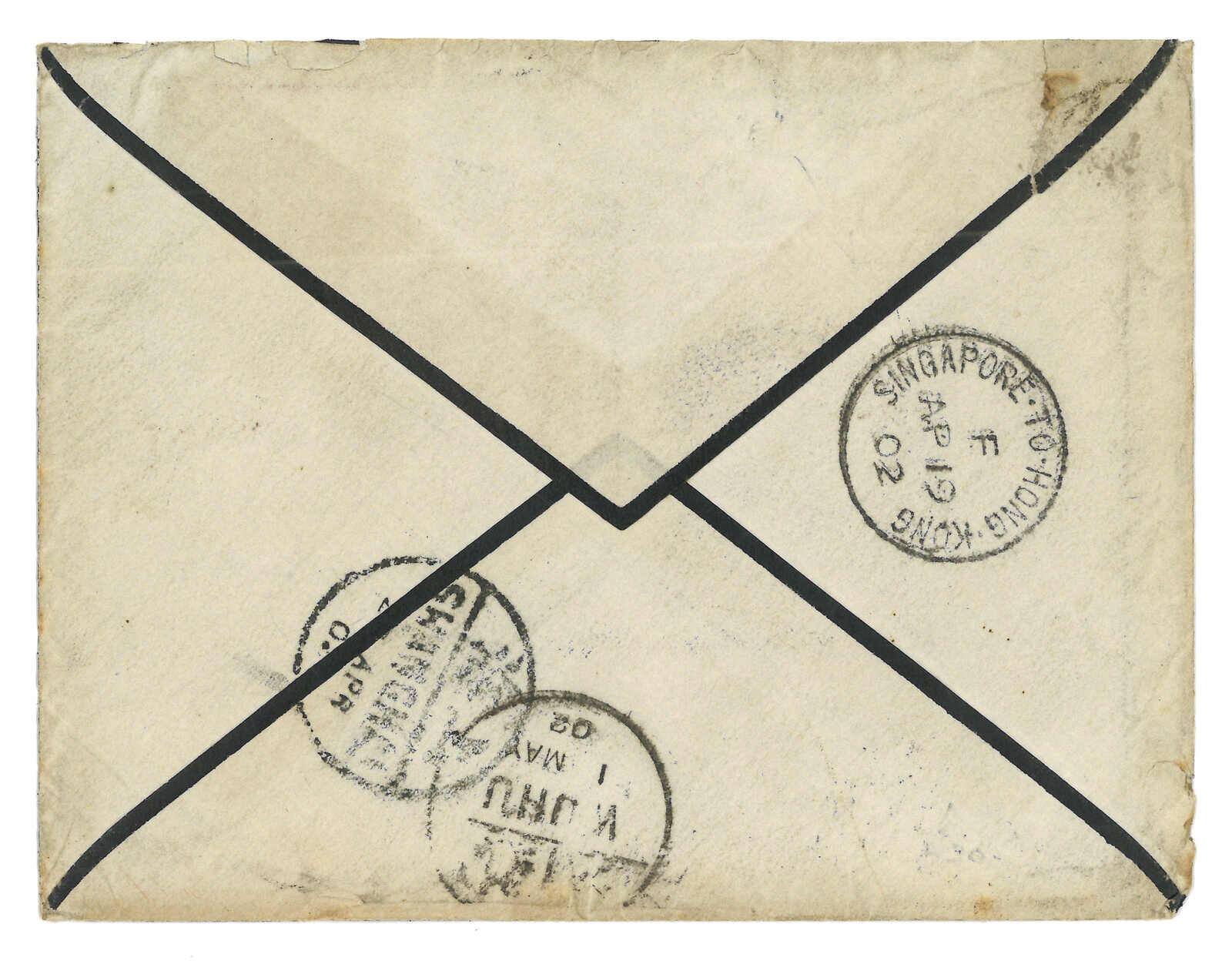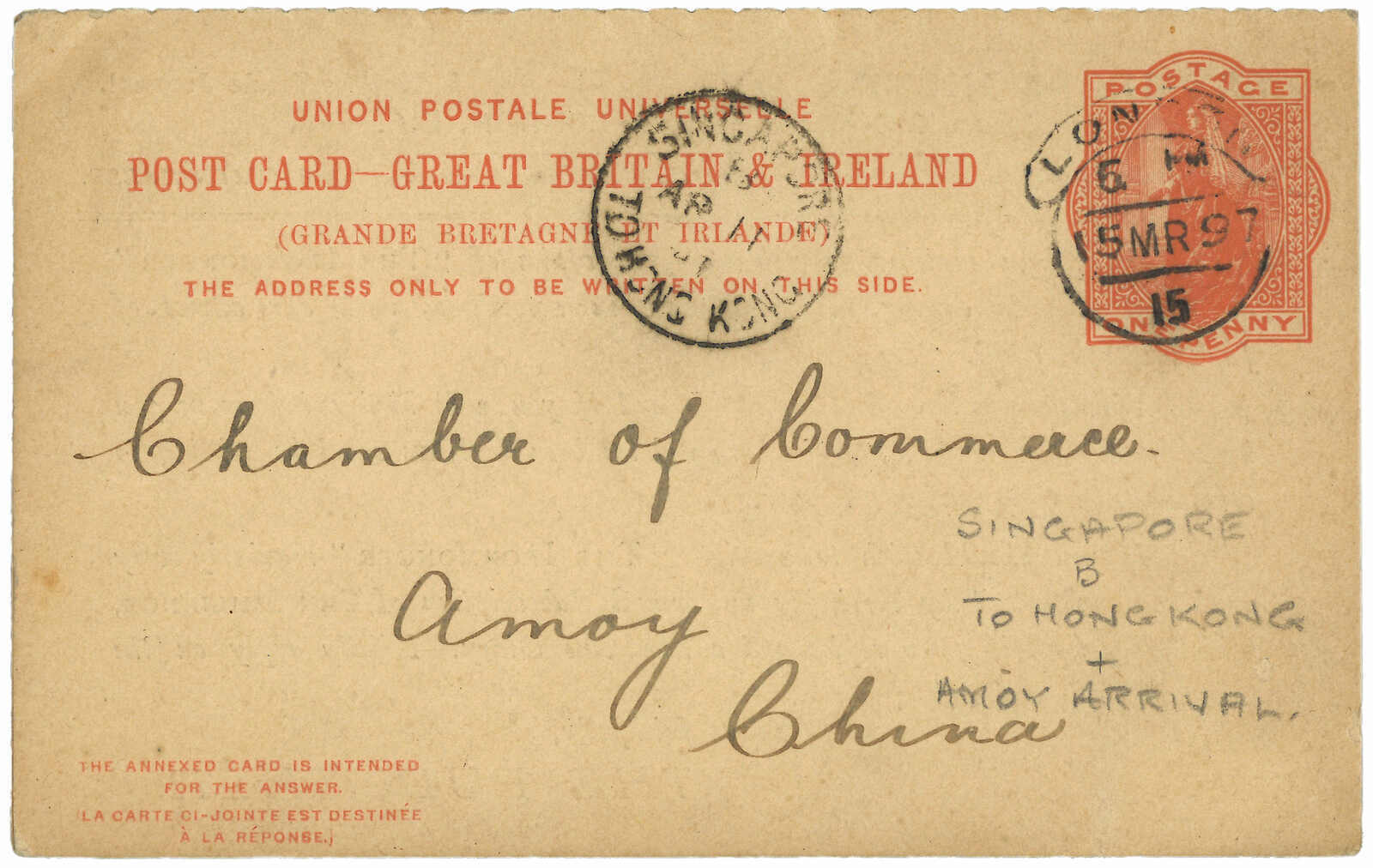 1897 (15 Mar) Britain QV 1d PSC from London to Amoy, tied by London cds. Transit with Singapore-to-Hong Kong marine sorter (11 Apr), Arrived Amoy BPO (18 Apr).