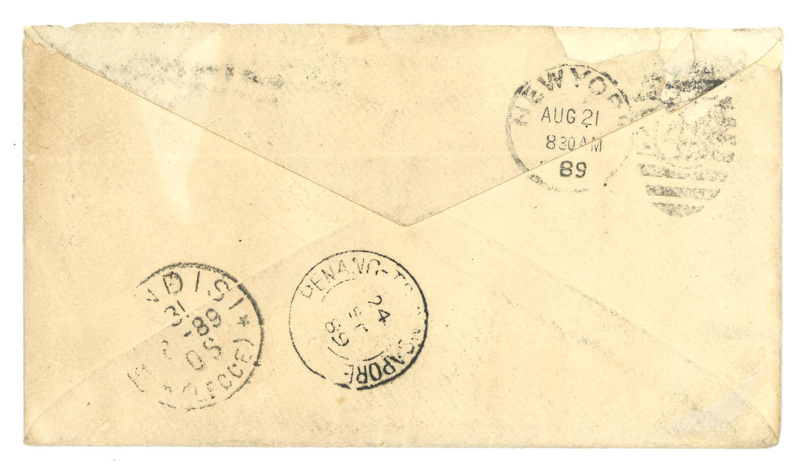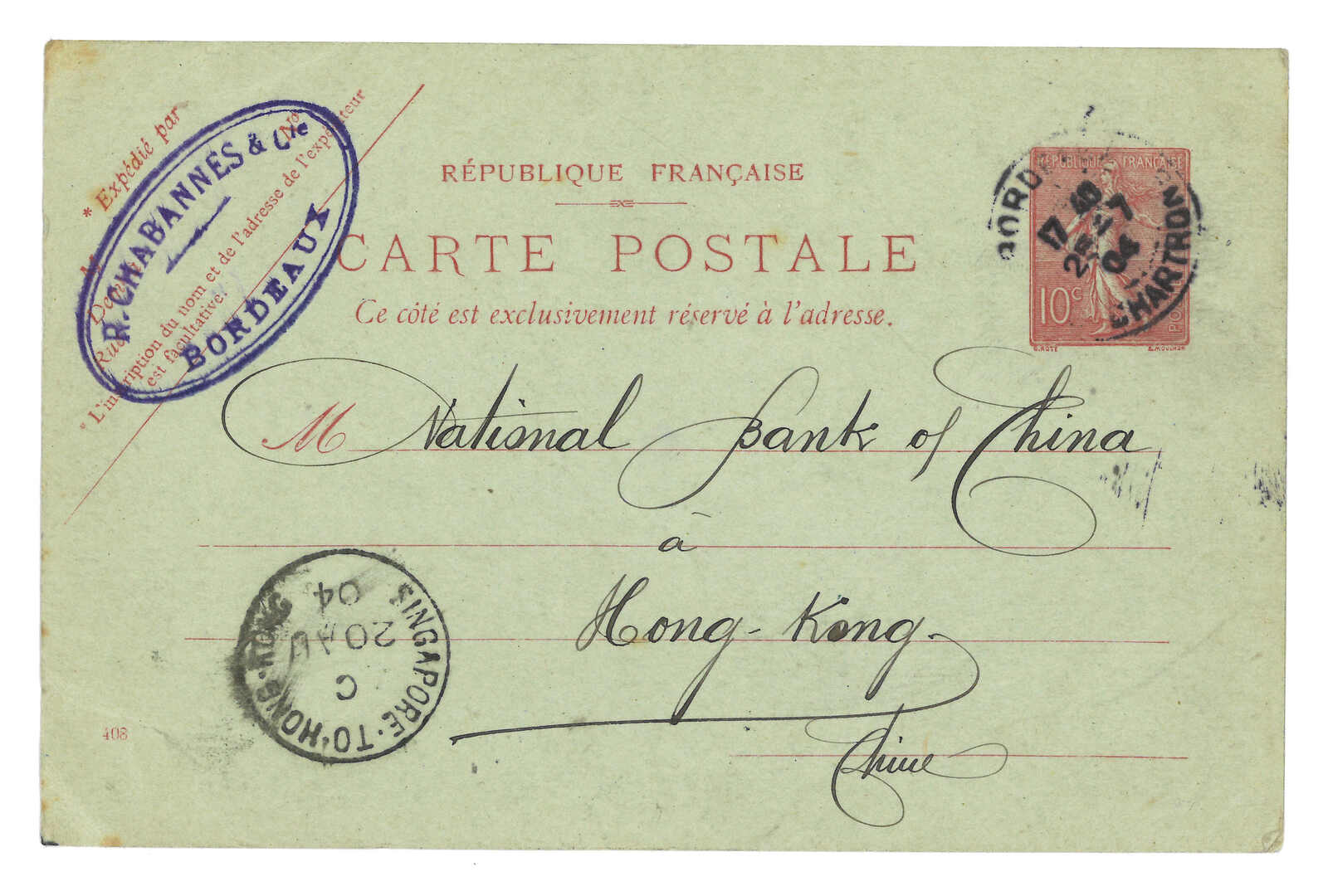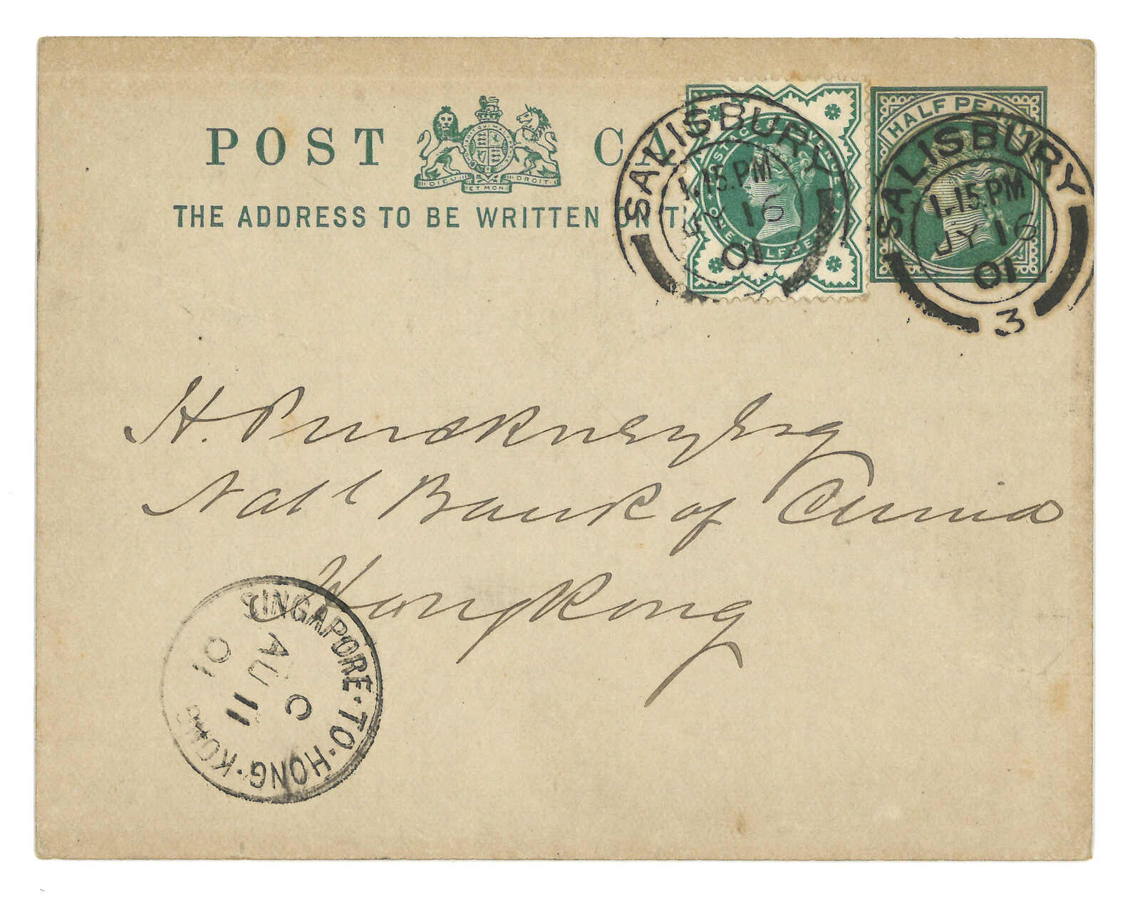 1897 (15 Mar) Britain QV 1d PSC from London to Amoy, tied by London cds. Transit with Singapore-to-Hong Kong marine sorter (11 Apr), Arrived Amoy BPO (18 Apr).