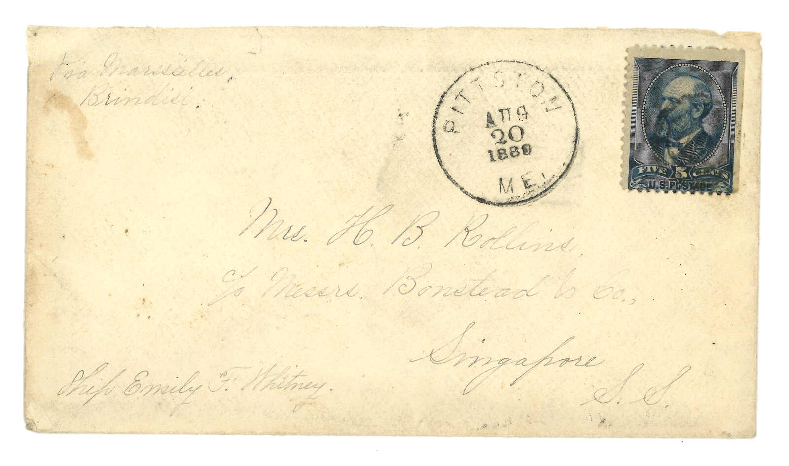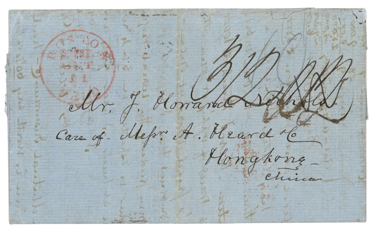 1851及1859年一對往來於香港、廣州及美國之郵簡,展示了多處郵資字樣及中轉戳。(Image 1)