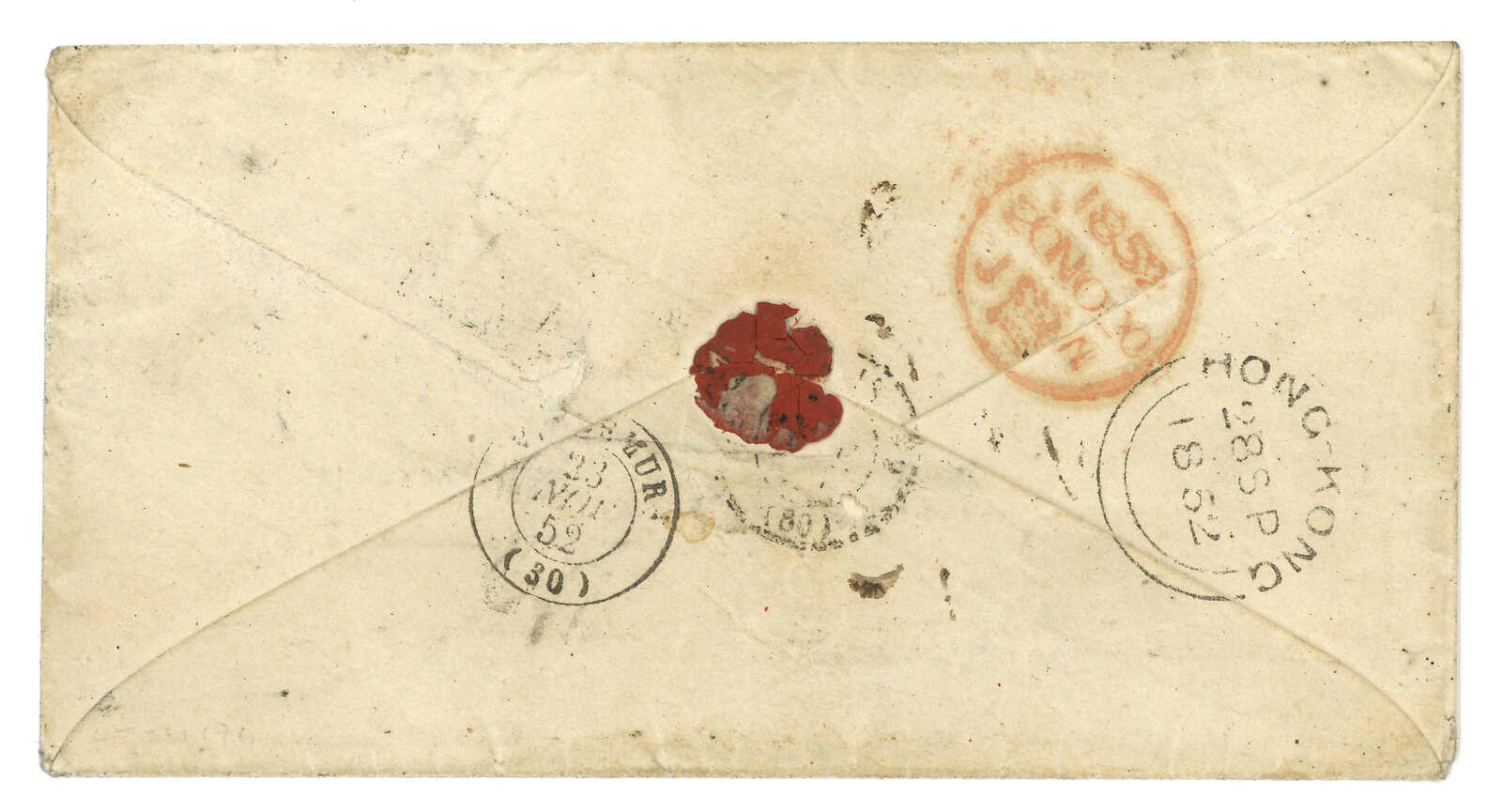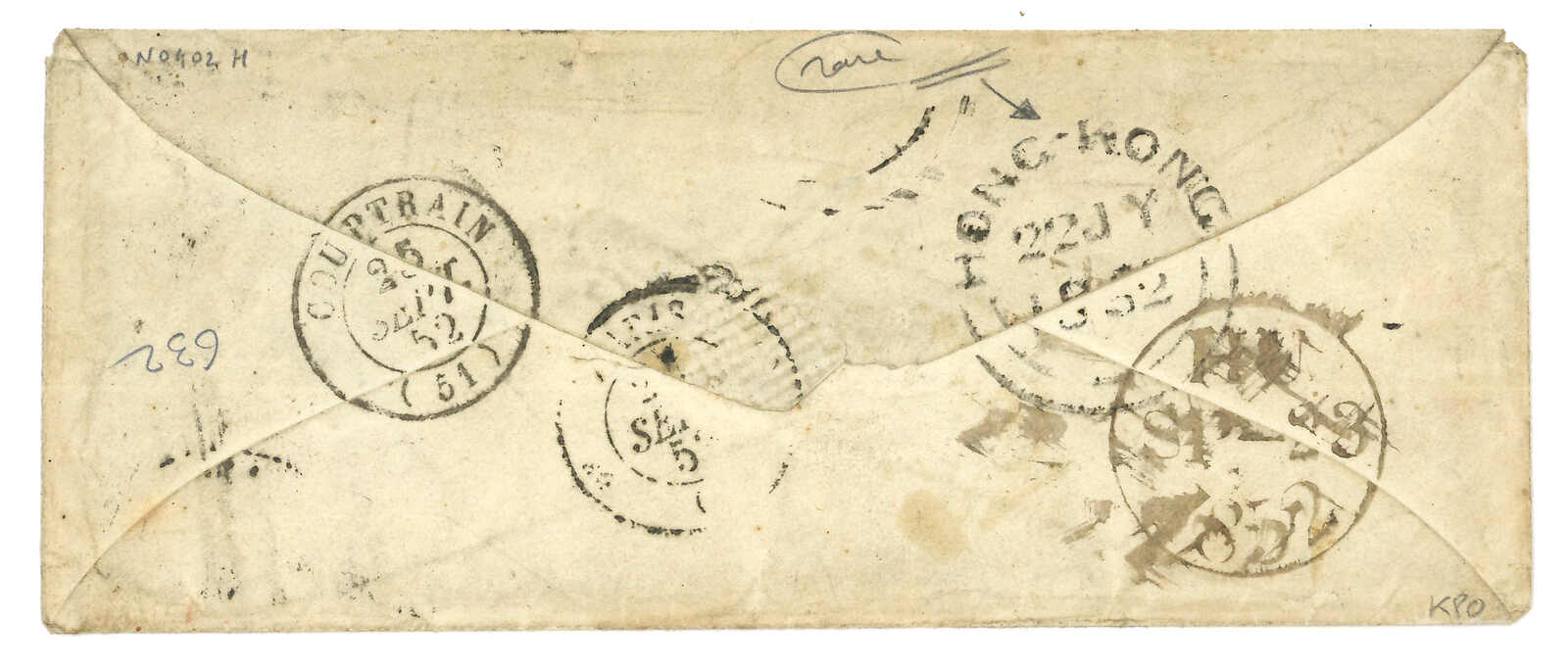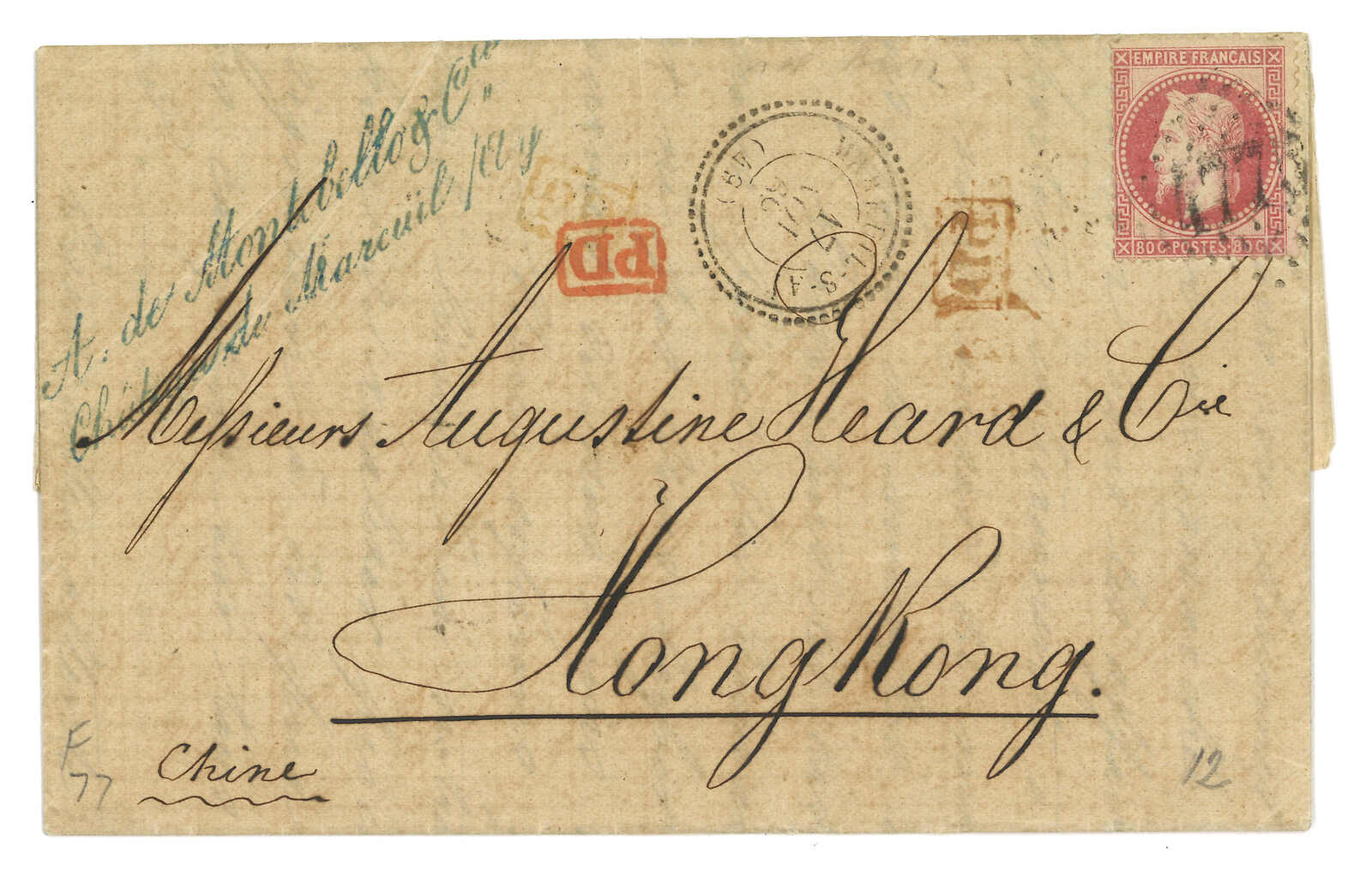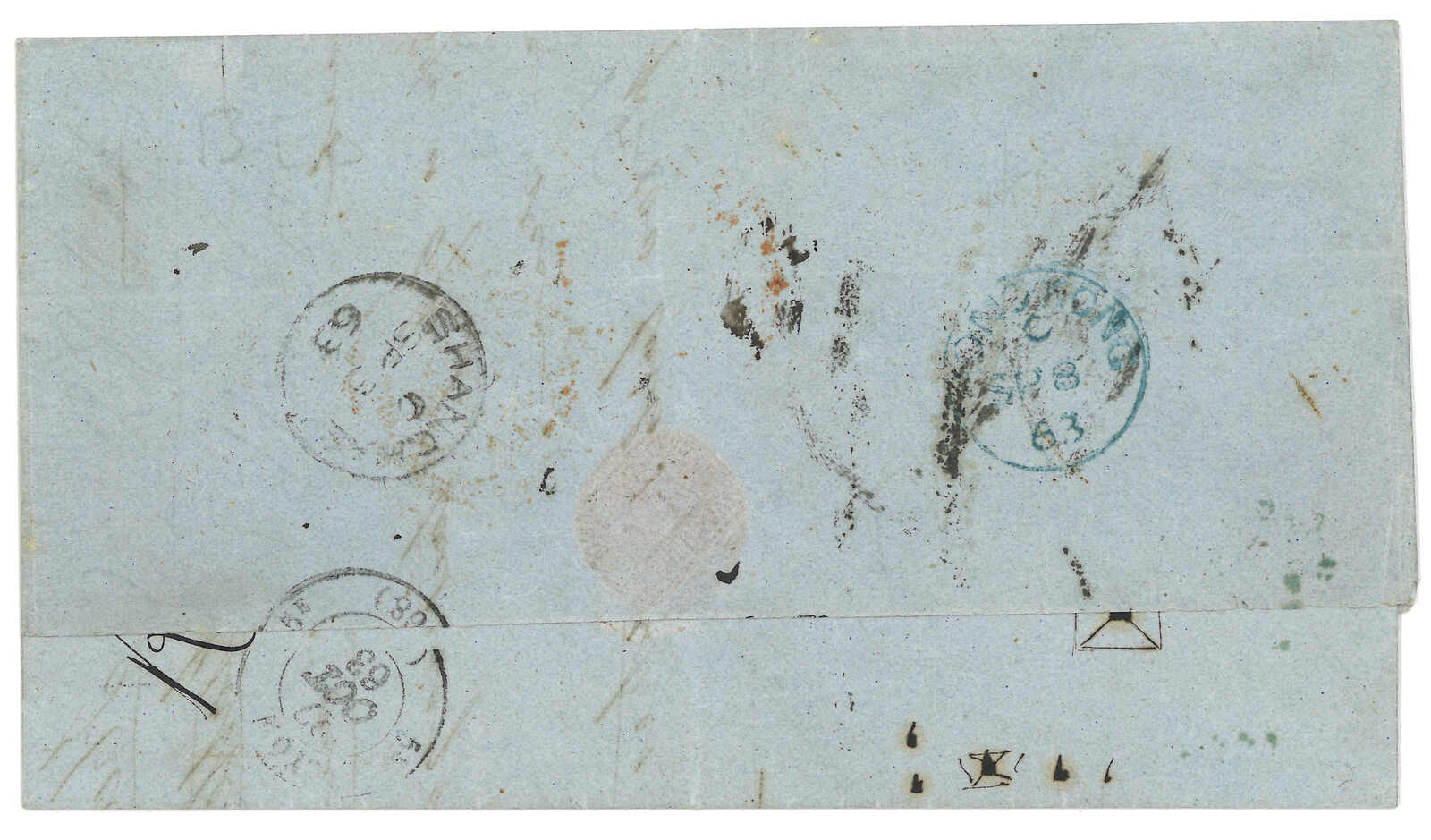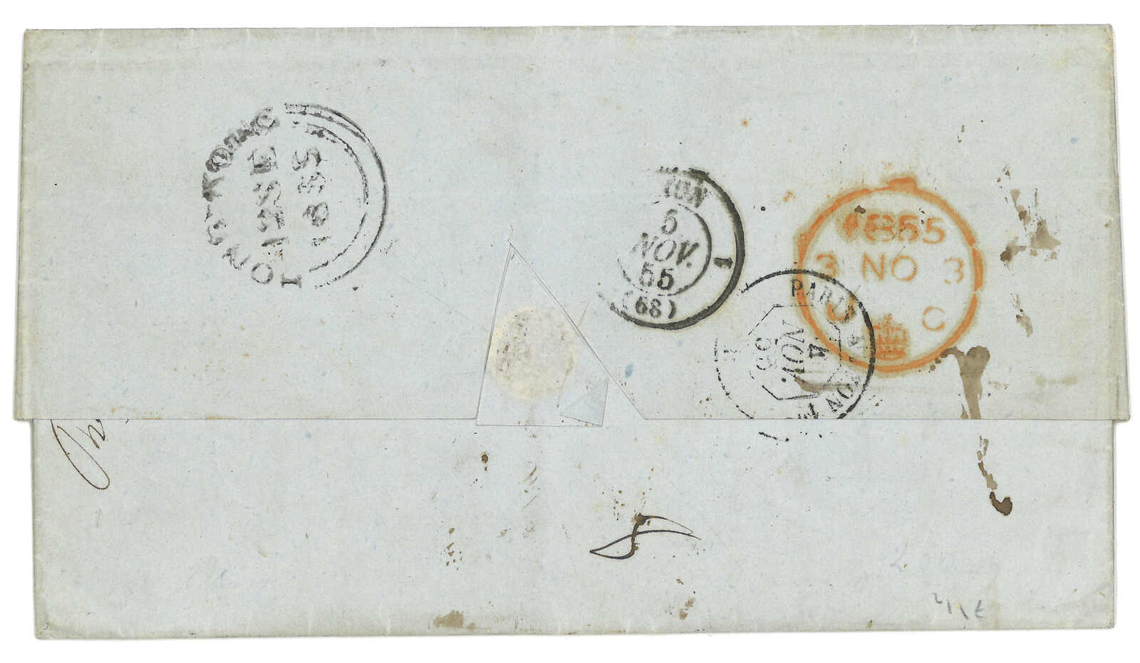 PAID”雙弧橙色圓戳,背鈐廣州英局2型雙弧日戳。經香港。Webb記錄之1型戳記例子僅數件。出色之早期廣州英局郵例。(Image 1)