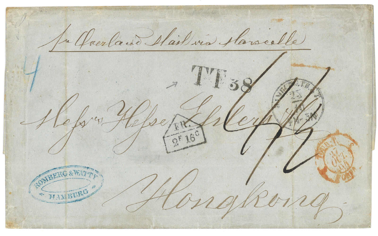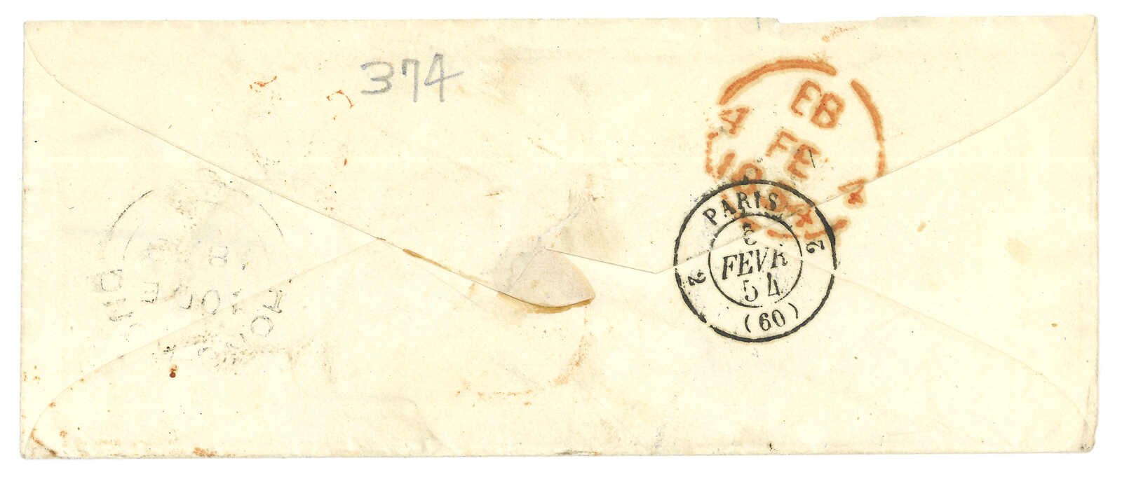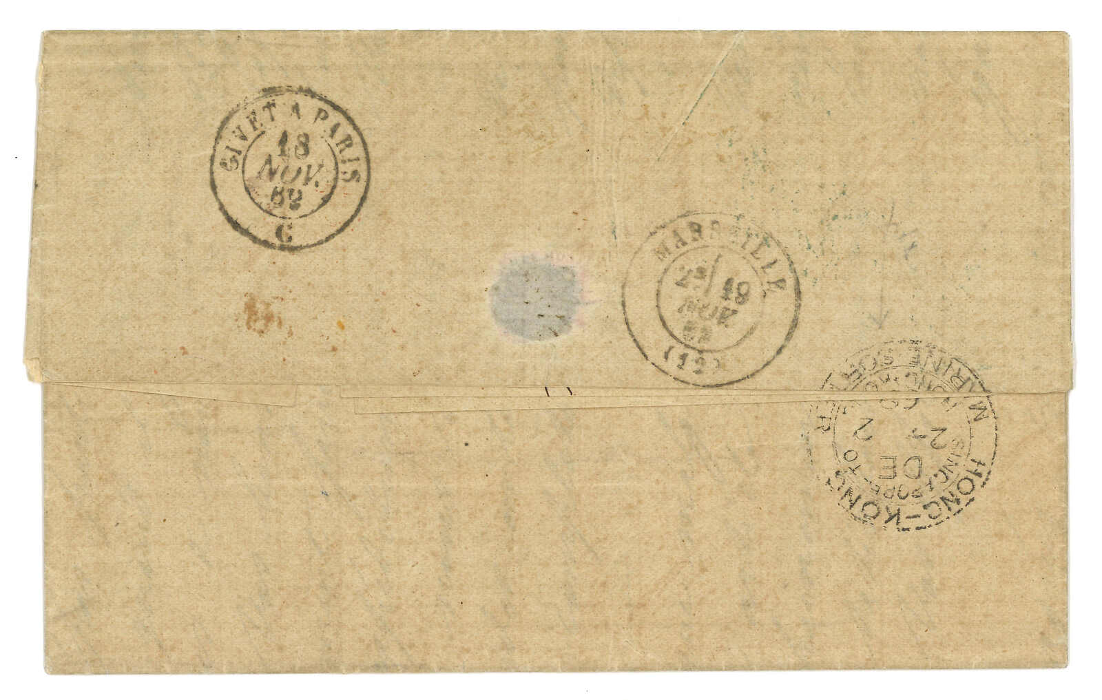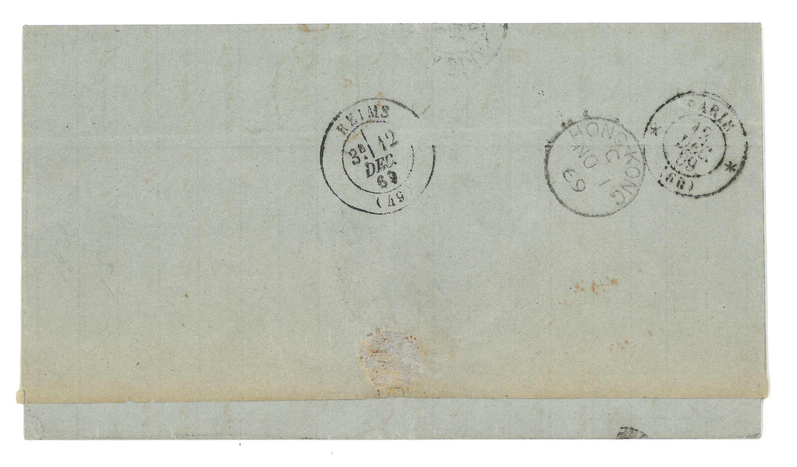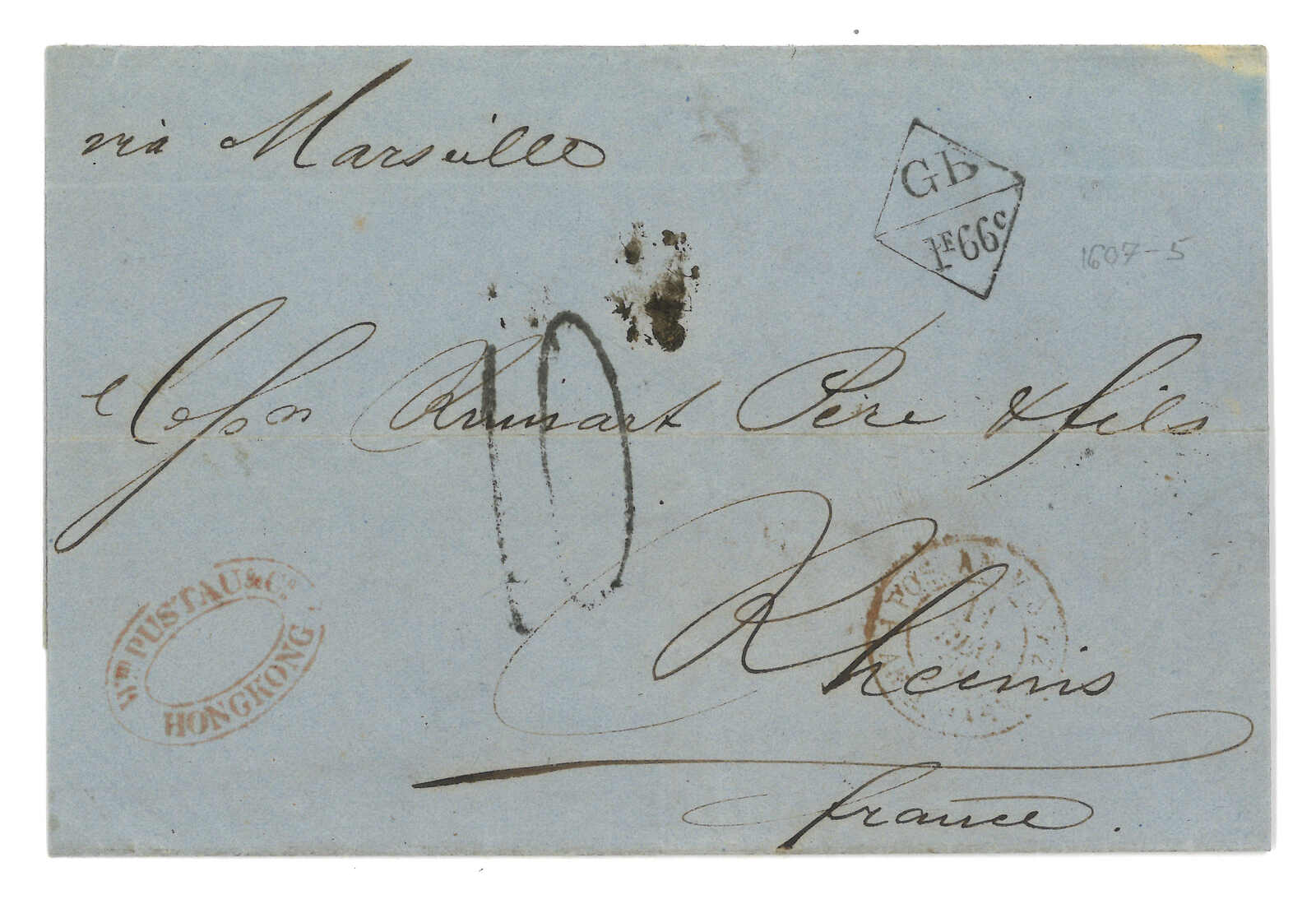 PAID”雙弧橙色圓戳,背鈐廣州英局2型雙弧日戳。經香港。Webb記錄之1型戳記例子僅數件。出色之早期廣州英局郵例。(Image 1)