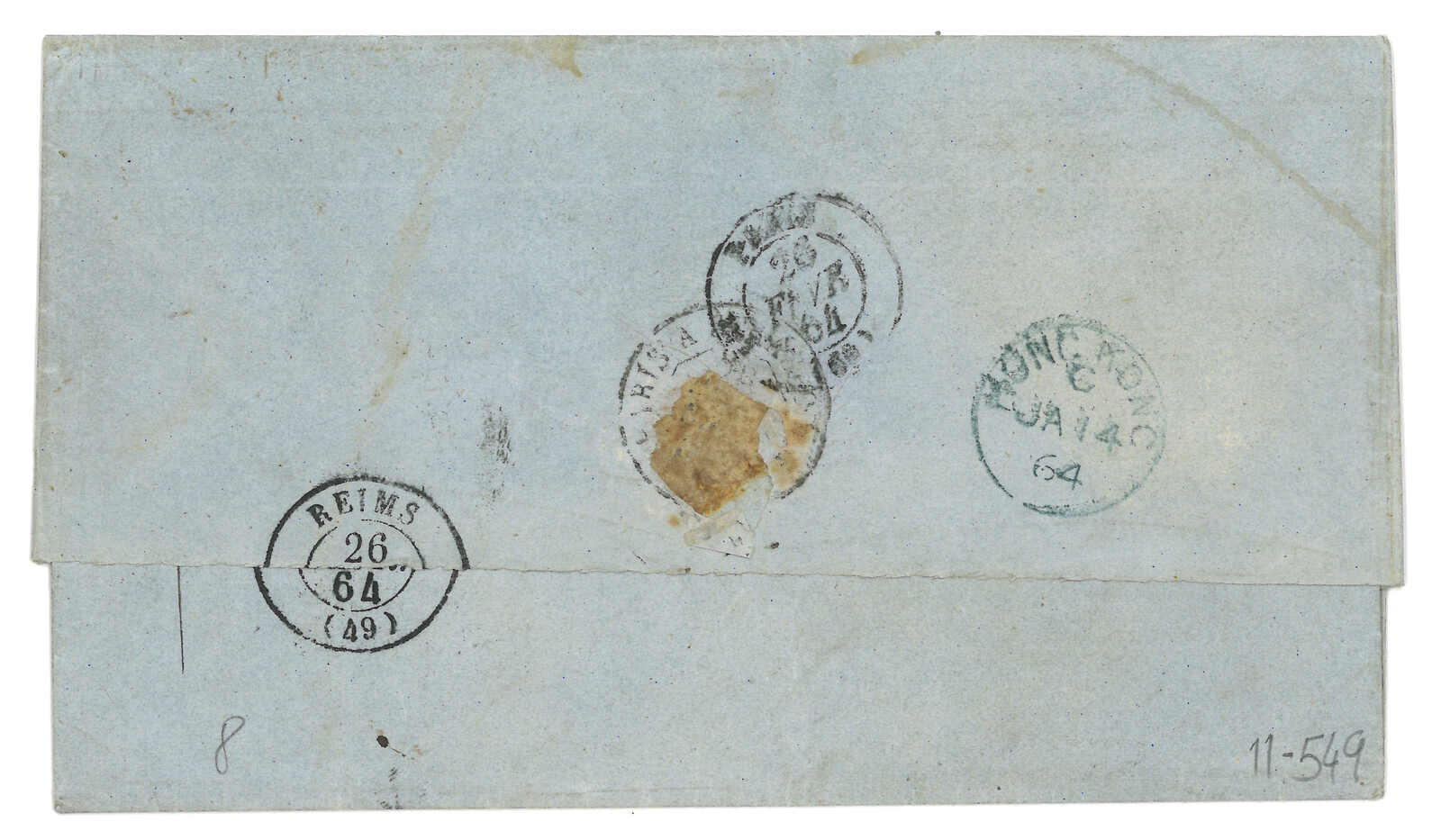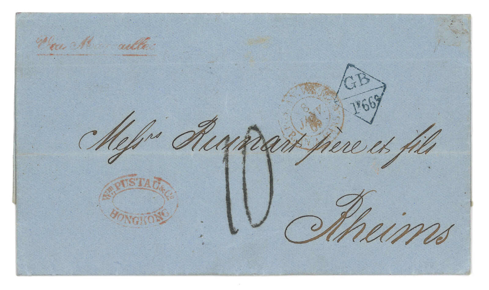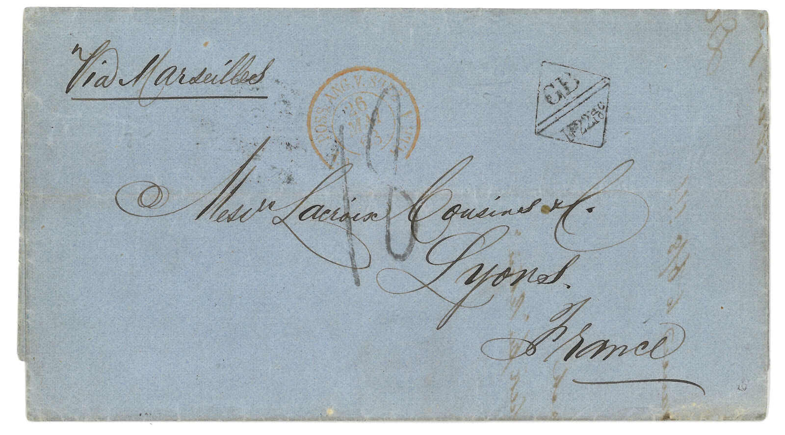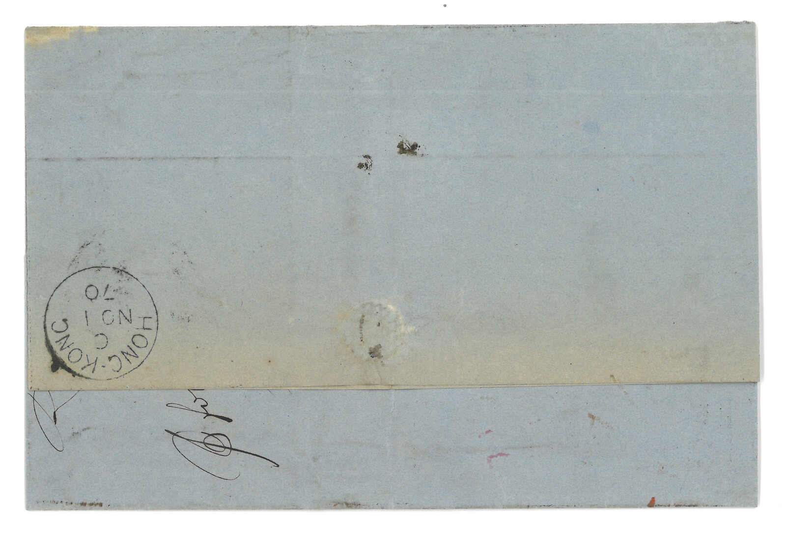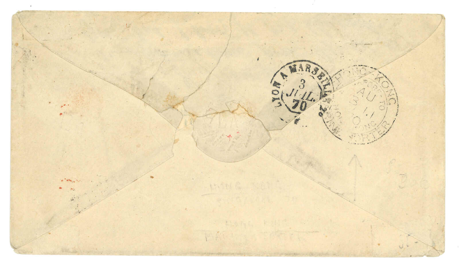 PAID”雙弧橙色圓戳,背鈐廣州英局2型雙弧日戳。經香港。Webb記錄之1型戳記例子僅數件。出色之早期廣州英局郵例。(Image 1)