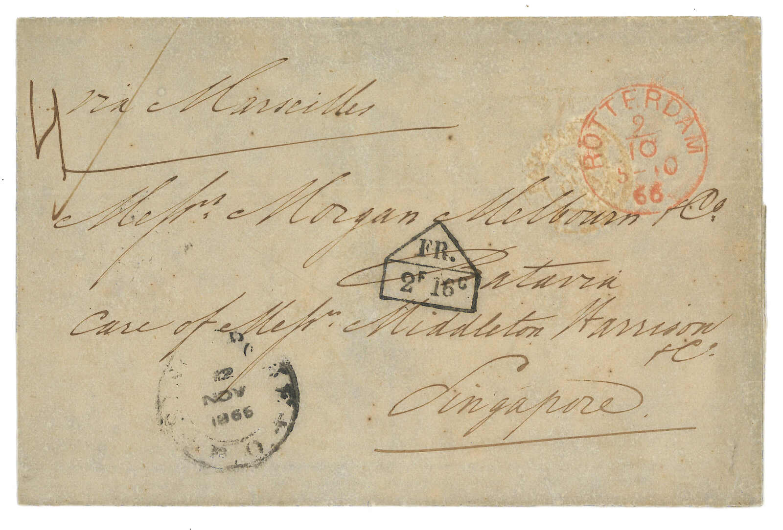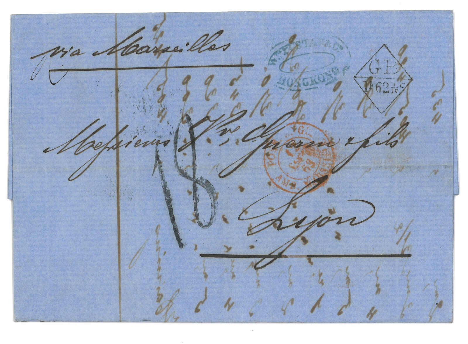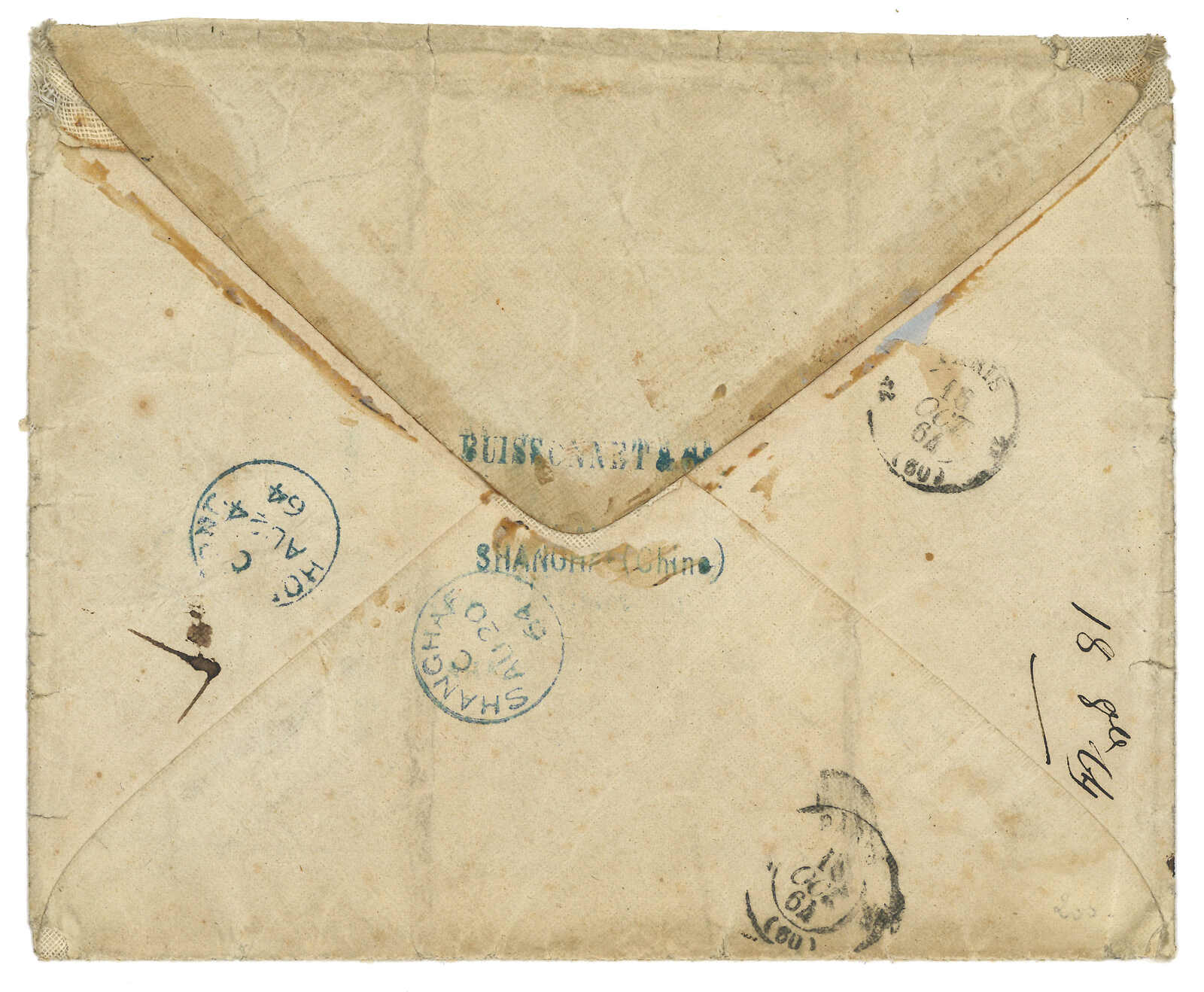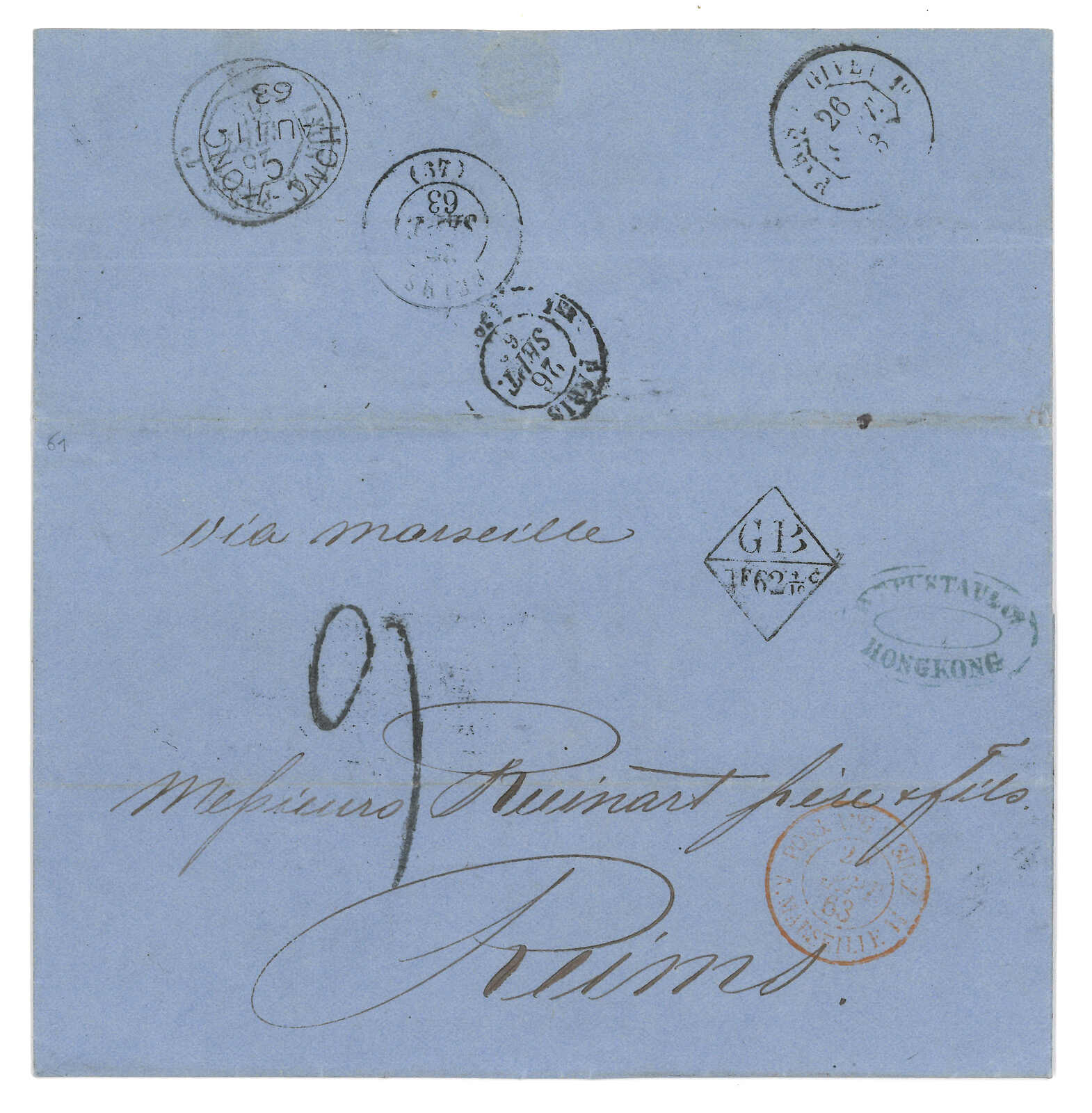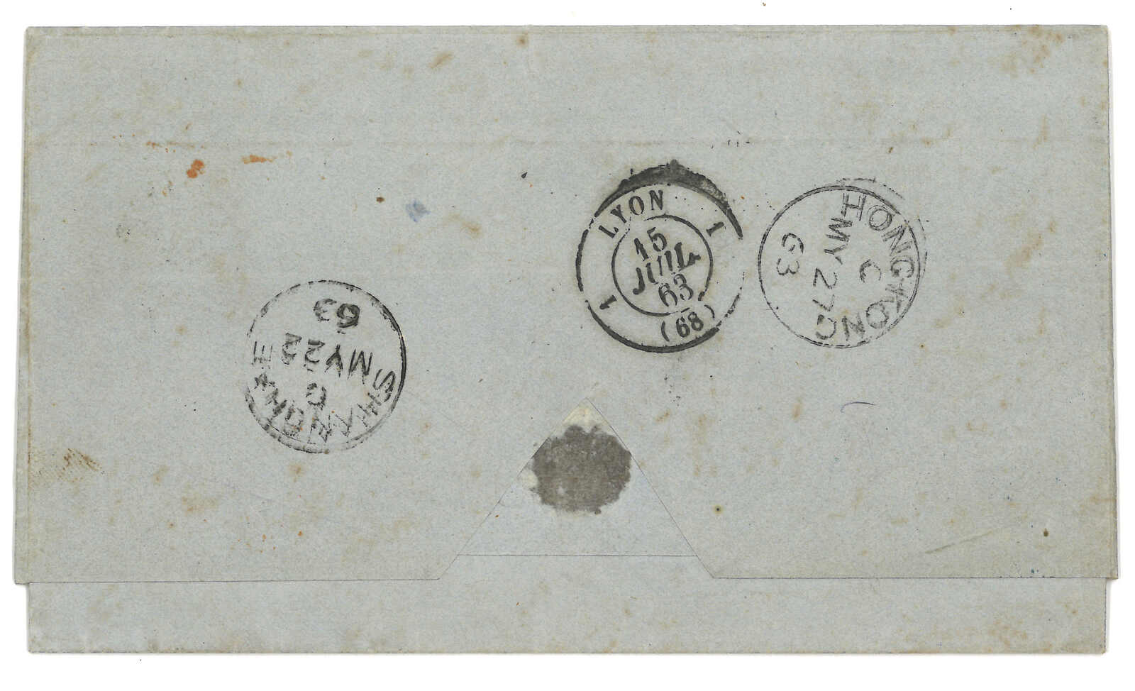 PAID”雙弧橙色圓戳,背鈐廣州英局2型雙弧日戳。經香港。Webb記錄之1型戳記例子僅數件。出色之早期廣州英局郵例。(Image 1)