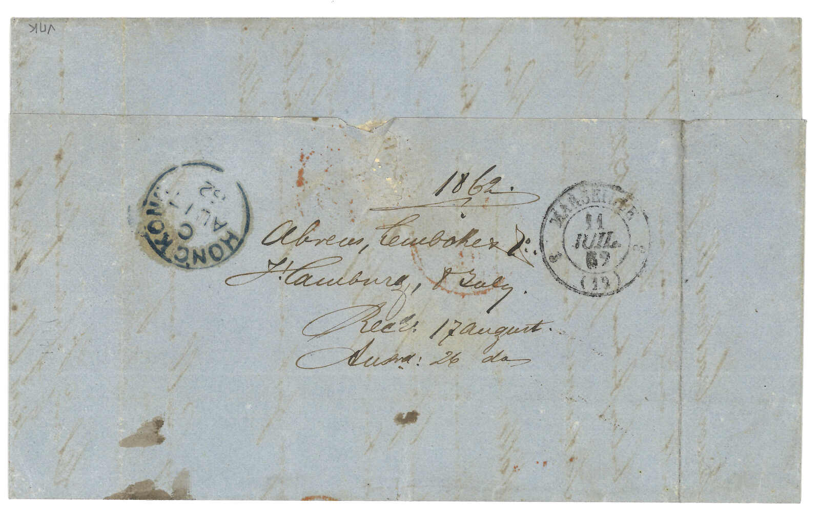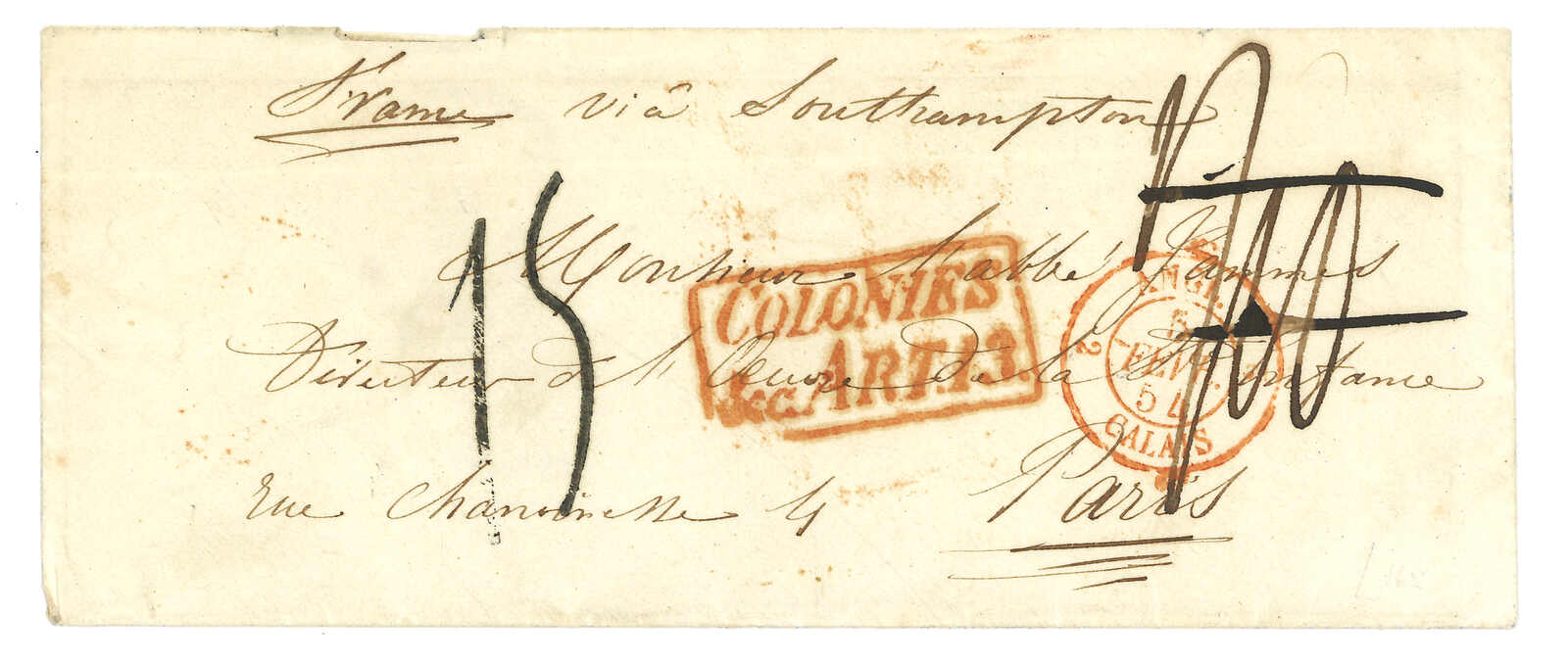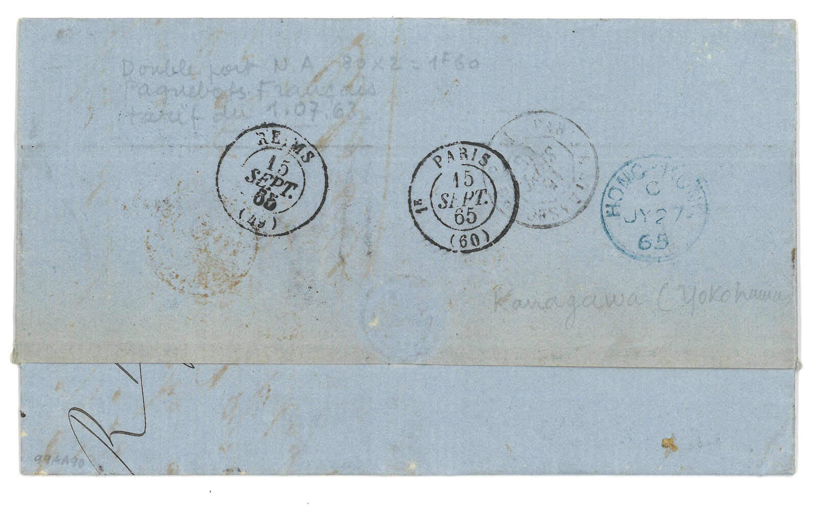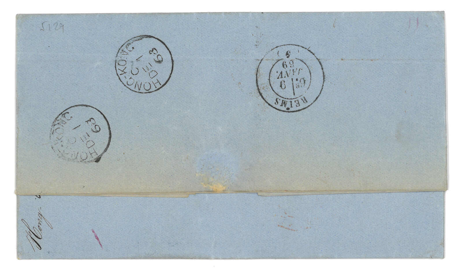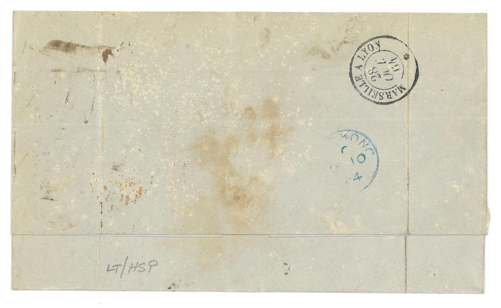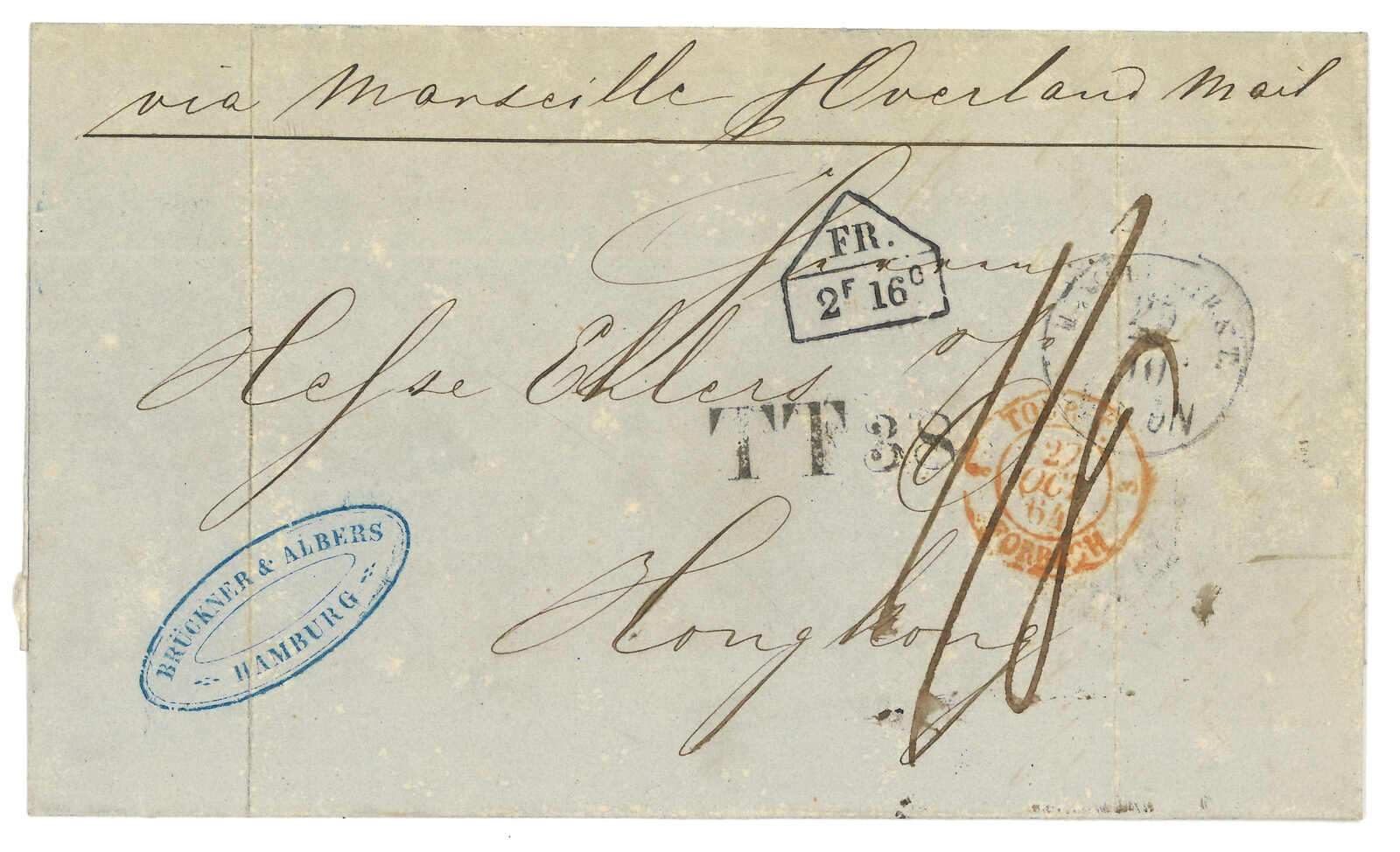 PAID”雙弧橙色圓戳,背鈐廣州英局2型雙弧日戳。經香港。Webb記錄之1型戳記例子僅數件。出色之早期廣州英局郵例。(Image 1)