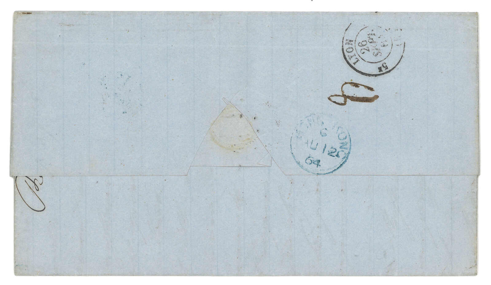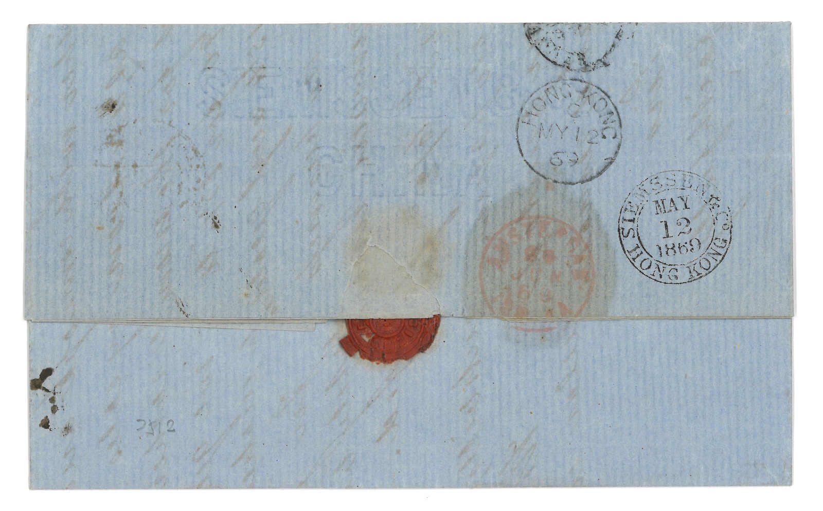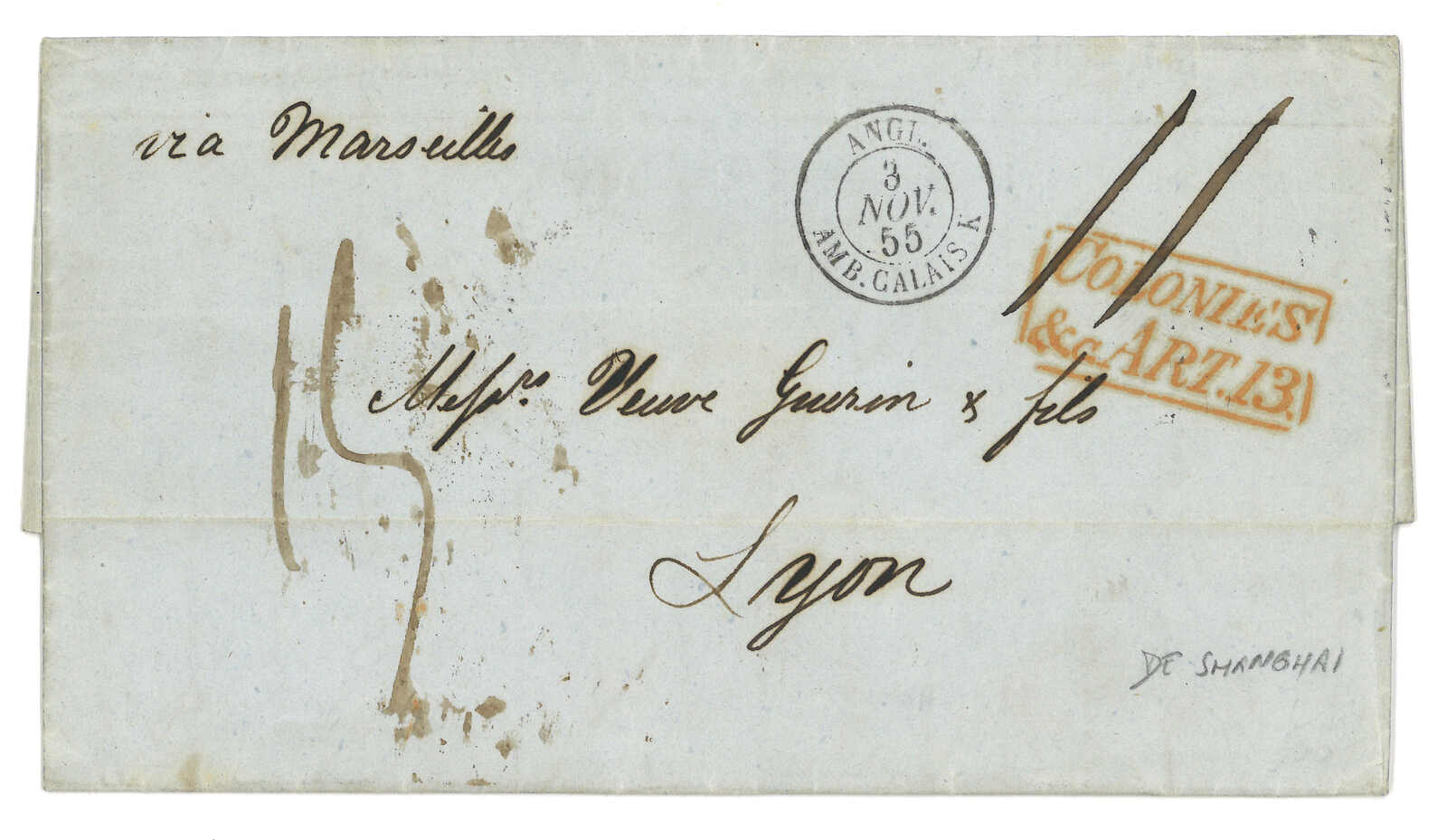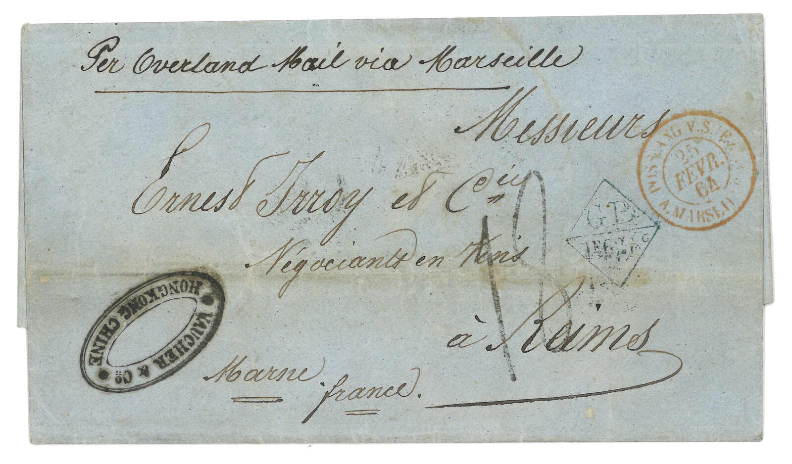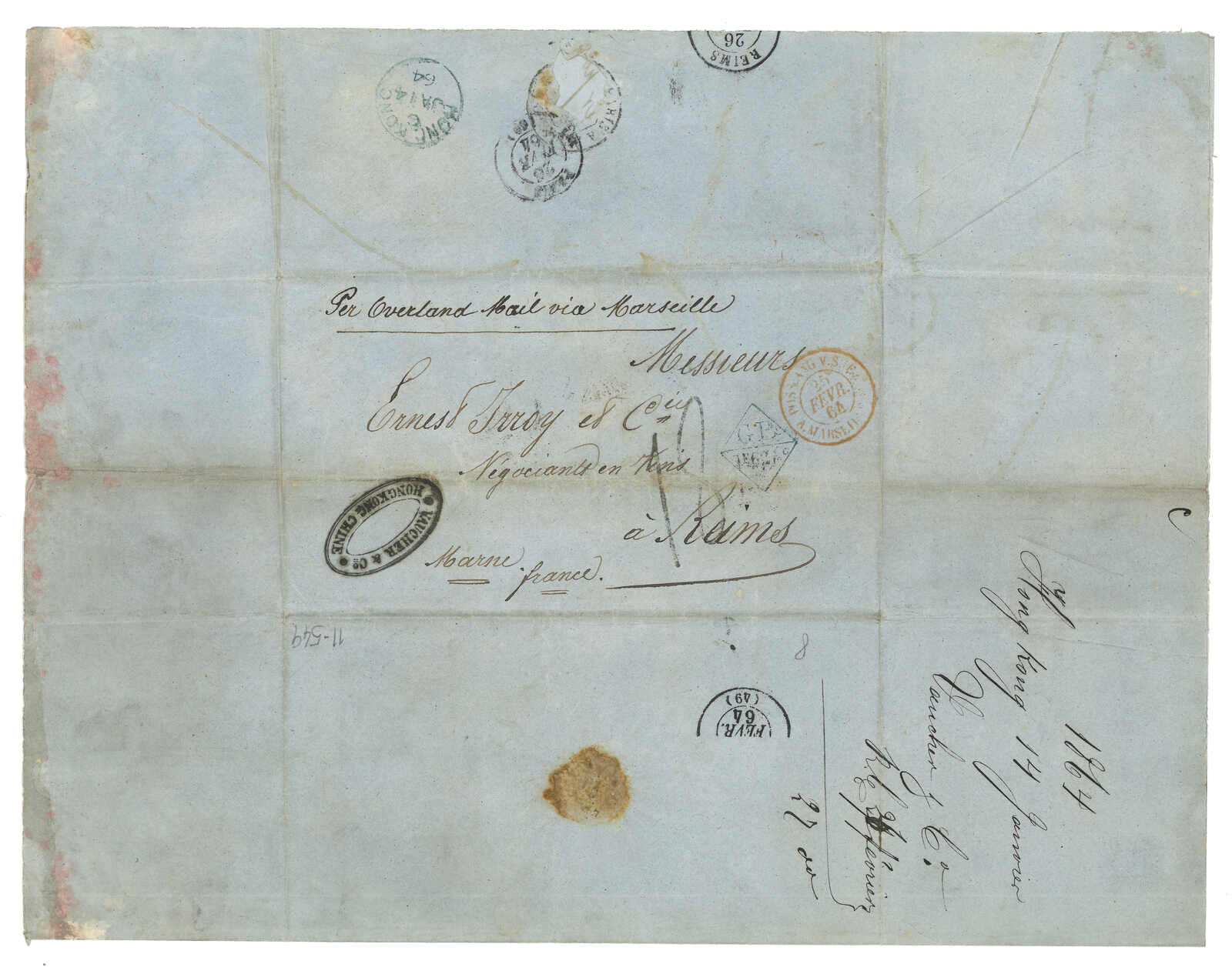 PAID”雙弧橙色圓戳,背鈐廣州英局2型雙弧日戳。經香港。Webb記錄之1型戳記例子僅數件。出色之早期廣州英局郵例。(Image 1)