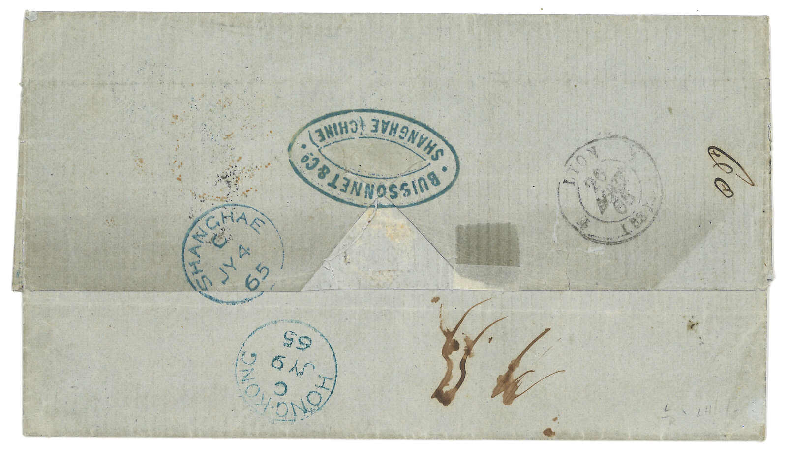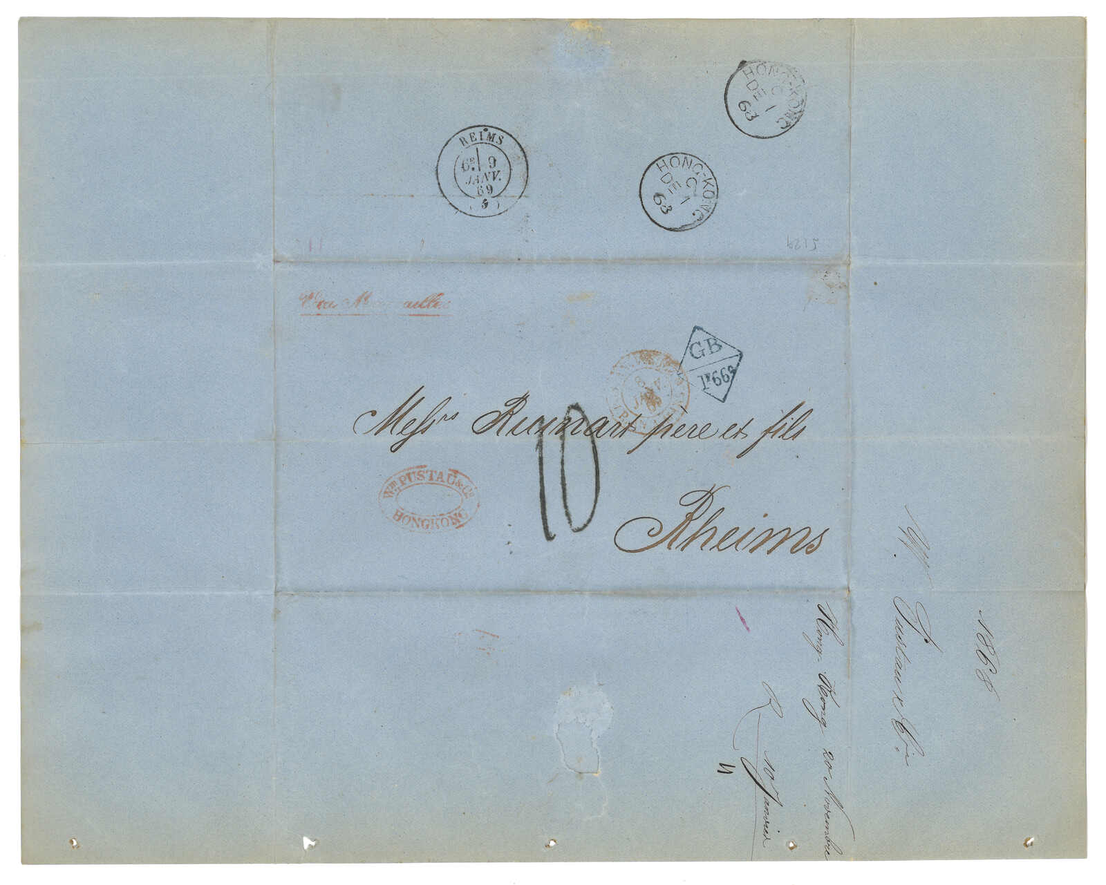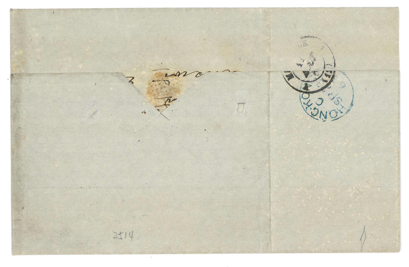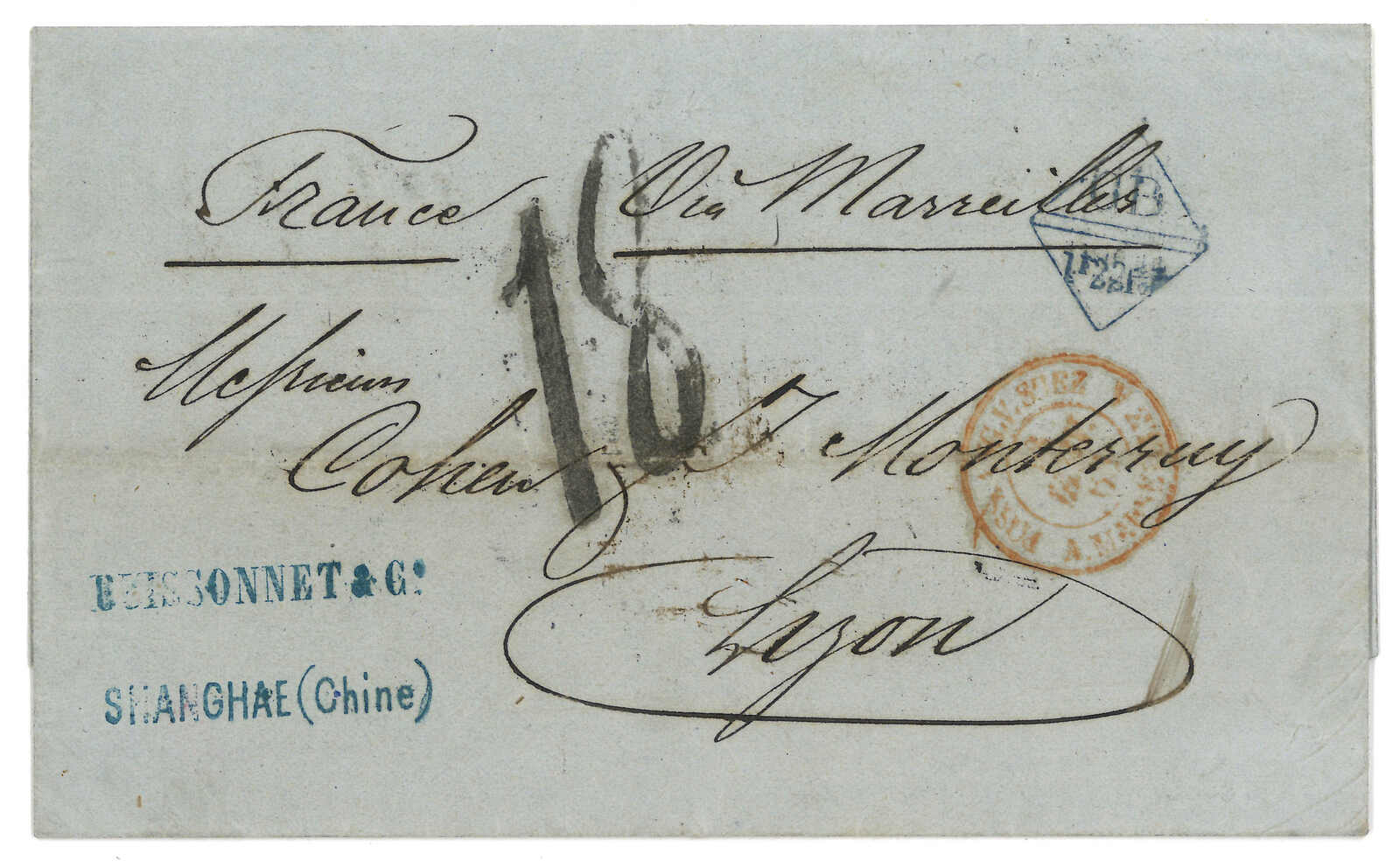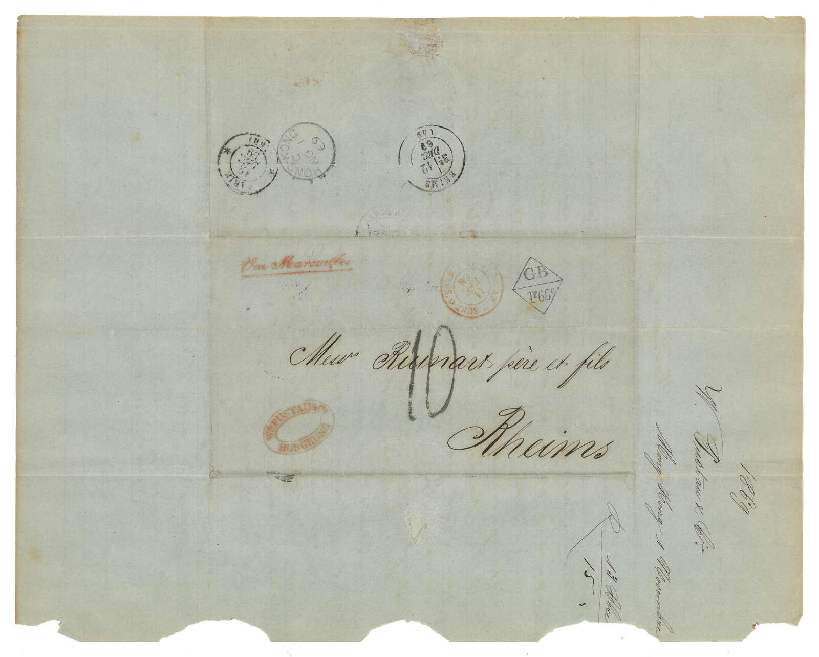 PAID”雙弧橙色圓戳,背鈐廣州英局2型雙弧日戳。經香港。Webb記錄之1型戳記例子僅數件。出色之早期廣州英局郵例。(Image 1)