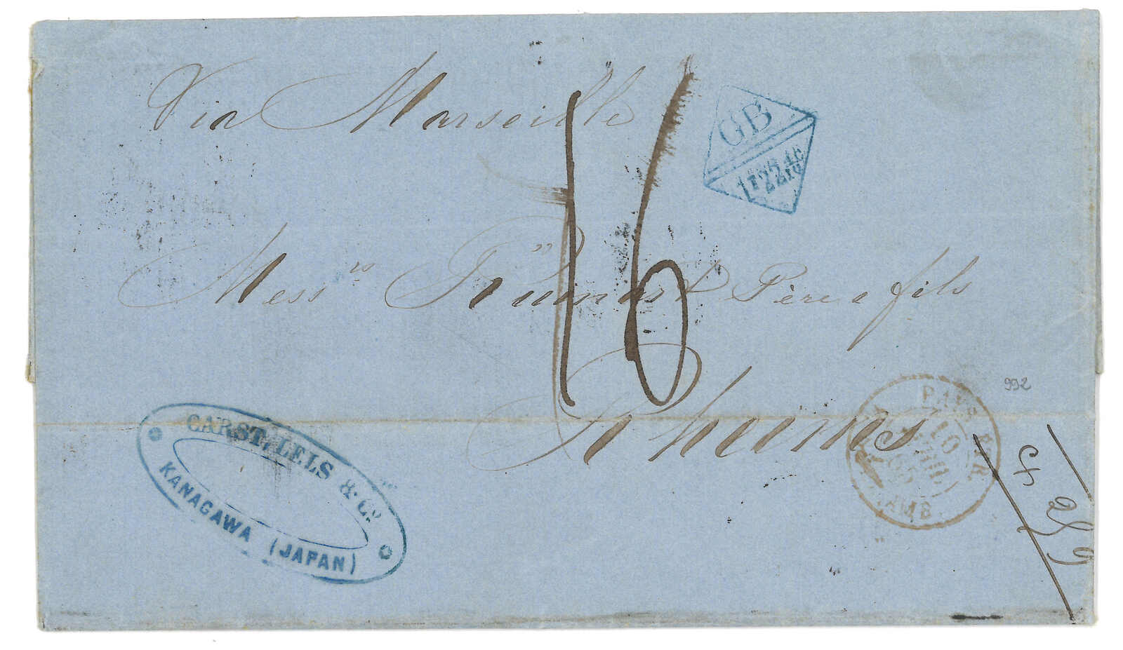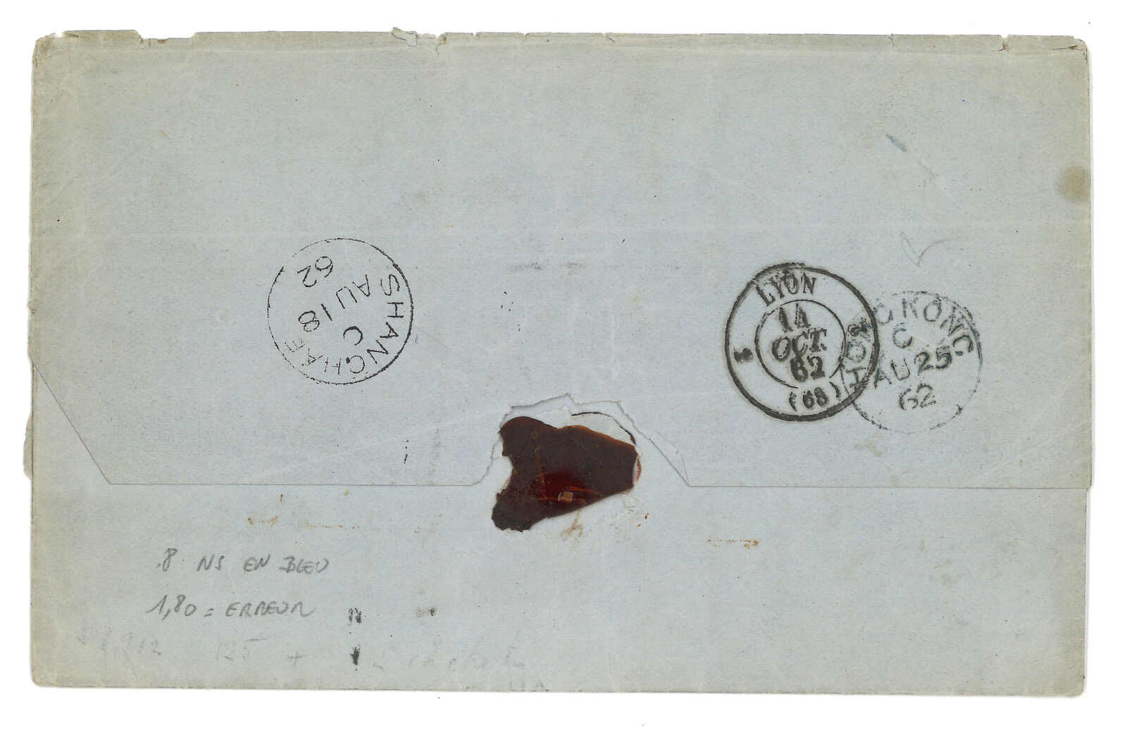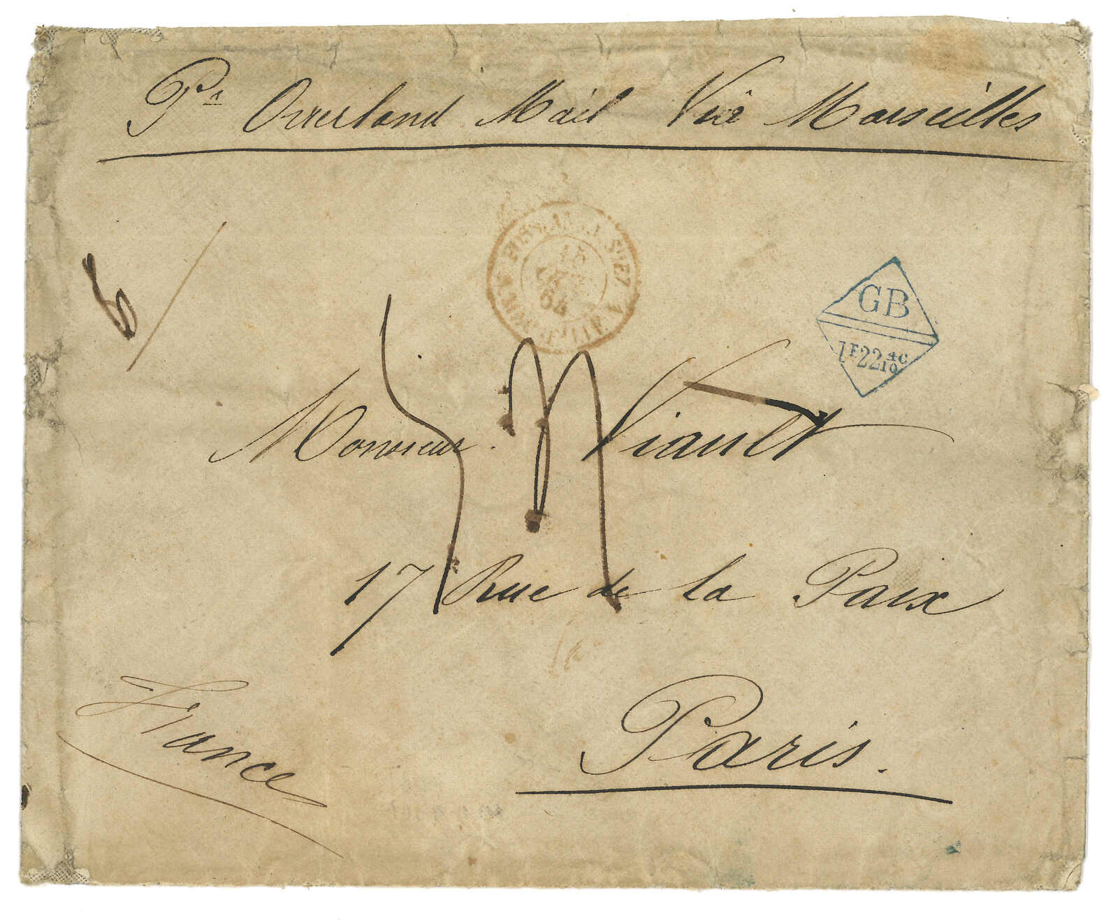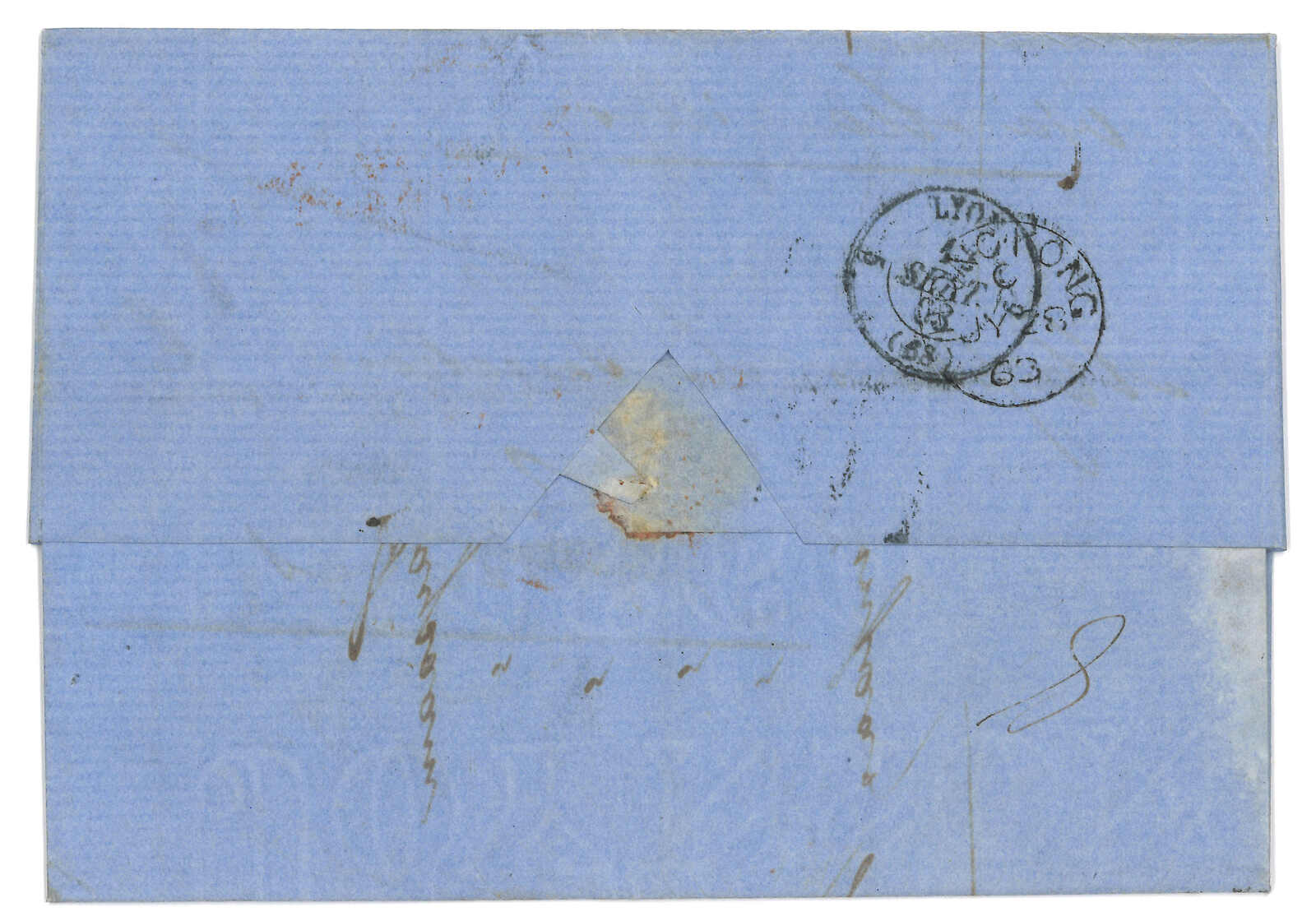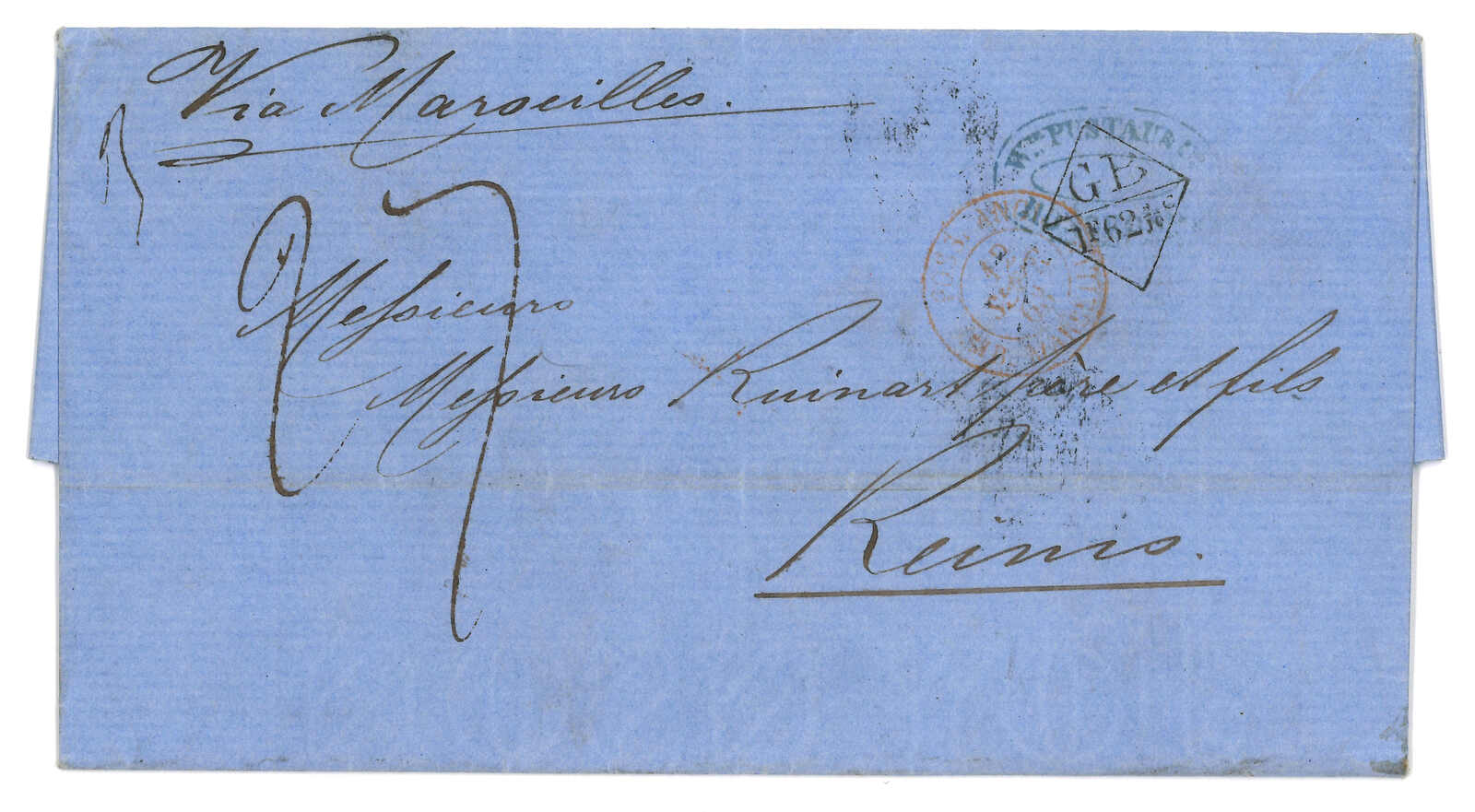 PAID”雙弧橙色圓戳,背鈐廣州英局2型雙弧日戳。經香港。Webb記錄之1型戳記例子僅數件。出色之早期廣州英局郵例。(Image 1)