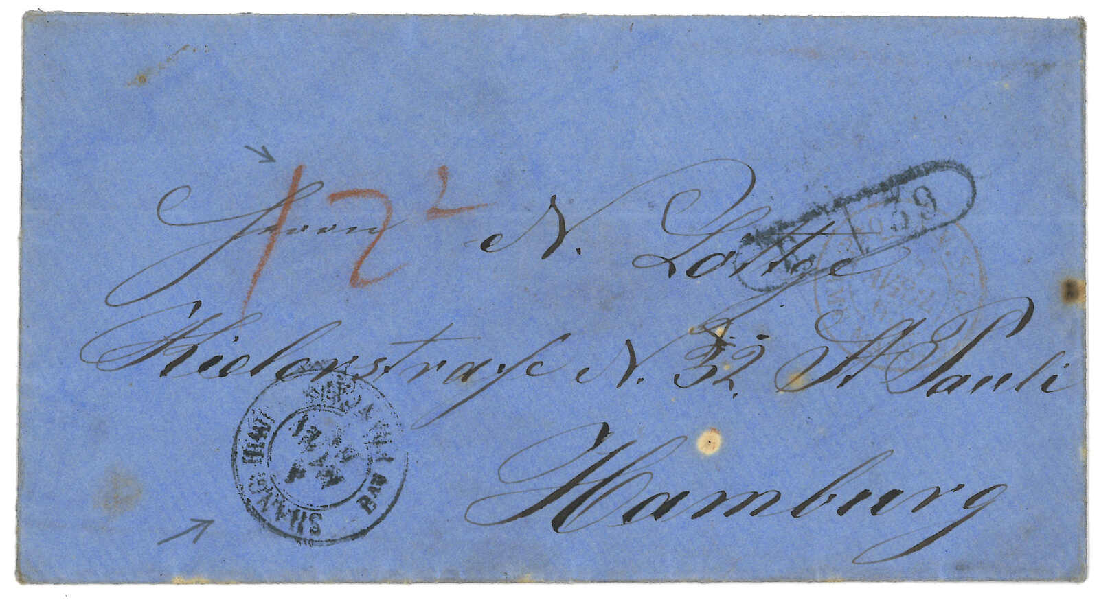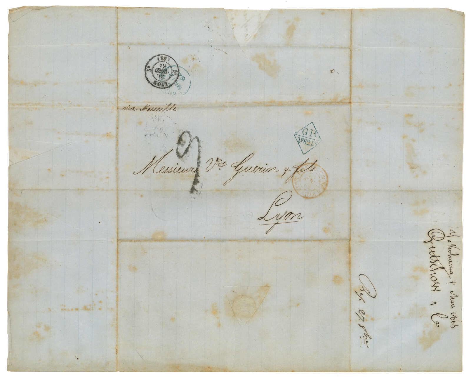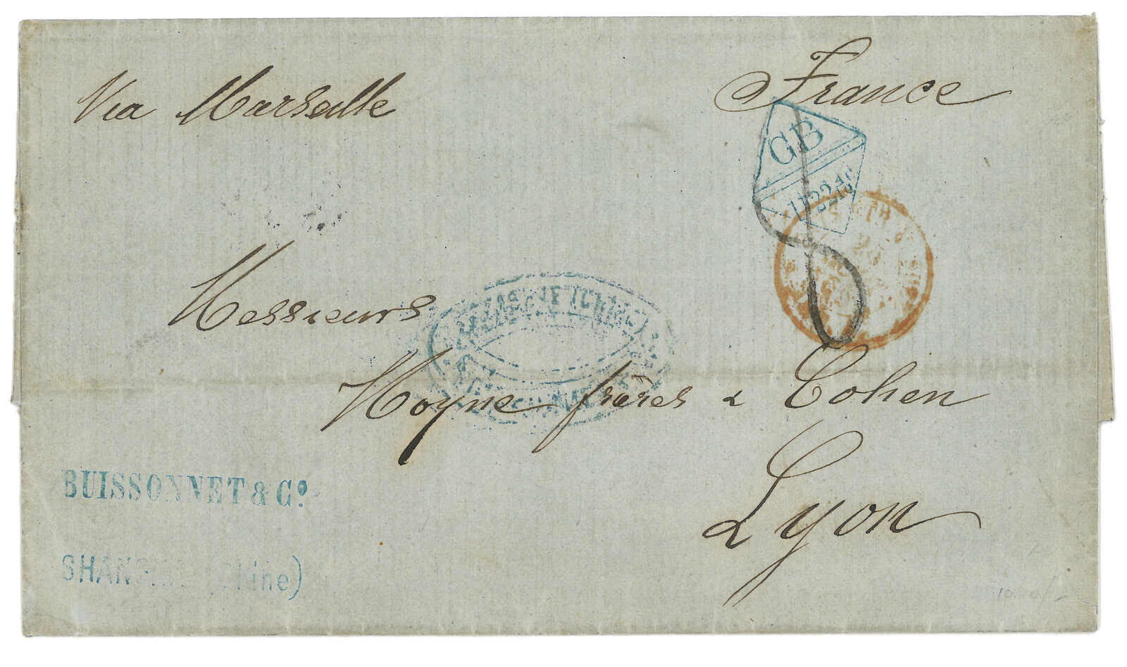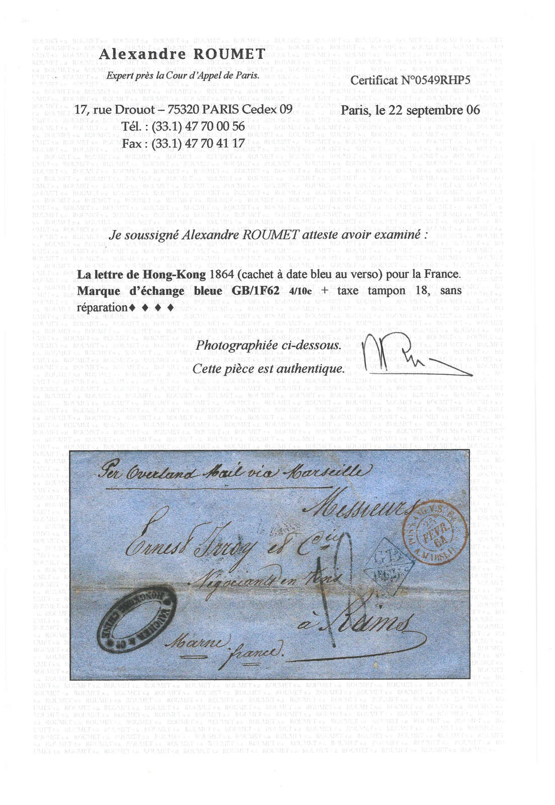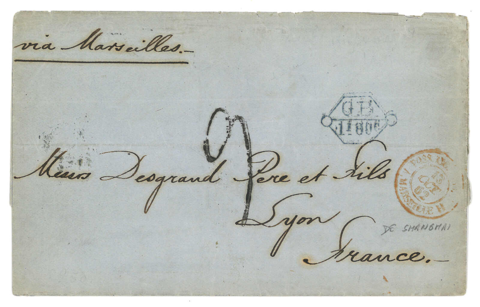 PAID”雙弧橙色圓戳,背鈐廣州英局2型雙弧日戳。經香港。Webb記錄之1型戳記例子僅數件。出色之早期廣州英局郵例。(Image 1)