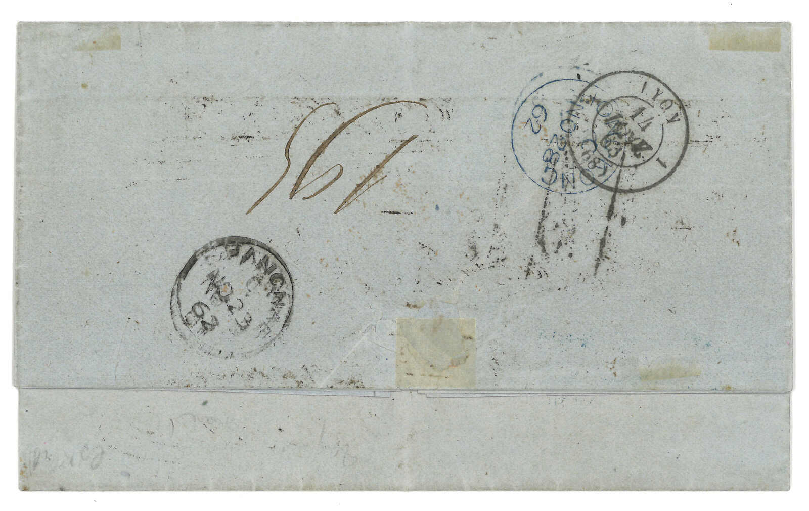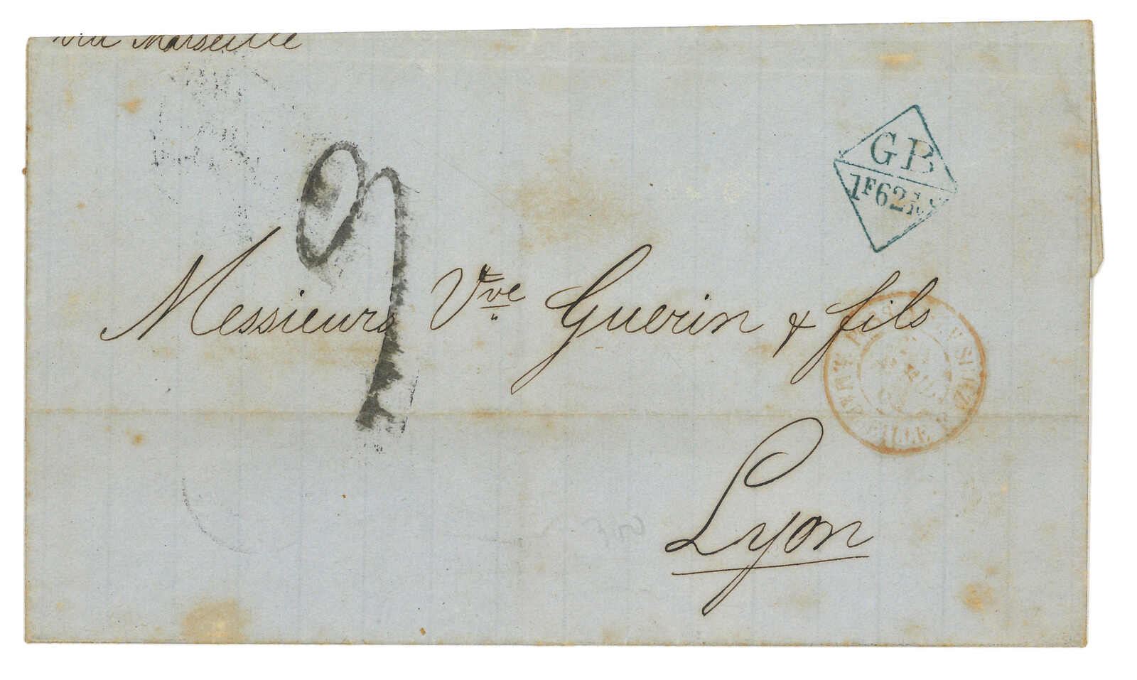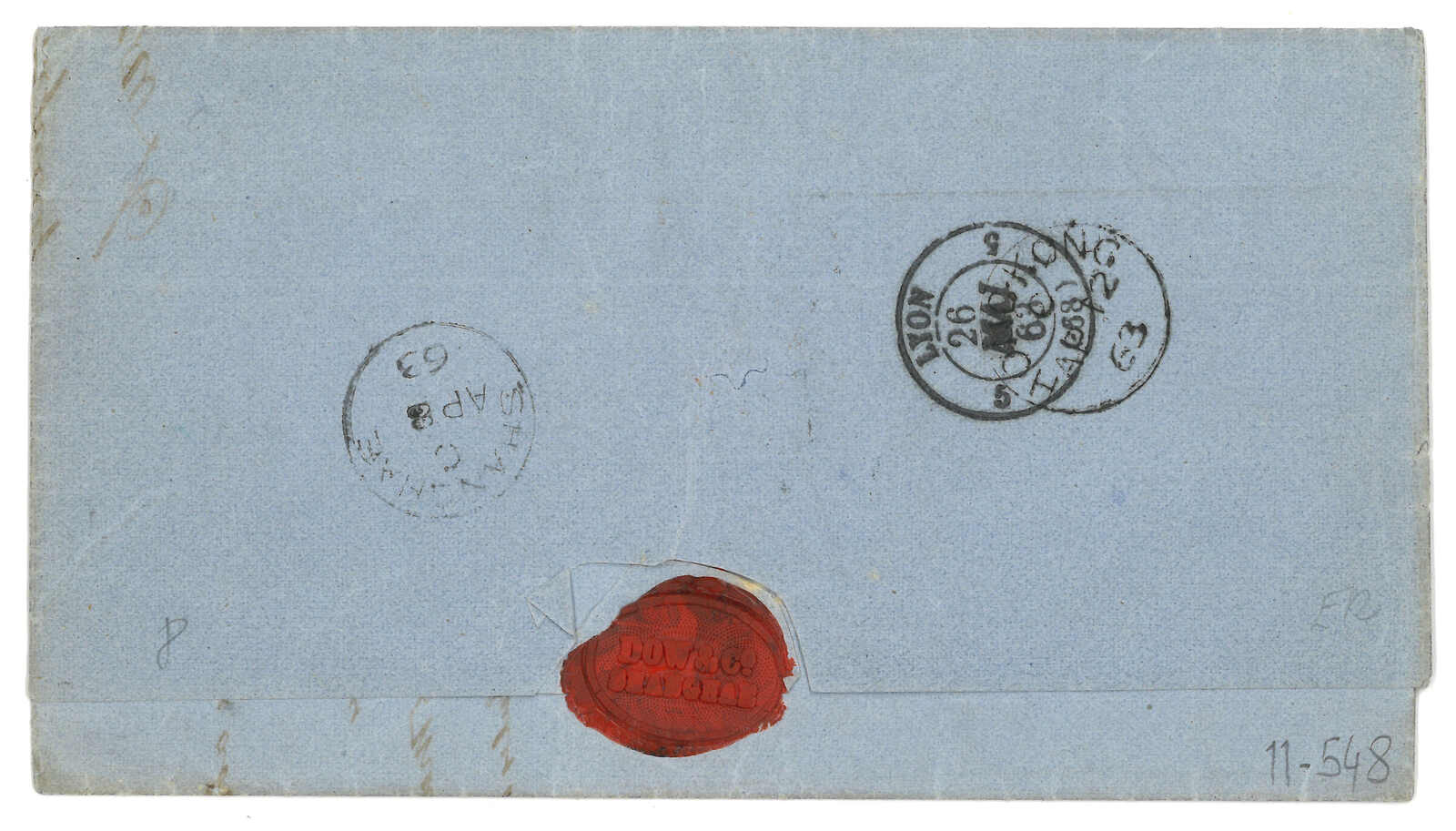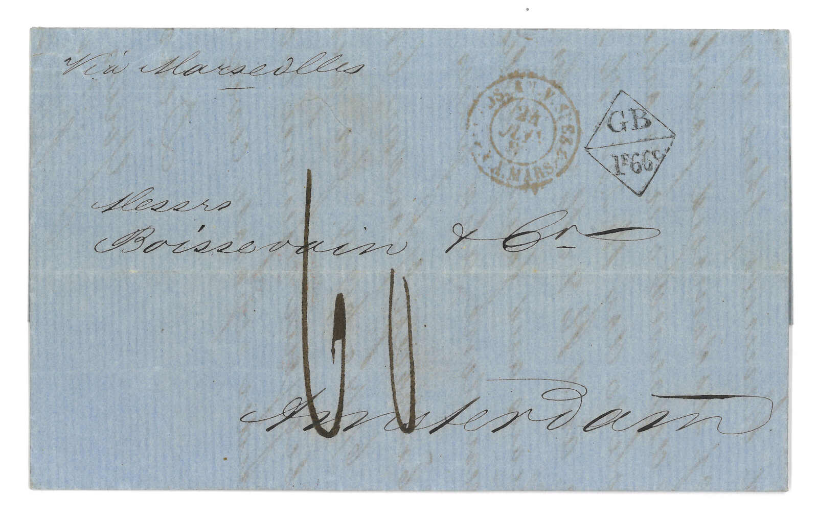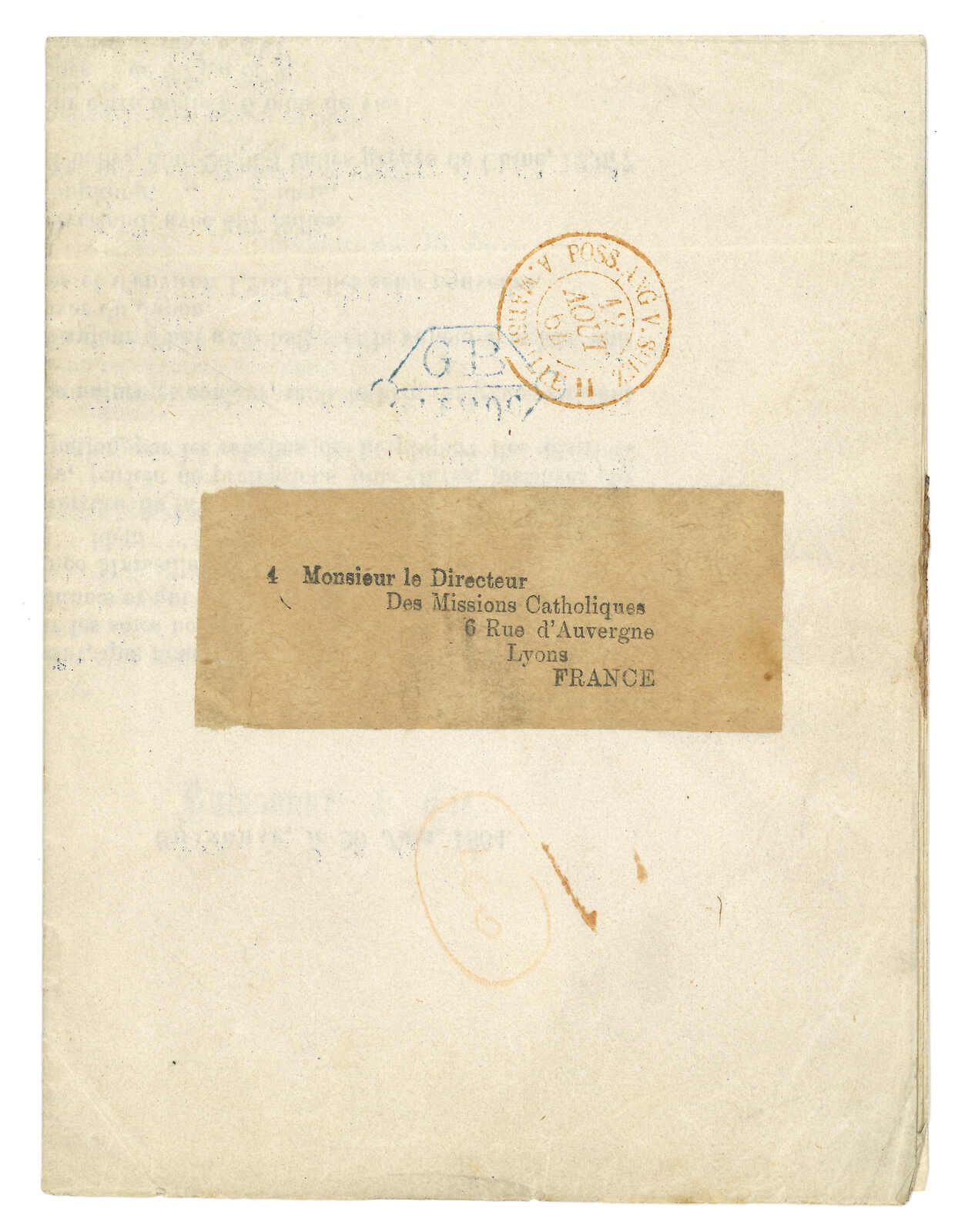 PAID”雙弧橙色圓戳,背鈐廣州英局2型雙弧日戳。經香港。Webb記錄之1型戳記例子僅數件。出色之早期廣州英局郵例。(Image 1)
