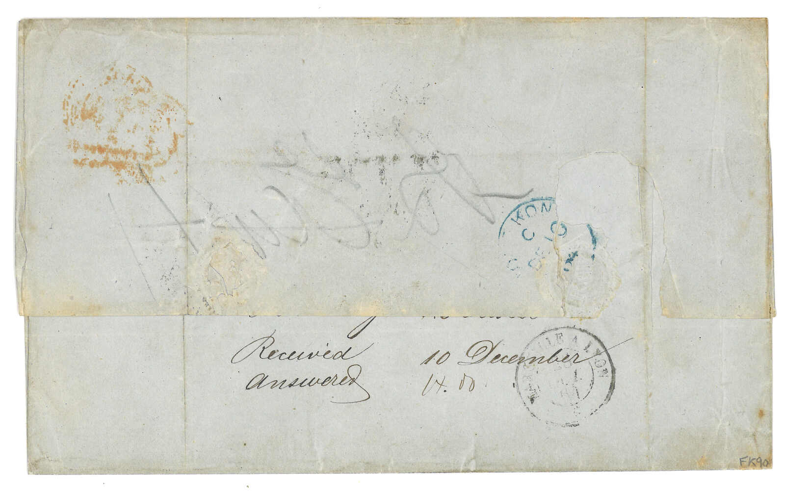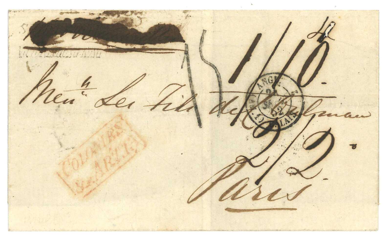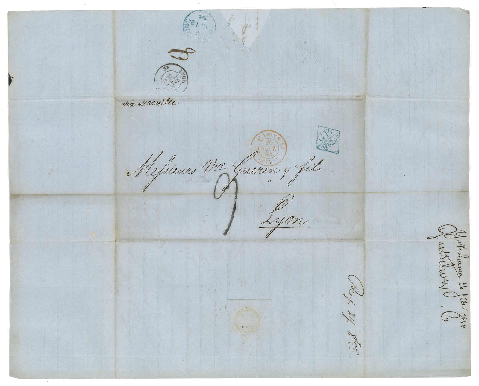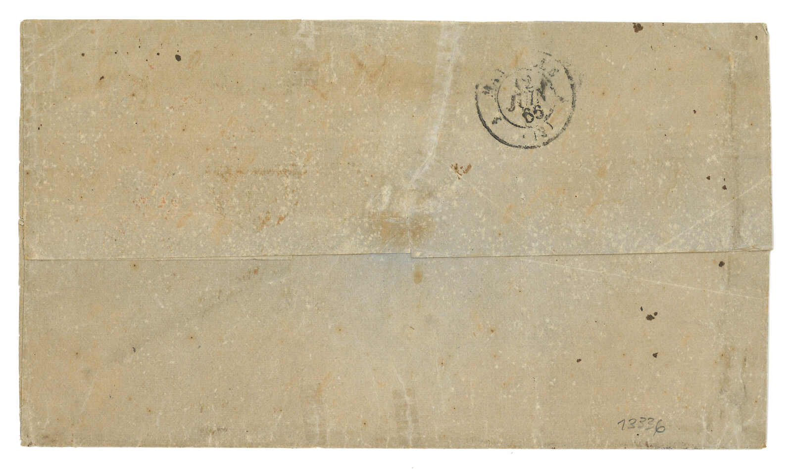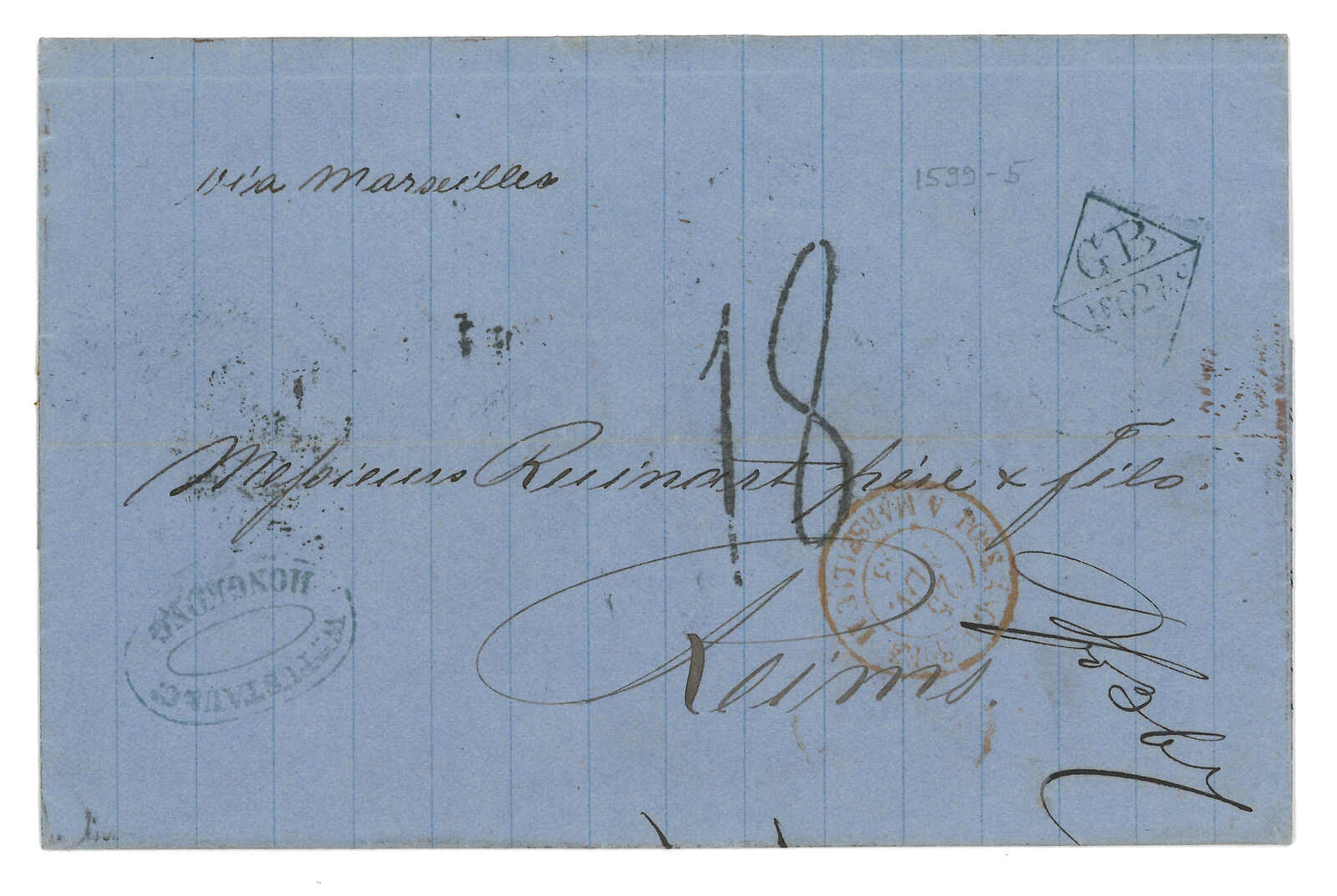 PAID”雙弧橙色圓戳,背鈐廣州英局2型雙弧日戳。經香港。Webb記錄之1型戳記例子僅數件。出色之早期廣州英局郵例。(Image 1)
