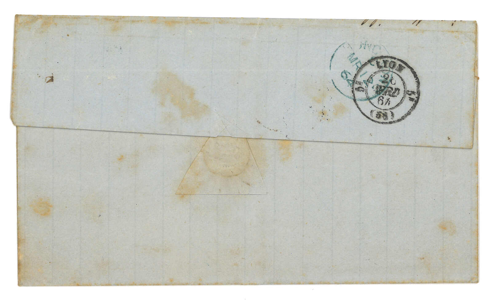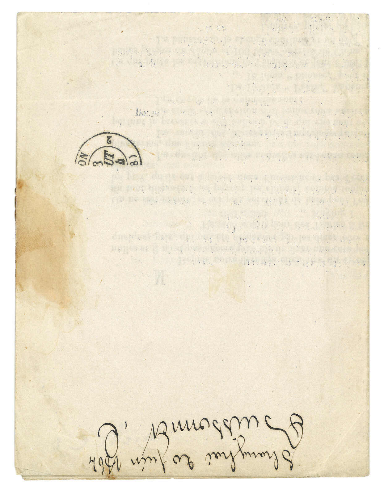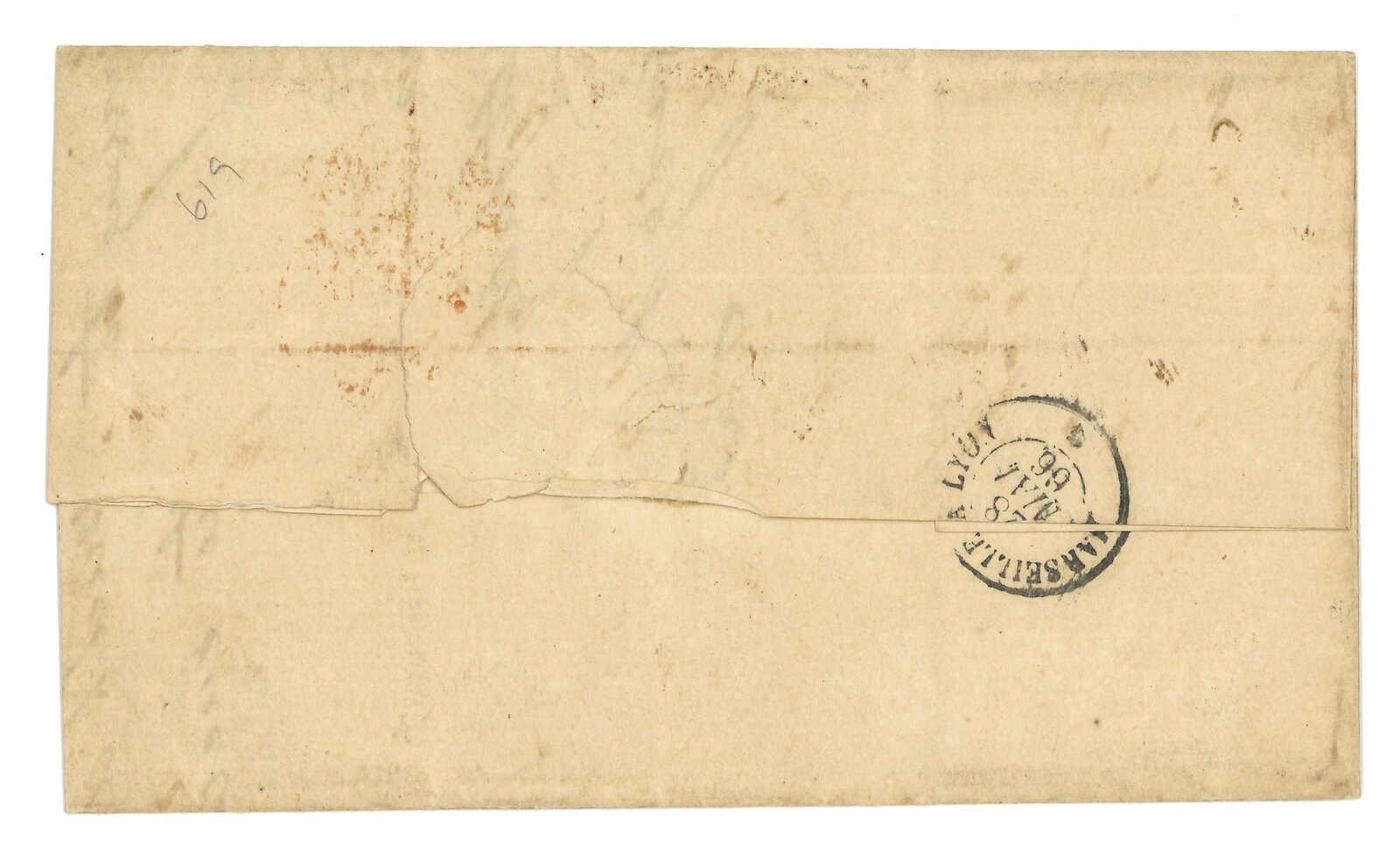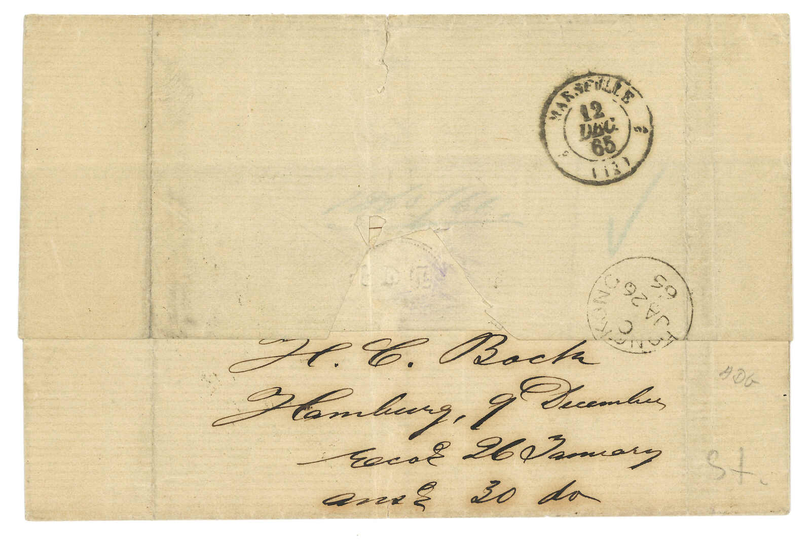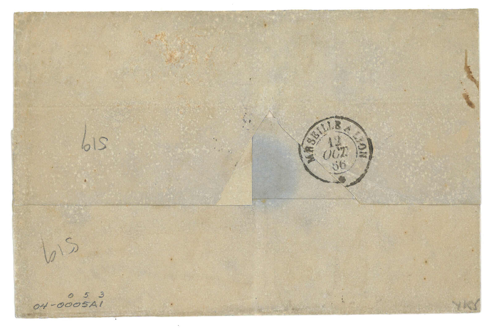 PAID”雙弧橙色圓戳,背鈐廣州英局2型雙弧日戳。經香港。Webb記錄之1型戳記例子僅數件。出色之早期廣州英局郵例。(Image 1)