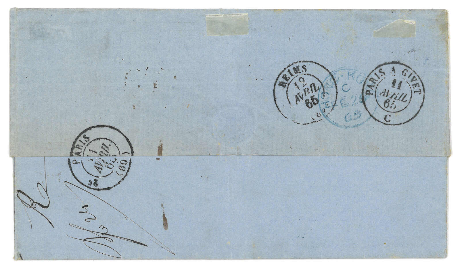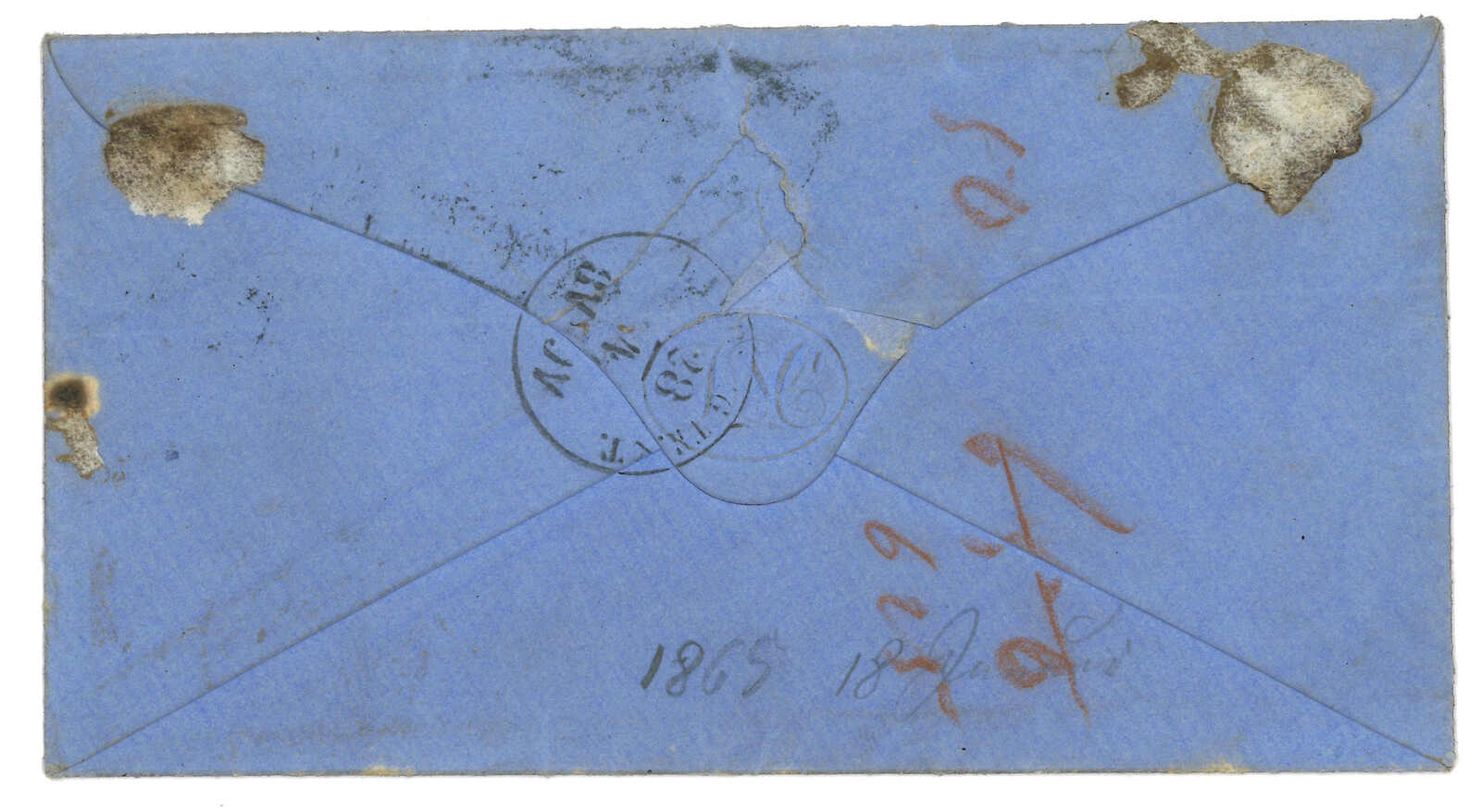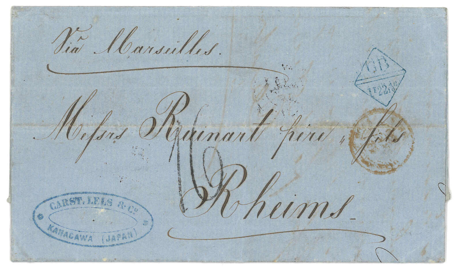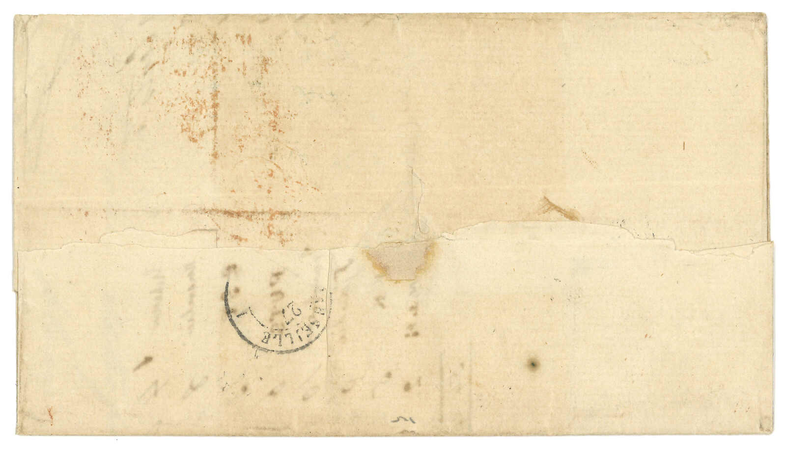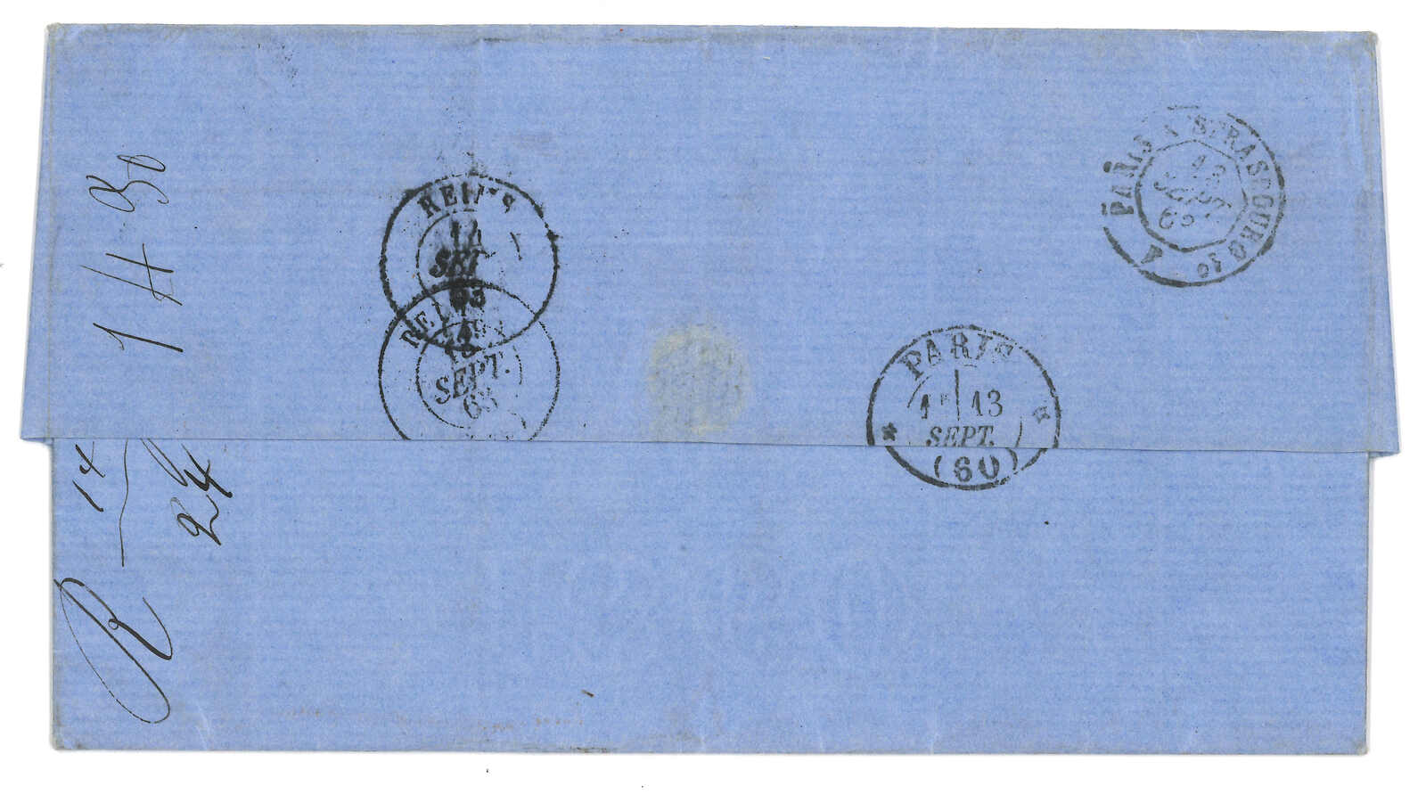 PAID”雙弧橙色圓戳,背鈐廣州英局2型雙弧日戳。經香港。Webb記錄之1型戳記例子僅數件。出色之早期廣州英局郵例。(Image 1)