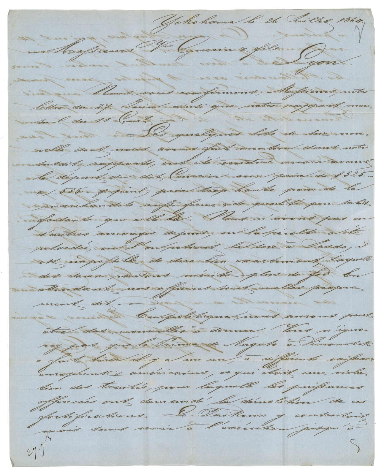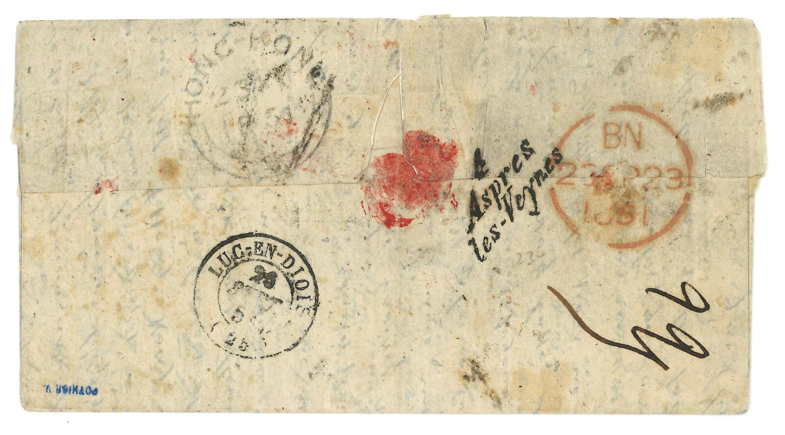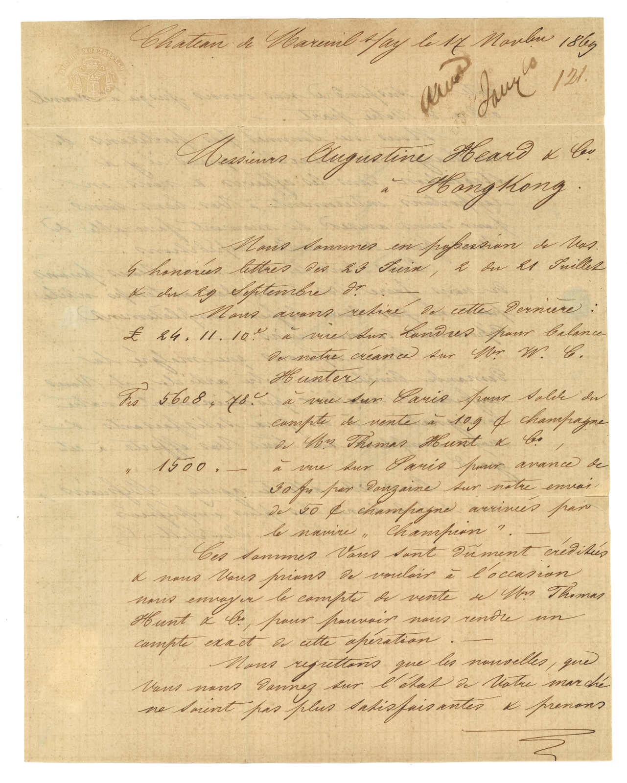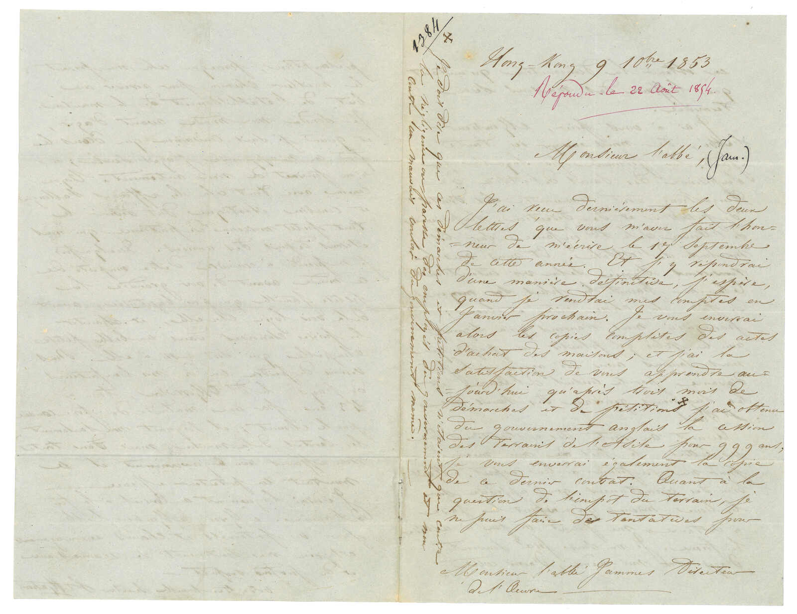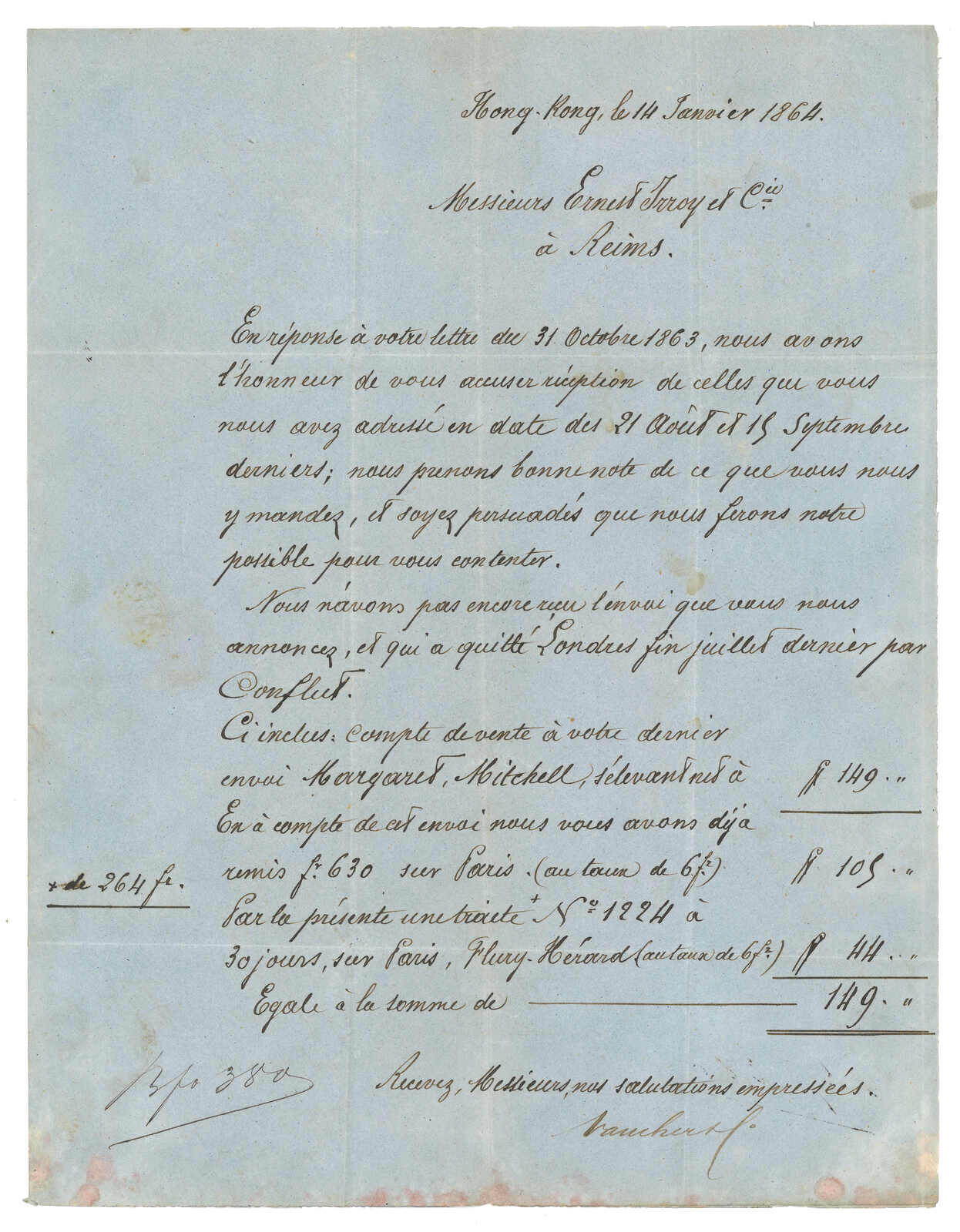 PAID”雙弧橙色圓戳,背鈐廣州英局2型雙弧日戳。經香港。Webb記錄之1型戳記例子僅數件。出色之早期廣州英局郵例。(Image 1)