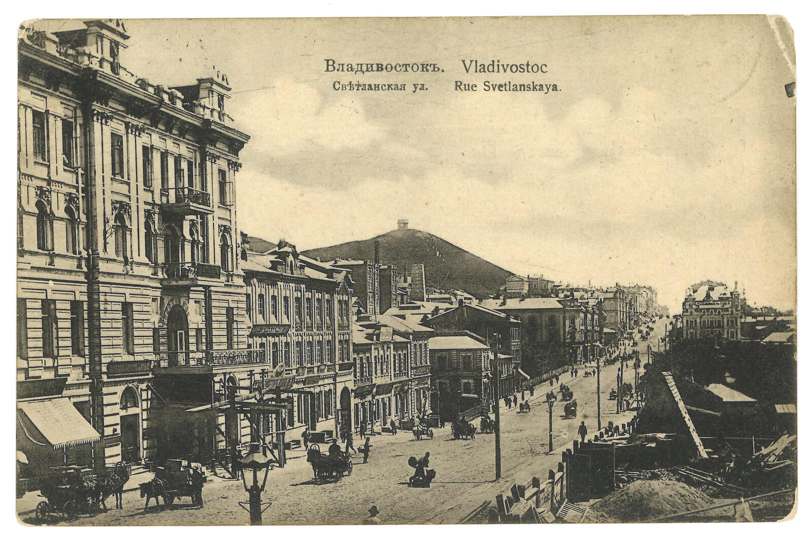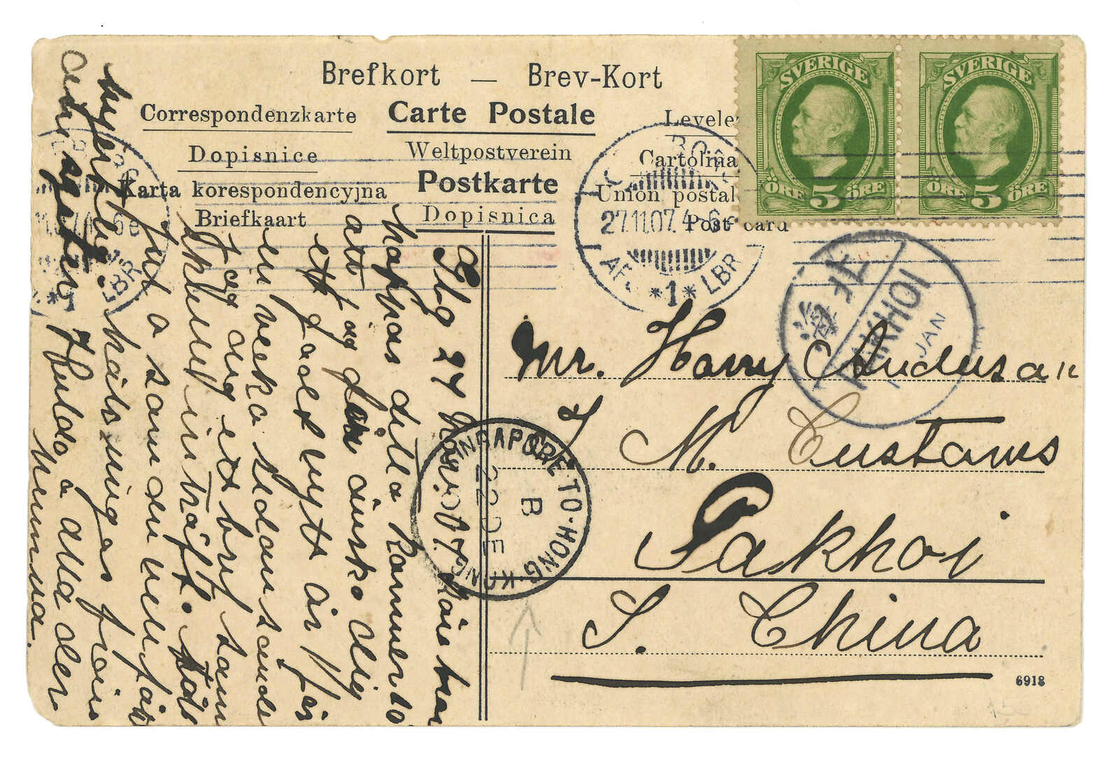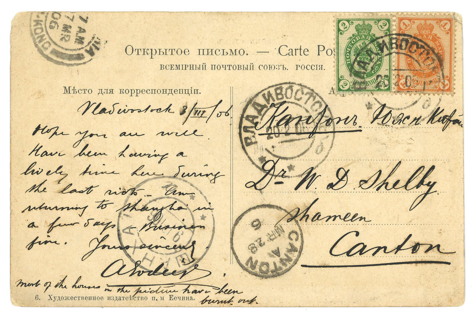 1906 Vladivostok (20 Feb) to Canton. Picture postcard, f.w. Coat of Arms 2k + 1k, tied by Vladivostok cds. Transit Shanghai Russian PO with T&S type 3 cds. Further transit Hong Kong (27 Mar). Arrived Canton BPO (28 Mar)