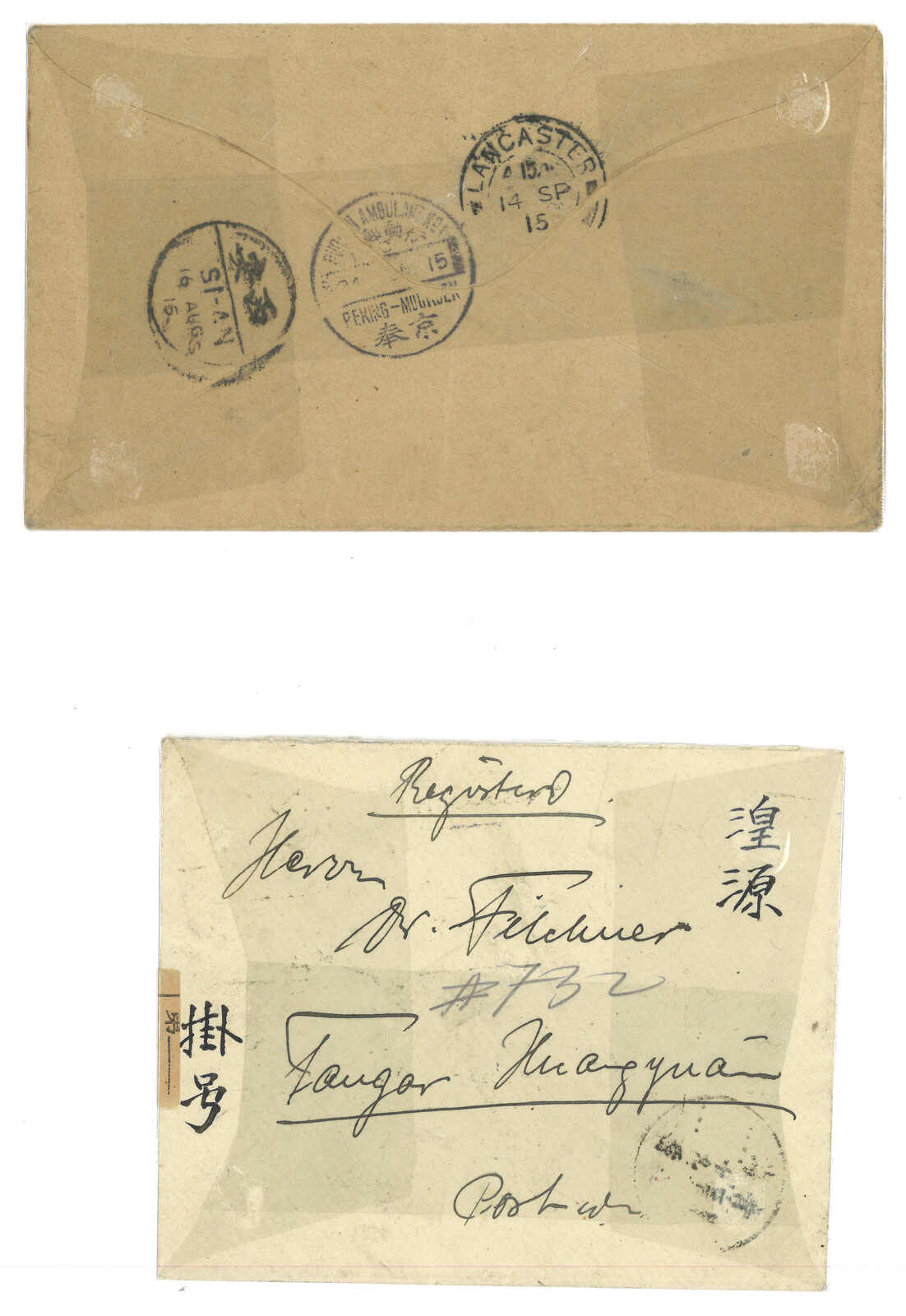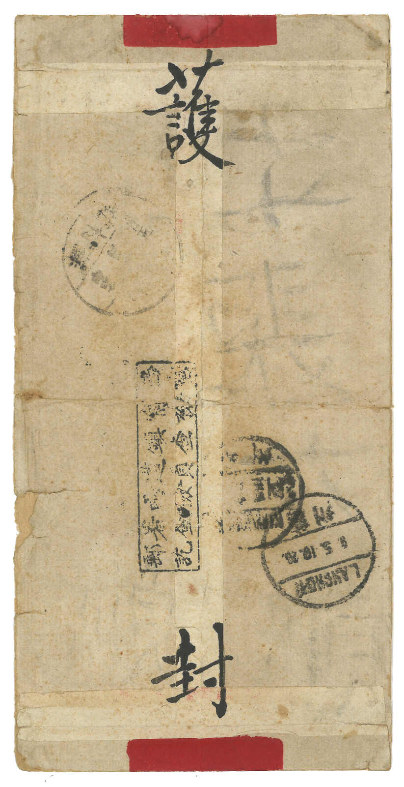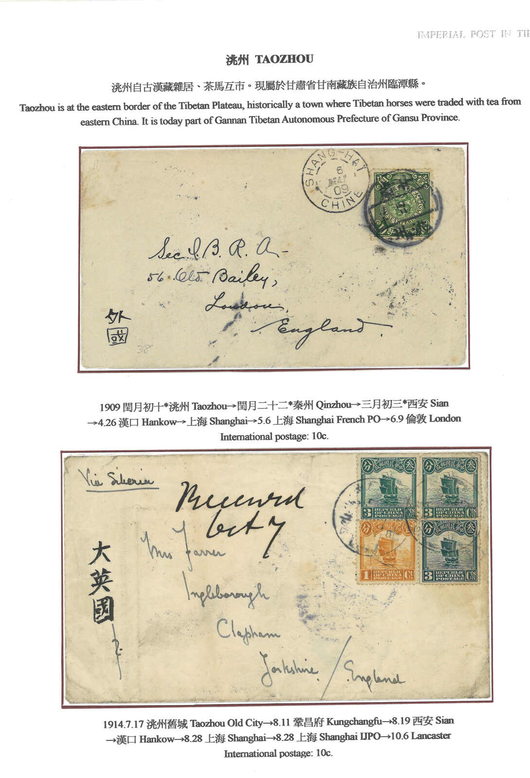 1914 Taochow (17 Jul) to England, f,w, Junk 1c + 3c x3, tied by Kansu / Taochow Old City cds. Transit Kungchangfu (11 Aug), Sian (19 Aug), Hankow, Shanghai Chinese PO and IJPO (28 Aug). Arrived Lancaster (6 Oct).