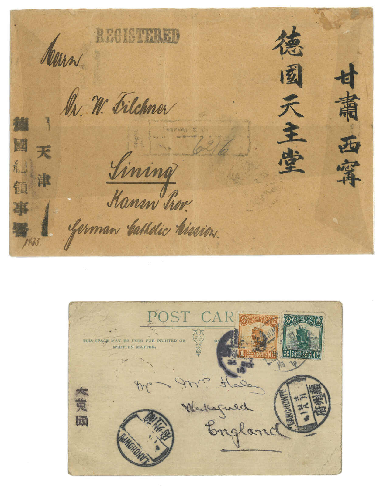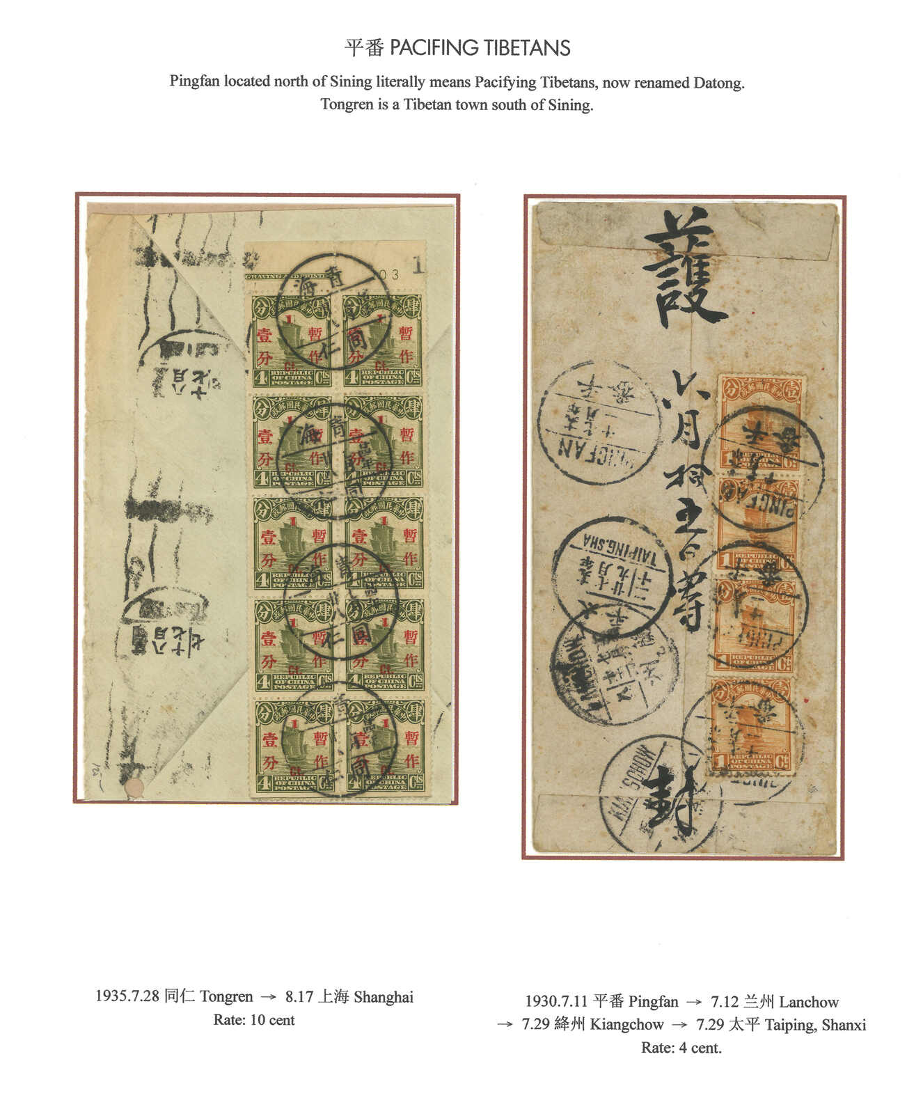 1935及1944年一對湟源寄美國封,貼孫像票,均為青海湟源6型三格點線日戳。丹噶爾於1930年代更名湟源。(Image 1)
