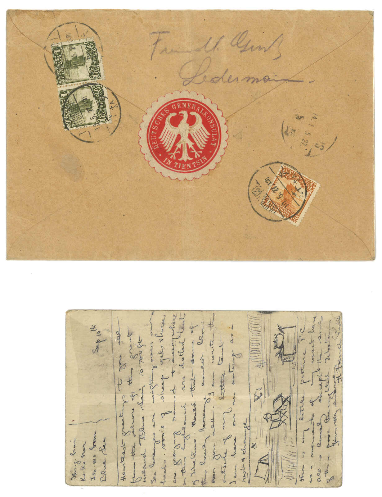 1914.西寧寄英國明信片,貼帆船票,9.10書于青海湖畔,銷12.5西寧日戳,内容十分生動:“我在青海湖畔向大家問候,這裏有成千的馬牛羊,藏民帳篷點點,我就在我的帳篷邊上給你們寫信,還畫了這張圖”。(Image 1)