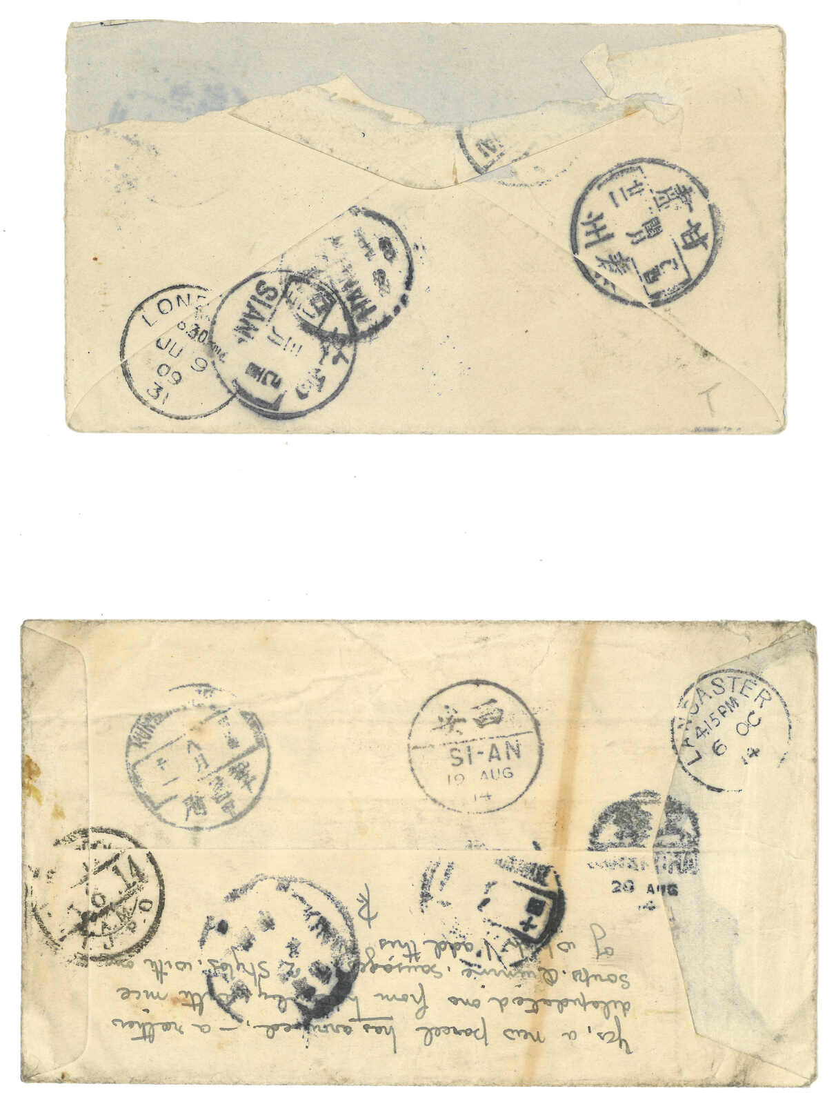 1914.7.17 洮州寄英國,貼帆船1分 + 3分x3,銷甘肅洮州舊城腰框日戳。8.11經鞏昌,8.19經西安,8.28經上海中國郵局及日本客郵局。10.6抵Lancaster。(Image 1)