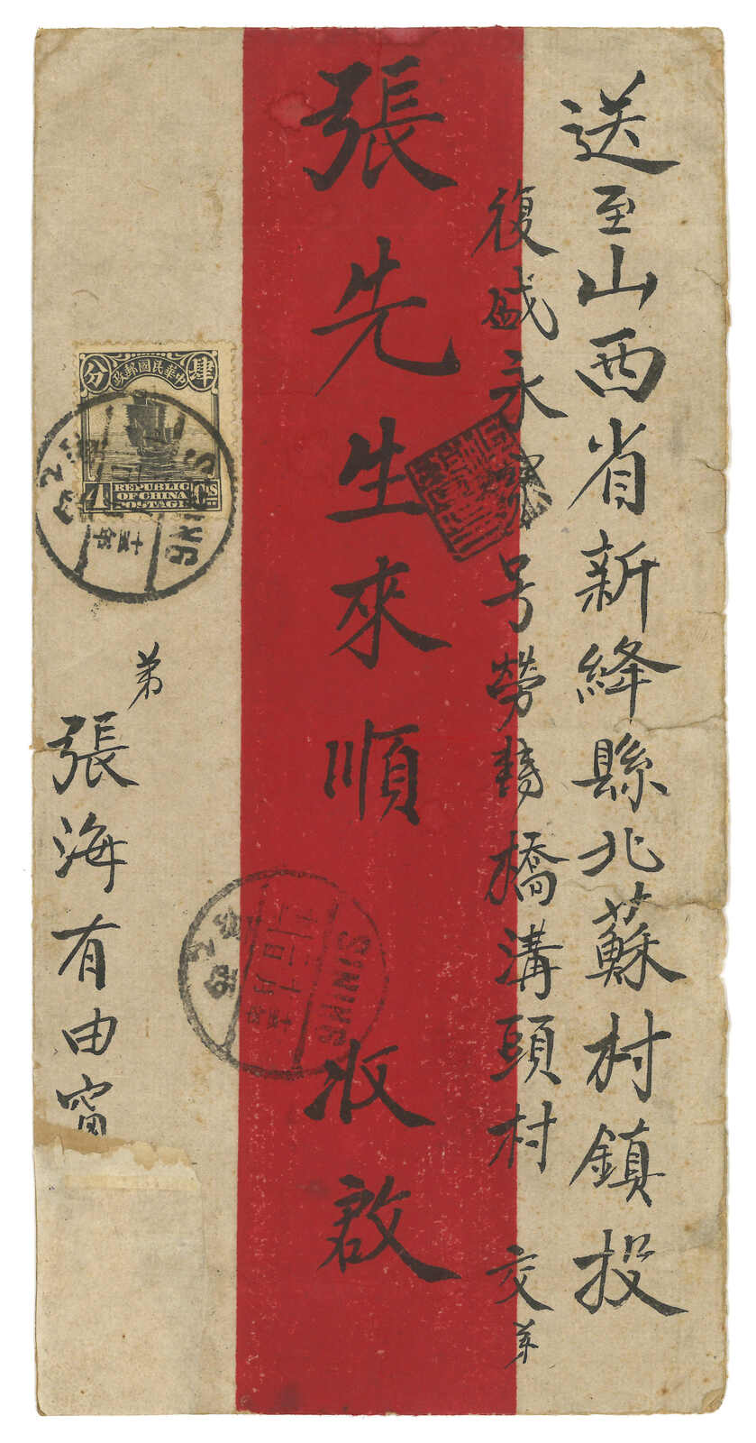 1927 a pair of domestic covers from Sining, f.w. Junk issues, tied by Sining cds. Both applied with "Support the Nationalist Government" slogan as Tsinghai was under the influence of General Feng Yuxiang with the advance of